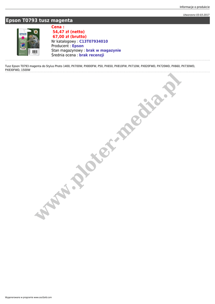Informacje o produkcie Utworzono 03-03-2017 Epson T0793 tusz magenta Cena : 54,47 zł (netto) 67,00 zł (brutto) Nr katalogowy : C13T07934010 Producent : Epson Stan magazynowy : brak w magazynie Średnia ocena : brak recenzji w w w .p lo t er - m ed i a. pl Tusz Epson T0793 magenta do Stylus Photo 1400, PX700W, PX800FW, P50, PX650, PX810FW, PX710W, PX820FWD, PX720WD, PX660, PX730WD, PX830FWD, 1500W Wygenerowano w programie www.oscGold.com