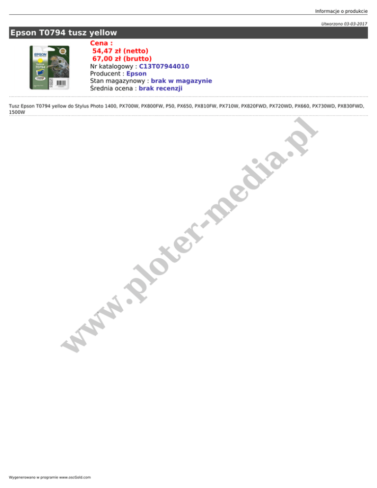 Informacje o produkcie Utworzono 03-03-2017 Epson T0794 tusz yellow Cena : 54,47 zł (netto) 67,00 zł (brutto) Nr katalogowy : C13T07944010 Producent : Epson Stan magazynowy : brak w magazynie Średnia ocena : brak recenzji w w w .p lo t er - m ed i a. pl Tusz Epson T0794 yellow do Stylus Photo 1400, PX700W, PX800FW, P50, PX650, PX810FW, PX710W, PX820FWD, PX720WD, PX660, PX730WD, PX830FWD, 1500W Wygenerowano w programie www.oscGold.com