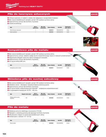 Piła do tworzywa sztucznych ■ ■ ■ ■ NOWOŚĆ Uchwyt wykonany w całości z metalu dla najlepszej w swojej klasie trwałości. Bez użycia dodatkowych narzędzi: ponad 10X szybsza wymiana ostrzy Ergonomiczny uchwyt dla komfortu trzymania Zwarta konstrukcja Ilość w opakowaniu Min. ilość zamówienia Numer Artykułu Kod EAN Sugerowana cena netto zł Piła do tworzyw sztucznych 1 1 48220212 045242467518 79,00 Ostrze wymienne 1 1 48220222 045242467532 42,00 Opis Kompaktowa piła do metalu ■ ■ ■ ■ ■ NOWOŚĆ Bez użycia dodatkowych narzędzi: ponad 10X szybsza wymiana ostrzy. Ergonomiczny uchwyt, idealnie nadaje się do wszechstronnego cięcia w ciasnych przestrzeniach. Regulowana długość ostrza do cięcia wystających krawędzi. Ergonomiczny uchwyt dla komfortu trzymania. Do użycia ostrza 300 mm. Opis Kompaktowa piła do metalu Ilość w opakowaniu Min. ilość zamówienia Numer Artykułu Kod EAN Sugerowana cena netto zł 1 1 48220012 045242204571 54,00 Składana piła do suchej zabudowy ■ ■ ■ ■ ■ NOWOŚĆ Bez użycia dodatkowych narzędzi: ponad 10X szybsza wymiana ostrzy Składane ostrze - łatwiejsze i bezpieczniejsze przechowywanie. Ergonomiczny uchwyt dla komfortu trzymania. Do użycia każdy rodzaj brzeszczotu Sawzall® - zwiększona wszechstronność. W wyposażeniu brzeszczot 18 TPi , 150 mm. Opis Składana piła do suchej zabudowy Długość ostrza (mm) Ilość w opakowaniu Min. ilość zamówienia Numer Artykułu Kod EAN Sugerowana cena netto zł 150 1 1 48220305 045242204618 75,00 Piła do metalu ■ ■ ■ ■ Metalowa rama do stabilnego mocowania (170 kN) Rękojeść z wstawką gumową dla lepszego komfortu trzymania Wbudowane miejsce na ostrza dla dodatkowych ostrzy Dostarczane z ostrzem 12˝ / 24 Tpi Opis Piła do metalu 164 NOWOŚĆ Ilość w opakowaniu Min. ilość zamówienia Numer Artykułu Kod EAN Sugerowana cena netto zł 1 1 48220050 045242362226 104,00