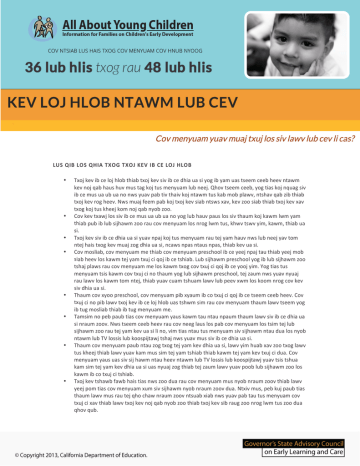 LUS QIB LOS QHIA TXOG TXOJ KEV IB CE LOJ HLOB • • • • • • • • Txoj kev ib ce loj hlob thiab txoj kev siv ib ce dhia ua si yog ib yam uas tseem ceeb heev ntawm kev noj qab haus huv mus tag koj tus menyuam lub neej. Qhov tseem ceeb, yog tias koj nquag siv ib ce mus ua ub ua no nws yuav pab tiv thaiv koj ntawm tus kab mob plawv, ntshav qab zib thiab txoj kev rog heev. Nws muaj feem pab koj txoj kev siab ntsws xav, kev zoo siab thiab txoj kev xav txog koj tus kheej kom noj qab nyob zoo. Cov kev txawj los siv ib ce mus ua ub ua no yog lub hauv paus los siv thaum koj kawm lwm yam thiab pub ib lub sijhawm zoo rau cov menyuam los nrog lwm tus, khwv tswv yim, kawm, thiab ua si. Txoj kev siv ib ce dhia ua si yuav npaj koj tus menyuam rau tej yam hauv nws lub neej yav tom ntej hais txog kev muaj zog dhia ua si, ncaws npas ntaus npas, thiab kev ua si. Cov mosliab, cov menyuam me thiab cov menyuam preschool ib ce yeej npaj tau thiab yeej mob siab heev los kawm tej yam txuj ci qoj ib ce tshiab. Lub sijhawm preschool yog ib lub sijhawm zoo tshaj plaws rau cov menyuam me los kawm txog cov txuj ci qoj ib ce yooj yim. Yog tias tus menyuam tsis kawm cov txuj ci no thaum yog lub sijhawm preschool, tej zaum nws yuav nyuaj rau lawv los kawm tom ntej, thiab yuav cuam tshuam lawv lub peev xwm los koom nrog cov kev siv dhia ua si. Thaum cov xyoo preschool, cov menyuam pib xyaum ib co txuj ci qoj ib ce tseem ceeb heev. Cov txuj ci no pib lawv txoj kev ib ce loj hlob uas tshwm sim rau cov menyuam thaum lawv tseem yog ib tug mosliab thiab ib tug menyuam me. Tamsim no peb paub tias cov menyuam yaus kawm tau ntau npaum thaum lawv siv ib ce dhia ua si nraum zoov. Nws tseem ceeb heev rau cov neeg laus los pab cov menyuam los tsim tej lub sijhawm zoo rau tej yam kev ua si li no, vim tias ntau tus menyuam siv sijhawm ntau dua los nyob ntawm lub TV lossis lub koospijtawj tshaj nws yuav mus siv ib ce dhia ua si. Thaum cov menyuam paub ntau zog txog tej yam kev dhia ua si, lawv yim huab xav zoo txog lawv tus kheej thiab lawv yuav kam mus sim tej yam tshiab thiab kawm tej yam kev txuj ci dua. Cov menyuam yaus uas siv sij hawm ntau heev ntawm lub TV lossis lub koospijtawj yuav tsis tshua kam sim tej yam kev dhia ua si uas nyuaj zog thiab tej zaum lawv yuav poob lub sijhawm zoo los kawm ib co txuj ci tshiab. Txoj kev tshawb fawb hais tias nws zoo dua rau cov menyuam mus nyob nraum zoov thiab lawv yeej pom tias cov menyuam xum siv sijhawm nyob nraum zoov dua. Ntxiv mus, peb kuj paub tias thaum lawv mus rau tej qho chaw nraum zoov ntsuab xiab nws yuav pab tau tus menyuam cov txuj ci xav thiab lawv txoj kev noj qab nyob zoo thiab txoj kev sib raug zoo nrog lwm tus zoo dua qhov qub. Kev Loj Hlob Ntawm Lub Cev Cov Lus Qhib Tej yam uas koj yuav pom nrog koj tus menyuam uas muaj plaub-‐xyoos: • Pom tias lawv lub cev khov tsis yoj. • Lub cev khov tsis yoj thaum nws sawv nrog ib txhais ko taw nrog rau lub cev khov tsis yoj thaum lawv nres tom qab lawv khiav. • Lub cev khov tsis yoj thaum lawv taug kev ntawm qhov ntug ntawm lub npov ntim av lossis thaum lawv ncav mus chwv lawv cov ntiv taw. • Taug kev nce taw ntaiv, ib sab ko taw ib tug taw ntaiv yam tsis thas tuav tus pas. • Taug kev ntawm ib txoj kab nyias nyias ntawm txoj kev taug ko taw, co ob txhais caj npab los pab kom nws tsis txhob vau. • Khiav nrog ob sab ko taw tiaj. • Khiav, tiamsis tej zaum yuav muaj teeb meem nres. • Dhia paj paws (khiav nrog ib sab ko taw nyob tom hau ntej). • Dhia kom chwv tau ib yam dabtsi siab. • Dhia tib plaws hau ntej nrog ob txhais ko taw. • Dhia li ib tug qav thaum nws zaum khoov. • Dhia saum ntug kev lossis ib qho chaw nce qis qis nrog ob txhais ko taw. • Dhia hau ntej nrog ib txhais ko taw. Cov lus los pab cov tsev neeg kom lawv txhawb tau lawv tus menyuam preschool txoj kev ib ce loj hlob: • Cov menyuam preschool yuav tsum muaj ntau lub sijhawm los txav mus los, khiav, nce, dhia thiab txawb khoom. Lawv nyiam nqa tej yam khoom hnyav thiab txuas cov blocks thiab lwm cov khoom. • Cov menyuam preschool nyiam nqa khoom mus los. Lawv nyiam nqa khoom thiab thawb khoom hauv cov laub, npov lossis tsheb truck. Cov menyuam yaus kuj nyiam nqa khoom, li ntawd lawv yuav nqa cov tawb me me lossis hnab tawv pojniam muaj hlua uas lawv yuav ntim tau khoom thiab nqa tau–cov thoob dej qhuav, lossis lwm yam khoom uas lawv nrhiav tau. • Cov menyuam yaus nyiam txuas khoom, muab ib qho tso saum toj ib qho thiab muab thawb kom vau, tiamsis lawv nyiam txuas tsev, cov kev, cov tsev loj, cov choj thiab lwm yam uas lawv siv tau thaum lawv ua si dag. Lawv yeej ua li no nrog txhua uas lawv nrhiav tau– kaus poom thiab npov ntawm lub txee, cov pas thiab cov nplooj nraum zoov, tej co ntoo me me tom lub khw muag ntoo, lossis tej xuv khoom ua si sib txuas blocks. Cov menyuam txoj kev siv yeeb yam los ua si txog tej yam xws li tsim ub no, khiav, mus nkaum, dhia thiab nqa ub no ua rau lawv muaj siab los xyaum lawv cov txwj siv lawv lub cev • Cov menyuam preschool kuj nyiam nce ub nce no, thiab tej tug yeej yuav nce txhua yam uas lawv pom (tog zaum, rooj, txee, rooj zaum, tog zaum ntev). ◦ Txiav txim seb qhov koj tus menyuam nce puas nyab xeeb thiab rov qhia rau lawv mus nce cov khoom ntawd xwb thaum lawv pib nce lwm yam. ◦ Koj siv tau daim pam txaj, cov hauv ncoo thiab tej yam qis rau tus menyuam nce thiab siv ua tsev. ◦ Cov chaw ua si rau menyuam nraum zoov pub ib sijhawm rau cov menyuam los nce, ib yam li ntej yam khoom nraum zoo li cov cav ntoo, pob zeb loj thiab roob. Koj thiab koj tus menyuam mus ncig tau koj lub zej zog rau tej qho chaw uas zoo nce. ◦ Qee zaus cov menyuam yuav poob thaum lawv nce ub nce no, thiab feem ntau lawv yeej yuav txhom tau lawv tus kheej thiab tsuas khawb mentsis tawv nqaij xwb. Cov kev lawv poob me me li no yuav pab lawv kawm. Feem ntau lawv yuav rov qab mus sim nce dua thiab lawv yuav ua tau vim tej yam uas lawv nyuam qhuav kawm zaum tag los. Thaum koj pom koj tus menyuam nce ub tej no, n
