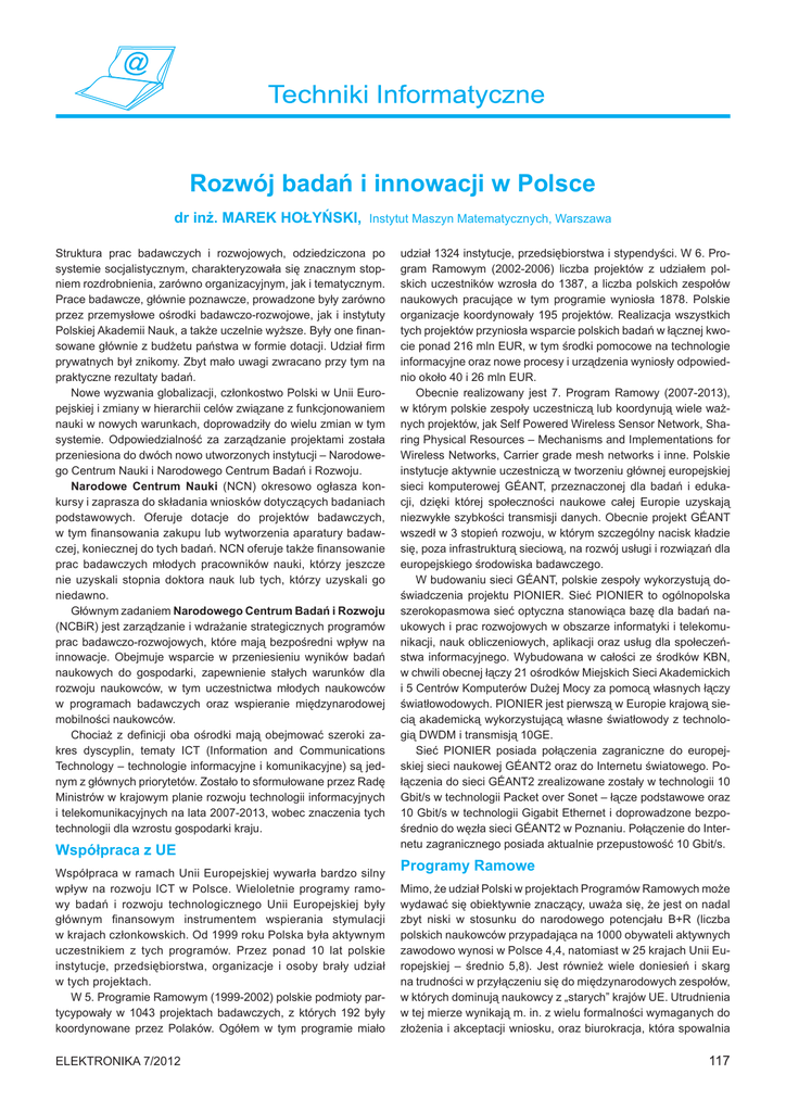 Rozwój badań i innowacji w Polsce dr inż. Marek Hołyński, Instytut Maszyn Matematycznych, Warszawa Struktura prac badawczych i rozwojowych, odziedziczona po systemie socjalistycznym, charakteryzowała się znacznym stopniem rozdrobnienia, zarówno organizacyjnym, jak i tematycznym. Prace badawcze, głównie poznawcze, prowadzone były zarówno przez przemysłowe ośrodki badawczo-rozwojowe, jak i instytuty Polskiej Akademii Nauk, a także uczelnie wyższe. Były one finansowane głównie z budżetu państwa w formie dotacji. Udział firm prywatnych był znikomy. Zbyt mało uwagi zwracano przy tym na praktyczne rezultaty badań. Nowe wyzwania globalizacji, członkostwo Polski w Unii Europejskiej i zmiany w hierarchii celów związane z funkcjonowaniem nauki w nowych warunkach, doprowadziły do wielu zmian w tym systemie. Odpowiedzialność za zarządzanie projektami została przeniesiona do dwóch nowo utworzonych instytucji – Narodowego Centrum Nauki i Narodowego Centrum Badań i Rozwoju. Narodowe Centrum Nauki (NCN) okresowo ogłasza konkursy i zaprasza do składania wniosków dotyczących badaniach podstawowych. Oferuje dotacje do projektów badawczych, w tym finansowania zakupu lub wytworzenia aparatury badawczej, koniecznej do tych badań. NCN oferuje także finansowanie prac badawczych młodych pracowników nauki, którzy jeszcze nie uzyskali stopnia doktora nauk lub tych, którzy uzyskali go niedawno. Głównym zadaniem Narodowego Centrum Badań i Rozwoju (NCBiR) jest zarządzanie i wdrażanie strategicznych programów prac badawczo-rozwojowych, które mają bezpośredni wpływ na innowacje. Obejmuje wsparcie w przeniesieniu wyników badań naukowych do gospodarki, zapewnienie stałych warunków dla rozwoju naukowców, w tym uczestnictwa młodych naukowców w programach badawczych oraz wspieranie międzynarodowej mobilności naukowców. Chociaż z definicji oba ośrodki mają obejmować szeroki zakres dyscyplin, tematy ICT (Information and Communications Technology – technologie informacyjne i komunikacyjne) są jednym z głównych priorytetów. Zostało to sformułowane przez Radę Ministrów w krajowym planie rozwoju technologii informacyjnych i telekomunikacyjnych na lata 2007-2013, wobec znaczenia tych technologii dla wzrostu gospodarki kraju. Współpraca z UE Współpraca w ramach Unii Europejskiej wywarła bardzo silny wpływ na rozwoju ICT w Polsce. Wieloletnie programy ramowy badań i rozwoju technologicznego Unii Europejskiej były głównym finansowym instrumentem wspierania stymulacji w krajach członkowskich. Od 1999 roku Polska była aktywnym uczestnikiem z tych programów. Przez ponad 10 lat polskie instytucje, przedsiębiorstwa, organizacje i osoby brały udział w tych projektach. W 5. Programie Ramowym (1999-2002) polskie podmioty partycypowały w 1043 projektach badawczych, z których 192 były koordynowane przez Polaków. Ogółem w tym programie miało Elektronika 7/2012 udział 1324 instytucje, przedsiębiorstwa i stypendyści. W 6. Program Ramowym (2002-2006) liczba projektów z udziałem polskich uczestników wzrosła do 1387, a liczba polskich zespołów naukowych pracujące w tym programie wyniosła 1878. Polskie organizacje koordynowały 195 projektów. Realizacja wszystkich tych projektów przyniosła wsparcie polskich badań w łącznej kwocie ponad 216 mln EUR, w tym środki pomocowe na technologie informacyjne oraz nowe procesy i urządzenia wyniosły odpowiednio około 40 i 26 mln EUR. Obecnie realizowany jest 7. Program Ramowy (2007-2013), w którym polskie zespoły uczestniczą lub koordynują wiele ważnych projektów, jak Self Powered Wireless Sensor Network, Sharing Physical Resources – Mechanisms and Implementations for Wireless Networks, Carrier grade mesh networks i inne. Polskie instytucje aktywnie uczestniczą w tworzeniu głównej europejskiej sieci komputerowej GÉANT, przeznaczonej dla badań i edukacji, dzięki której społeczności naukowe całej Europie uzyskają niezwykłe szybkości transmisji danych. Obecnie projekt GÉANT wszedł w 3 stopień rozwoju, w którym szczególny nacisk kładzie się, poza infrastrukturą sieciową, na rozwój usługi i rozwiązań dla europejskiego środowiska badawczego. W budowaniu sieci GÉANT, polskie zespoły wykorzystują doświadczenia projektu PIONIER. Sieć PIONIER to ogólnopolska szerokopasmowa sieć optyczna stanowiąca bazę dla badań naukowych i prac rozwojowych w obszarze informatyki i telekomunikacji, nauk obliczeniowych, aplikacji oraz usług dla społeczeństwa informacyjnego. Wybudowana w całości ze środków KBN, w chwili obecnej łączy 21 ośrodków Miejskich Sieci Akademickich i 5 Centrów Komputerów Dużej Mocy za pomocą własnych łączy światłowodowych. PIONIER jest pierwszą w Europie krajową siecią akademicką wykorzystującą własne światłowody z technologią DWDM i transmisją 10GE. Sieć PIONIER posiada połączenia zagraniczne do europejskiej sieci naukowej GÉANT2 oraz do Internetu światowego. Połączenia do sieci GÉANT2 zrealizowane zostały w technologii 10 Gbit/s w technologii Packet over Sonet – łącze podstawowe oraz 10 Gbit/s w technologii Gigabit Ethernet i doprowadzone bezpośrednio do węzła sieci GÉANT2 w Poznaniu. Połączenie do Internetu zagranicznego posiada aktualnie przepustowość 10 Gbit/s. Programy Ramowe Mimo, że udział Polski w projektach Programów Ramowych może wydawać się obiektywnie znaczący, uważa się, że jest on nadal zbyt niski w stosunku do narodowego potencjału B+R (liczba polskich naukowców przypadająca na 1000 obywateli aktywnych zawodowo wynosi w Polsce 4,4, natomiast w 25 krajach Unii Europejskiej – średnio 5,8). Jest również wiele doniesień i skarg na trudności w przyłączeniu się do międzynarodowych zespołów, w których dominują naukowcy z „starych” krajów UE. Utrudnienia w tej mierze wynikają m. in. z wielu formalności wymaganych do złożenia i akceptacji wniosku, oraz b