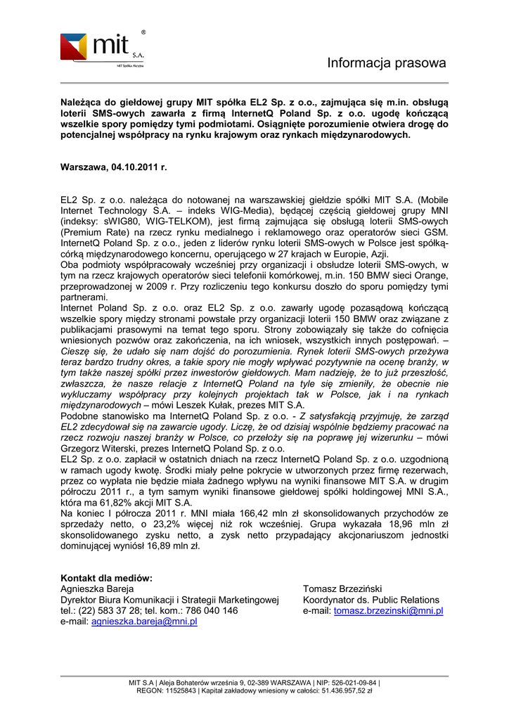 Informacja prasowa Należąca do giełdowej grupy MIT spółka EL2 Sp. z o.o., zajmująca się m.in. obsługą loterii SMS-owych zawarła z firmą InternetQ Poland Sp. z o.o. ugodę kończącą wszelkie spory pomiędzy tymi podmiotami. Osiągnięte porozumienie otwiera drogę do potencjalnej współpracy na rynku krajowym oraz rynkach międzynarodowych. Warszawa, 04.10.2011 r. EL2 Sp. z o.o. należąca do notowanej na warszawskiej giełdzie spółki MIT S.A. (Mobile Internet Technology S.A. – indeks WIG-Media), będącej częścią giełdowej grupy MNI (indeksy: sWIG80, WIG-TELKOM), jest firmą zajmująca się obsługą loterii SMS-owych (Premium Rate) na rzecz rynku medialnego i reklamowego oraz operatorów sieci GSM. InternetQ Poland Sp. z o.o., jeden z liderów rynku loterii SMS-owych w Polsce jest spółkącórką międzynarodowego koncernu, operującego w 27 krajach w Europie, Azji. Oba podmioty współpracowały wcześniej przy organizacji i obsłudze loterii SMS-owych, w tym na rzecz krajowych operatorów sieci telefonii komórkowej, m.in. 150 BMW sieci Orange, przeprowadzonej w 2009 r. Przy rozliczeniu tego konkursu doszło do sporu pomiędzy tymi partnerami. Internet Poland Sp. z o.o. oraz EL2 Sp. z o.o. zawarły ugodę pozasądową kończącą wszelkie spory między stronami powstałe przy organizacji loterii 150 BMW oraz związane z publikacjami prasowymi na temat tego sporu. Strony zobowiązały się także do cofnięcia wniesionych pozwów oraz zakończenia, na ich wniosek, wszystkich innych postępowań. – Cieszę się, że udało się nam dojść do porozumienia. Rynek loterii SMS-owych przeżywa teraz bardzo trudny okres, a takie spory nie mogły wpływać pozytywnie na ocenę branży, w tym także naszej spółki przez inwestorów giełdowych. Mam nadzieję, że to już przeszłość, zwłaszcza, że nasze relacje z InternetQ Poland na tyle się zmieniły, że obecnie nie wykluczamy współpracy przy kolejnych projektach tak w Polsce, jak i na rynkach międzynarodowych – mówi Leszek Kułak, prezes MIT S.A. Podobne stanowisko ma InternetQ Poland Sp. z o.o. - Z satysfakcją przyjmuję, że zarząd EL2 zdecydował się na zawarcie ugody. Liczę, że od dzisiaj wspólnie będziemy pracować na rzecz rozwoju naszej branży w Polsce, co przełoży się na poprawę jej wizerunku – mówi Grzegorz Witerski, prezes InternetQ Poland Sp. z o.o. EL2 Sp. z o.o. zapłacił w ostatnich dniach na rzecz InternetQ Poland Sp. z o.o. uzgodnioną w ramach ugody kwotę. Środki miały pełne pokrycie w utworzonych przez firmę rezerwach, przez co wypłata nie będzie miała żadnego wpływu na wyniki finansowe MIT S.A. w drugim półroczu 2011 r., a tym samym wyniki finansowe giełdowej spółki holdingowej MNI S.A., która ma 61,82% akcji MIT S.A. Na koniec I półrocza 2011 r. MNI miała 166,42 mln zł skonsolidowanych przychodów ze sprzedaży netto, o 23,2% więcej niż rok wcześniej. Grupa wykazała 18,96 mln zł skonsolidowanego zysku netto, a zysk netto przypadający akcjonariuszom jednostki dominującej wyniósł 16,89 mln zł. Kontakt dla mediów: Agnieszka Bareja Dyrektor Biura Komunikacji i Strategii Marketingowej tel.: (22) 583 37 28; tel. kom.: 786 040 146 e-mail: [email protected] Tomasz Brzeziński Koordynator ds. Public Relations e-mail: [email protected] MIT S.A | Aleja Bohaterów września 9, 02-389 WARSZAWA | NIP: 526-021-09-84 | REGON: 11525843 | Kapitał zakładowy wniesiony w całości: 51.436.957,52 zł