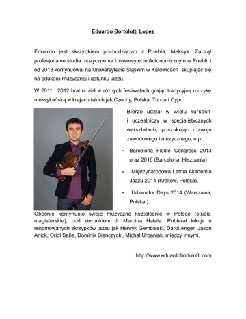 Eduardo Bortolotti Lopez Eduardo jest skrzypkiem pochodzącym z Puebla, Meksyk. Zaczął profesjonalne studia muzyczne na Uniwersytecie Autonomicznym w Puebli, i od 2013 kontynuował na Uniwersytecie Śląskim w Katowicach skupiając się na edukacji muzycznej i gatunku jazzu. W 2011 i 2012 brał udział w różnych festiwalach grając tradycyjną muzykę meksykańską w krajach takich jak Czechy, Polska, Turcja i Cypr. Bierze udział w wielu kursach i uczestniczy w specjalistycznych warsztatach, poszukując rozwoju zawodowego i muzycznego, n.p.: • Barcelona Fiddle Congress 2013 oraz 2016 (Barcelona, Hiszpania) • Międzynarodowa Letnia Akademia Jazzu 2014 (Kraków, Polska), • Urbanator Days 2014 (Warszawa, Polska ). Obecnie kontynuuje swoje muzyczne kształcenie w Polsce (studia magisterskie), pod kierunkiem dr Marcina Hałata. Pobierał lekcje u renomowanych skrzypków jazzu jak Henryk Gembalski, Darol Anger, Jason Anick, Oriol Saña, Dominik Bienczycki, Michał Urbaniak, między innymi. http://www.eduardobortolotti.com