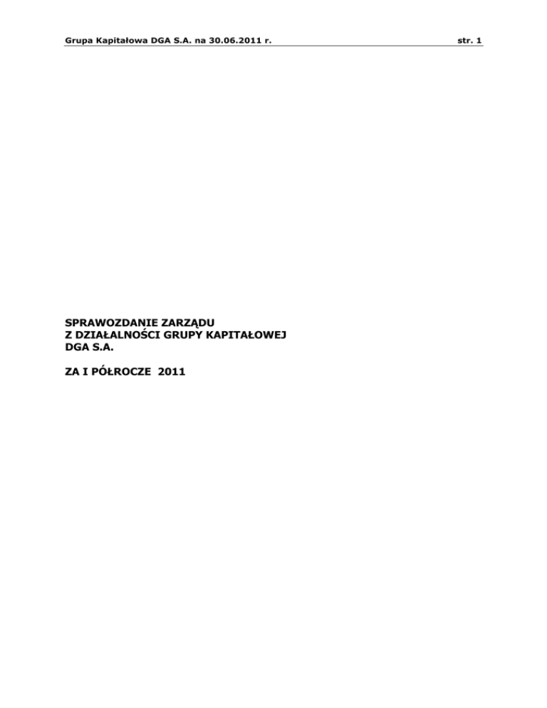 Grupa Kapitałowa DGA S.A. na 30.06.2011 r. SPRAWOZDANIE ZARZĄDU Z DZIAŁALNOŚCI GRUPY KAPITAŁOWEJ DGA S.A. ZA I PÓŁROCZE 2011 str. 1 Grupa Kapitałowa DGA S.A. na 30.06.2011 r. SPIS TREŚCI I. II. III. IV. str. 2 str. KALENDARIUM NAJWAŻNIEJSZYCH WYDARZEŃ W I PÓŁROCZU 2011 ROKU ............................................... 3 ISTOTNE CZYNNIKI I ZDARZENIA MAJĄCE WPŁYW NA OSIĄGNIĘTE WYNIKI FINANSOWE................................. 3 OPIS ISTOTNYCH DOKONAŃ GRUPY KAPITAŁOWEJ DGA W I PÓŁROCZU 2011 ......................................... 4 WSKAZANIE CZYNNIKÓW, KTÓRE W OCENIE EMITENTA BĘDĄ MIAŁY WPŁYW NA OSIĄGNIĘTE PRZEZ NIEGO WYNIKI W PERSPEKTYWIE, CO NAJMNIEJ KOLEJNEGO PÓŁROCZA .................................................................... 8 1. ZDARZENIA, KTÓRE WYSTĄPIŁY PO DNIU, NA KTÓRY SPORZĄDZONO DANE FINANSOWE ZA I PÓŁROCZE 2011 R. ................................................................................................................................. 8 2. PROGRAM INWESTYCYJNY ..........................................................................................................10 3. ISTOTNE CZYNNIKI RYZYKA I ZAGROŻEŃ ........................................................................................10 V. RYNEK I OFEROWANE USŁUGI .....................................................................................................14 1. OPIS DZIAŁALNOŚCI PODMIOTÓW WCHODZĄCYCH W SKŁAD GRUPY KAPITAŁOWEJ DGA S.A. ......................14 VI. WYNIKI FINANSOWE ................................................................................................................27 1. SPÓŁKI WCHODZĄCE W SKŁAD GRUPY DGA....................................................................................27 2. SPRAWOZDANIE Z PEŁNEGO DOCHODU GRUPY DGA .........................................................................28 2.1. WYNIKI NA SEGMENTACH BRANŻOWYCH ........................................................................................30 3. BILANS GRUPY DGA ................................................................................................................32 4. PRZEPŁYWY ŚRODKÓW PIENIĘŻNYCH GRUPY DGA ...........................................................................35 5. WYBRANE WSKAŹNIKI FINANSOWE ...............................................................................................36 6. SYTUACJA KADROWA ................................................................................................................37 VII. INFORMACJE UZUPEŁNIAJĄCE ......................................................................................................38 1. SKUTEK ZMIAN W STRUKTURZE GOSPODARCZEJ, W TYM W WYNIKU POŁĄCZENIA JEDNOSTEK GOSPODARCZYCH, PRZEJĘCIA LUB SPRZEDAŻY JEDNOSTEK GRUPY KAPITAŁOWEJ DGA S.A., INWESTYCJI DŁUGOTERMINOWYCH, PODZIAŁU, RESTRUKTURYZACJI I ZANIECHANIA DZIAŁALNOŚCI. .......................................38 2. CYKLICZNOŚĆ, SEZONOWOŚĆ DZIAŁALNOŚCI...................................................................................39 3. INFORMACJA DOTYCZĄCE EMISJI, WYKUPU I SPŁATY NIEUDZIAŁOWYCH I KAPITAŁOWYCH PAPIERÓW WARTOŚCIOWYCH ...........................................................................................................................39 4. INFORMACJE DOTYCZĄCE WYPŁACONEJ (LUB ZADEKLAROWANEJ) DYWIDENDY ..........................................40 5. STANOWISKO ZARZĄDU ODNOŚNIE MOŻLIWOŚCI ZREALIZOWANIA WCZEŚNIEJ PUBLIKOWANYCH PROGNOZ.......40 6. WSKAZANIE ZNACZĄCYCH AKCJONARIUSZY, ZMIAN W STRUKTURZE WŁASNOŚCI ZNACZNYCH PAKIETÓW AKCJI ................................................................................................................................40 7. ZESTAWIENIE STANU POSIADANIA AKCJI DGA S.A. LUB UPRAWNIEŃ DO NICH (OPCJI) PRZEZ OSOBY ZARZĄDZAJĄCE I NADZORUJĄCE NA DZIEŃ PRZEKAZANIA RAPORTU, ZGODNIE Z POSIADANYMI PRZEZ DGA S.A. INFORMACJAMI. ZMIANY W STANIE POSIADANIA W OKRESIE OD PRZEKAZANIA POPRZEDNIEGO RAPORTU. ................41 8. WSKAZANIE ISTOTNYCH POSTĘPOWAŃ SĄDOWYCH ...........................................................................41 9. INFORMACJE O ISTOTNYCH TRANSAKCJACH Z PODMIOTAMI POWIĄZANYMI ZAWARTYCH NA WARUNKACH INNYCH NIŻ RYNKOWE ......................................................................................................................41 10. INFORMACJE O UDZIELENIU PORĘCZEŃ KREDYTU LUB POŻYCZKI LUB UDZIELENIU GWARANCJI .......................41 11. POZYCJE WARUNKOWE..............................................................................................................42 12. INNE INFORMACJE, KTÓRE ZDANIEM DGA S.A. SĄ ISTOTNE DLA OCENY SYTUACJI KADROWEJ, MAJĄTKOWEJ, FINANSOWEJ, WYNIKU FINANSOWEGO I ICH ZMIAN ORAZ INFORMACJE, KTÓRE SĄ ISTOTNE DLA OCENY MOŻLIWOŚCI REALIZACJI ZOBOWIĄZAŃ ........................................................................................42 Grupa Kapitałowa DGA S.A. na 30.06.2011 r. I. str. 3 KALENDARIUM NAJWAŻNIEJSZYCH WYDARZEŃ W I PÓŁROCZU 2011 ROKU STYCZEŃ • DGA Kancelaria Rachunkowa Sp. z o.o. należąca do Grupy Kapitałowej DGA, zmieniła nazwę na FIGURES Kancelaria Rachunkowa Sp. z o.o. LUTY • Objęcie udziałów i podwyższenie kapitału zakładowego w Alekiedy.pl Sp. z o.o.; w wyniku przeprowadzonych transakcji bezpośredni udział DGA S.A. stanowi 31,75% kapitału zakładowego Alekiedy.pl, natomiast łącznie bezpośrednio i pośrednio - poprzez DGA Fast Deal Sp. z o.o. - DGA S.A. posiada 49,09% udział (stan na dzień 31.08.2011). MARZEC • Publikacja wyników za 2010 rok. • Wybór przez Radę Nadzorczą DGA firmy BDO Sp. z o.o. do badania sprawozdań finansowych za lata 2011 – 2012. • Zbycie udziałów w DGA Amber Sp. z o.o. • Złożenie do Sądu Okręgowego w Warszawie pozwu o zapłatę należności w wysokości 3,7 mln zł wraz z odsetkami przeciwko Agencji Rozwoju Przemysłu S
