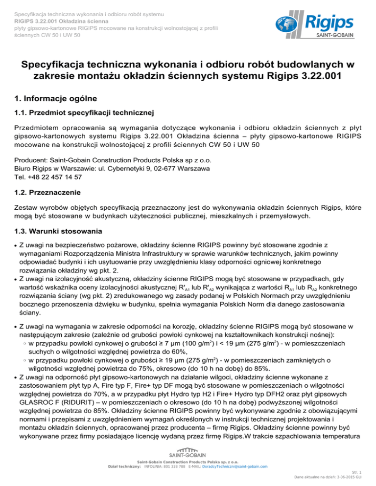 Specyfikacja techniczna wykonania i odbioru robót systemu RIGIPS 3.22.001 Okładzina ścienna płyty gipsowo-kartonowe RIGIPS mocowane na konstrukcji wolnostojącej z profili ściennych CW 50 i UW 50 Specyfikacja techniczna wykonania i odbioru robót budowlanych w zakresie montażu okładzin ściennych systemu Rigips 3.22.001 1. Informacje ogólne 1.1. Przedmiot specyfikacji technicznej Przedmiotem opracowania są wymagania dotyczące wykonania i odbioru okładzin ściennych z płyt gipsowo-kartonowych systemu Rigips 3.22.001 Okładzina ścienna – płyty gipsowo-kartonowe RIGIPS mocowane na konstrukcji wolnostojącej z profili ściennych CW 50 i UW 50 Producent: Saint-Gobain Construction Products Polska sp z o.o. Biuro Rigips w Warszawie: ul. Cybernetyki 9, 02-677 Warszawa Tel. +48 22 457 14 57 1.2. Przeznaczenie Zestaw wyrobów objętych specyfikacją przeznaczony jest do wykonywania okładzin ściennych Rigips, które mogą być stosowane w budynkach użyteczności publicznej, mieszkalnych i przemysłowych. 1.3. Warunki stosowania ● ● ● Z uwagi na bezpieczeństwo pożarowe, okładziny ścienne RIGIPS powinny być stosowane zgodnie z wymaganiami Rozporządzenia Ministra Infrastruktury w sprawie warunków technicznych, jakim powinny odpowiadać budynki i ich usytuowanie przy uwzględnieniu klasy odporności ogniowej konkretnego rozwiązania okładziny wg pkt. 2. Z uwagi na izolacyjność akustyczną, okładziny ścienne RIGIPS mogą być stosowane w przypadkach, gdy wartość wskaźnika oceny izolacyjności akustycznej R'A1 lub R'A2 wynikająca z wartości RA1 lub RA2 konkretnego rozwiązania ściany (wg pkt. 2) zredukowanego wg zasady podanej w Polskich Normach przy uwzględnieniu bocznego przenoszenia dźwięku w budynku, spełnia wymagania Polskich Norm dla danego zastosowania ściany. Z uwagi na wymagania w zakresie odporności na korozję, okładziny ścienne RIGIPS mogą być stosowane w następującym zakresie (zależnie od grubości powłoki cynkowej na kształtownikach konstrukcji nośnej): w przypadku powłoki cynkowej o grubości ≥ 7 µm (100 g/m2) i < 19 µm (275 g/m2) - w pomieszczeniach suchych o wilgotności względnej powietrza do 60%, w przypadku powłoki cynkowej o grubości ≥ 19 µm (275 g/m2) - w pomieszczeniach zamkniętych o wilgotności względnej powietrza do 75%, okresowo (do 10 h na dobę) do 85%. Z uwagi na odporność płyt gipsowo-kartonowych na działanie wilgoci, okładziny ścienne wykonane z zastosowaniem płyt typ A, Fire typ F, Fire+ typ DF mogą być stosowane w pomieszczeniach o wilgotności względnej powietrza do 70%, a w przypadku płyt Hydro typ H2 i Fire+ Hydro typ DFH2 oraz płyt gipsowych GLASROC F (RIDURIT) – w pomieszczeniach o okresowo (do 10 h na dobę) podwyższonej wilgotności względnej powietrza do 85%. Okładziny ścienne RIGIPS powinny być wykonywane zgodnie z obowiązującymi normami i przepisami z uwzględnieniem wymagań określonych w instrukcji technicznej projektowania i montażu okładzin ściennych, opracowanej przez producenta – firmę Rigips. Okładziny ścienne powinny być wykonywane przez firmy posiadające licencję wydaną przez firmę Rigips.W trakcie szpachlowania temperatura ❍ ❍ ● Saint-Gobain Construction Products Polska sp. z o.o. Dział techniczny: INFOLINIA: 801 328 788 E-MAIL: [email protected] Str. 1 Dane aktualne na dzień: 3-06-2015 GLI Specyfikacja techniczna wykonania i odbioru robót systemu RIGIPS 3.22.001 Okładzina ścienna płyty gipsowo-kartonowe RIGIPS mocowane na konstrukcji wolnostojącej z profili ściennych CW 50 i UW 50 pomieszczenia powinna wynosić co najmniej 10° C 1.4. Podstawowe zasady BHP podczas prac budowlanych Prace związane z wykonywaniem okładzin ściennych powinny odbywać się z uwzględnieniem Rozporządzenia Ministra Pracy i Polityki Społecznej z dnia 14 marca 2000r w sprawie bezpieczeństwa i higieny pracy przy ręcznych pracach transportowych. W Rozporządzeniu zostały określone obowiązki pracodawcy dotyczące zapewnienia bezpieczeństwa i higieny pracy przy ręcznych pracach transportowych, wymagania dotyczące organizacji i sposobów wykonania ręcznych prac transportowych, dopuszczalnych mas przemieszczanych przedmiotów, ładunków lub materiałów oraz dopuszczalnych wartości sił niezbędnych do przemieszczania przedmiotów. 1.5. Podstawowe pojęcia systemu Rigips a. RIGIPS 4PRO™ typ A produkt składający się z rdzenia gipsowego osłoniętego ściśle związanymi z nim trwałymi i solidnymi okładzinami kartonowymi, tworzącymi płaską i prostokątną płytę. Powierzchnie kartonowe mogą się różnić w zależności od zastosowania określonego typu płyty, a rdzeń może zawierać dodatki nadające mu dodatkowe właściwości.Krawędzie spłaszczone typu PRO mogą znajdować się wzdłuż dłuższych krawędzi. Krawędzie typu PRO mogą być także z czterech stron płyty – płyty 4PRO. Niewielka głębokość krawędzi typu PRO zapewnia maksymalną wytrzymałość połączeń.Płyty z nadrukowaną miarką. Powierzchnie kartonowe mogą się różnić w zależności od zastosowania określonego typu płyty, a rdzeń może zawierać dodatki nadające mu dodatkowe właściwości:Typ A – płyta gipsowo-kartonowa z licem w szarym kolorze o białym kolorze rdzenia i niebieskim kolorze napisów na krawędzi b. CW 50 ULTRASTIL® pionowy profil stalowy, zimnogięty, ocynkowany, dzięki ryflowaniom i przetłoczeniom charakteryzujący się o 50% zwiększoną sztywnością i trwałością w porównaniu do kształtowników wykonanych ze stali gładkiej, – co zostało udowodnione w badaniu przeprowadzonym przez Instytut Techniki Budowlanej pt. „Opinia techniczna dotycząca ścian działowych z kształtownikami stalowymi o powierzchni ryflowanej i gładkiej” – dostępna na stronie www.rigips.pl. Dzięki ryflowanej płaszczyźnie profilu następuje zminimalizowanie zjawiska „ślizgania się” wkrętów na ryflowanej powierzchni i „