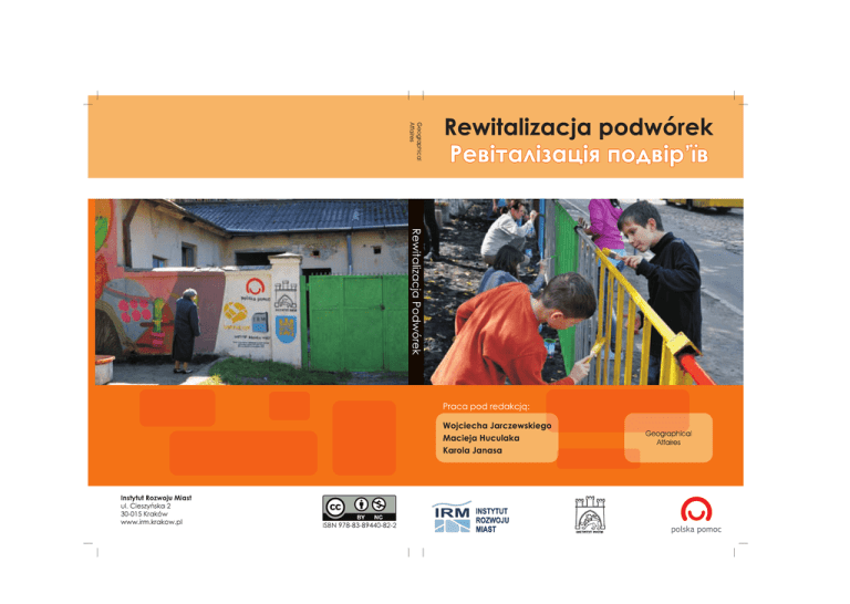 INSTYTUT ROZWOJU MIAST Rewitalizacja podwórek Ревіталізація подвір’їв Książka pt. Rewitalizacja podwórek przygotowana została w ramach współfinansowanego przez Ministerstwo Spraw Zagranicznych Rzeczpospolitej Polskiej projektu Pomoc rozwojowa 2013 nr 361 pt: Rewitalizacja podwórek Podzamcza – profesjonalizacja zarządzania komunalnymi zasobami mieszkaniowymi Lwowa: 2013 Projekt realizowany przez Instytut Rozwoju Miast w Krakowie Oficjalny ukraiński partner projektu: Instytut Miasta/Urząd Miasta Lwowa Kierownik projektu: dr Wojciech Jarczewski – Instytut Rozwoju Miast (IRM) w Krakowie Ukraiński koordynator projektu: Maksym Łysak – Instytut Miasta/Urząd Miasta Lwowa Książka pt. Rewitalizacja podwórek przygotowana została pod kierownictwem dr. Wojciecha Jarczewskiego przez zespół w składzie: Maciej Huculak – Instytut Rozwoju Miast w Krakowie dr Wojciech Jarczewski – Instytut Rozwoju Miast w Krakowie Karol Janas – Instytut Rozwoju Miast w Krakowie dr Piotr Klepacki – Instytut Botaniki, Uniwersytet Jagielloński prof. Jurij Kryworuczko – Uniwersytet Państwowy Politechnika Lwowska, Główny Architekt Miasta Lwowa w latach 2006-2012 Anna Rumińska – eMSA Inicjatywa Edukacyjna, Katedra Etnologii i Antropologii Kulturowej, Uniwersytet Wrocławski Recenzent: dr hab. arch. Zygmunt Ziobrowski, prof. IRM Projekt współfinansowany w ramach programu polskiej współpracy rozwojowej Ministerstwa Spraw Zagranicznych RP w 2013 r. www.polskapomoc.gov.pl. Publikacja wyraża wyłącznie poglądy autorów i nie może być utożsamiana z oficjalnym stanowiskiem Ministerstwa Spraw Zagranicznych RP. Książka pt. Rewitalizacja podwórek jest dostępna na licencji Creative Commons Uznanie autorstwa 3.0 Polska. Pewne prawa zastrzeżone na rzecz Instytutu Rozwoju Miast w Krakowie. Zezwala się na dowolne wykorzystanie utworu pod warunkiem zachowania ww. informacji, w tym informacji o stosowanej licencji, o posiadaczach praw oraz o programie polskiej współpracy rozwojowej. Zdjęcie na okładce zostało wykonane i użyczone przez Natalię Mysak. © Copyright by INSTYTUT ROZWOJU MIAST, Kraków 2013 ISBN 978-83-89940-82-2 Rewitalizacja podwórek Ревіталізація подвір’їв Praca pod redakcją: Wojciecha Jarczewskiego Macieja Huculaka Karola Janasa Книга під назвою «Ревіталізація подвір’їв» була підготовлена в рамках проекту «Допомога задля розвитку 2013» № 361 Ревіталізація дворів району Підзамче – вдосконалення процесу управління комунальними житловими ресурсами Львова: 2013, який фінансується, зокрема, Міністерством закордонних справ Республіки Польща Основним виконавцем Проекту був Інститут Розвитку Міст (ІРМ) з м. Кракова. Офіційним українським партнером Проекту виступив Інститут Міста/Міська рада м. Львова Керівник Проекту: д-р. Войцєх Ярчевський – Інститут Розвитку Міст, м. Краків Український координатор Проекту: Максим Лисак – Інститут Міста/Міська рада м. Львова Книгу під назвою «Ревіталізація подвір’їв» підготував під керівництвом д-ра Войцєха Ярчевського колектив у складі: Мацєй Гуцуляк – Інститут Розвитку Міст, м. Краків д-р. Войцєх Ярчевський – Інститут Розвитку Міст, м. Краків Кароль Янаc – Інститут Розвитку Міст, м. Краків д-р. Пьотр Клепацький – Інститут Ботаніки Ягеллонського Університету проф. Юрій Криворучко – НУ «Львівська Політехніка», головний архітектор м. Львова у 2006-2012 роках Анна Румінська - Департамент етнології та культурної антропології, Вроцлавського Університету Рецензент: д.н. арх. Зигмунт Зьобровський, проф. ІРМ Співфінансування Проекту відбувалося в рамках «Програми польської співпраці задля розвитку» Міністерства закордонних справ Польської Республіки в 2013 році. www. polskapomoc.gov.pl. Публікація відображає виключно позицію та погляди авторів і не може сприйматися як офіційна позиція Міністерства закордонних справ РП. Книга під назвою «Ревіталізація подвір’їв» доступна на умовах ліцензії Creative Commons із зазначенням авторства 3.0 Польща. Певні права закріплені за Інститутом Розвитку Міст м. Кракова. Дозволяється вільно використовувати текст публікації, за умови збереження вказаної вище інформації, зокрема інформації, що стосується ліцензії, власників прав, а також Програми польської співпраці задля розвитку. Автор та власник зображення на обкладинці – Наталія Мисак. © Copyright by ІН