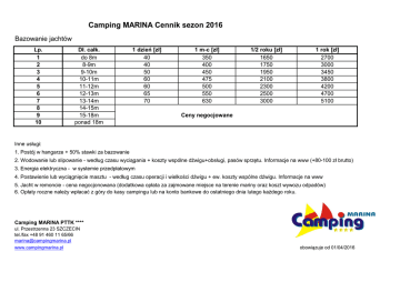Camping MARINA Cennik sezon 2016 Bazowanie jachtów Lp. 1 2 3 4 5 6 7 8 9 10 Dł. całk. do 8m 8-9m 9-10m 10-11m 11-12m 12-13m 13-14m 14-15m 15-18m ponad 18m 1 dzień [zł] 40 40 50 60 60 65 70 1 m-c [zł] 350 400 450 475 500 550 630 1/2 roku [zł] 1650 1750 1950 2100 2300 2500 3000 1 rok [zł] 2700 3000 3450 3800 4200 4700 5100 Ceny negocjowane Inne usługi: 1. Postój w hangarze + 50% stawki za bazowanie 2. Wodowanie lub slipowanie - według czasu wyciągania + koszty wspólne dźwigu+obsługi, pasów sprzętu. Informacje na www (+80-100 zł brutto) 3. Energia elektryczna - w systemie przedpłatowym 4. Postawienie lub wyciągnięcie masztu - według czasu operacji i wielkości dźwigu + ew. koszty wspólne dźwigu. Informacje na www 5. Jacht w remoncie - cena negocjonowana (dodatkowa opłata za zajmowane miejsce na terenie mariny oraz koszt wywozu odpadów) 6. Opłaty roczne należy wpłacać z góry do kasy campingu lub na konto bankowe do ostatniego dnia lutego każdego roku. Camping MARINA PTTK **** ul. Przestrzenna 23 SZCZECIN tel./fax +48 91 460 11 65/66 [email protected] www.campingmarina.pl obowiązuje od 01/04/2016