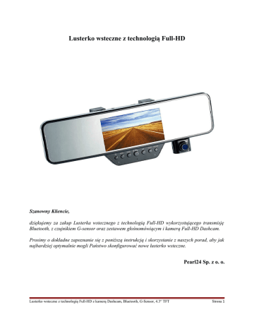 Lusterko wsteczne z technologią Full-HD Szanowny Kliencie, dziękujemy za zakup Lusterka wstecznego z technologią Full-HD wykorzystującego transmisję Bluetooth, z czujnikiem G-sensor oraz zestawem głośnomówiącym i kamerą Full-HD Dashcam. Prosimy o dokładne zapoznanie się z poniższą instrukcją i skorzystanie z naszych porad, aby jak najbardziej optymalnie mogli Państwo skonfigurować nowe lusterko wsteczne. Pearl24 Sp. z o. o. Lusterko wsteczne z technologią Full-HD z kamerą Dashcam, Bluetooth, G-Sensor, 4.3“ TFT Strona 1 Zawartość zestawu • Lusterko wsteczne • Kabel USB • Kabel zasilający do samochodu • Instrukcję obsługi Dane techniczne Wyświetlacz Rozdzielczość Kąt widzenia obiektywu Jasność wyświetlacza Rozdzielczość obrazu Format wideo Wyświetlanie wideo Wielkość obrazu Format obrazów Karta pamięci Zasilanie Odświeżanie Bateria/akumulatorek Waga (bez baterii) Wymiary 4,3“ HD-TFT 1,0 MP 120° 1 luks 1080P/720P/480P AVI/ MJPG 30 klatek na sekundę 12M / 10M / 8M / 5M / 3M / 2M / 1,3M JPG do 32GB prąd stały 12 V 50/60 Hz 600 mAh 370 g 278 x 96 x 43 mm Lusterko wsteczne z technologią Full-HD z kamerą Dashcam, Bluetooth, G-Sensor, 4.3“ TFT Strona 2 Budowa produktu 1. Przycisk RESET 2. Slot na kartę pamięci 3. Mikrofon 4. Włącznik/wyłącznik 5. Dioda ledowa 6. Przycisk Menu 7. Przycisk do zmiany trybu 8. Mikrofon Bluetooth 9. Przycisk Bluetooth 10. ↑ Strzałka do nawigacji „w górę” 11. ↓ Strzałka do nawigacji „w dół” 12. Dioda ledowa sygnału Bluetooth 13. Przycisk Nagrywania/OK 14. Wyjście TV 15. Wejście USB/GPS 16. Złącze zasilania 17. Obiektyw kamery 18. Wyświetlacz LCD (znajdujący się za lustrem) Lusterko wsteczne z technologią Full-HD z kamerą Dashcam, Bluetooth, G-Sensor, 4.3“ TFT Strona 3 Najważniejsze informacje Bezpieczeństwo • W niniejszej instrukcji znajdą Państwo opis prawidłowego korzystania z produktu. Zalecane jest przechowywanie jej w łatwo dostępnym miejscu, aby w razie wątpliwości mogli Państwo zweryfikować informacje. • Wszelkie modyfikacje produktu obniżają jego poziom bezpieczeństwa. Uwaga: Istnieje ryzyko obrażeń! • Nie należy otwierać obudowy produktu, ani naprawiać go samodzielnie! • Zalecamy ostrożne obchodzenie się produktem. Bardzo łatwo można uszkodzić go w wyniku uderzenia, silnych wstrząsów czy zrzucenia z nawet niewielkiej wysokości. • Produkt należy przechowywać z dala od wilgoci i wyjątkowo wysokich temperatur. • Nigdy nie należy zanurzać produktu w wodzie lub innych płynach. • Wszelkie prawa do wprowadzania zmian technicznych oraz eliminacji błędów są zastrzeżone. Uwaga! Priorytet maja zawsze zasady Kodeksu Drogowego oraz inne przepisy regulujące korzystanie z dróg publicznych. Istotne informacje dotyczące utylizacji produktu Urządzenie elektryczne nie zalicza się do odpadów gospodarczych. W celu właściwej utylizacji urządzenia należy skontaktować się z organizacją odpowiedzialną za zbiórkę elektroodpadów w wybranej miejscowości. Potwierdzenie zgodności Deklaruje się, że produkt NX-4081 jest zgodny z normą EMV 2004/108/EG, normą R&TTE 99/5/EG oraz dyrektywą RoHS 2011/65/EU. Lusterko wsteczne z technologią Full-HD z kamerą Dashcam, Bluetooth, G-Sensor, 4.3“ TFT Strona 4 Uruchomienie urządzenia Montaż i przyłączenie lusterka 1. Weź do ręki lusterko oraz kabel zasilający do samochodu. 2. Przysuń do siebie oba wsporniki znajdujące się na spodniej stronie lusterka. 3. Zaciśnij ramiona wsporników lusterka Full-HD na zwykłym lusterku wstecznym. Lusterko wsteczne z technologią Full-HD z kamerą Dashcam, Bluetooth, G-Sensor, 4.3“ TFT Strona 5 4. Ukryj kabel zasilający pod framugą lub pod tapicerką tak, aby nie przeszkadzał Ci podczas jazdy. 5. Podepnij kabel zasilający do złącza znajdującego się w lusterku. 6. Ustaw lusterko w sposób, zapewniający Ci najbardziej optymalny kąt widzenia. Lusterko wsteczne z technologią Full-HD z kamerą Dashcam, Bluetooth, G-Sensor, 4.3“ TFT Strona 6 7. Podłącz kabel zasilający do gniazda zapaliczki swojego samochodu i naciśnij Włącznik/Wyłącznik. 8. Nowe lusterko wsteczne jest gotowe do użycia. Podłączanie/odłączanie karty pamięci Podłącz kartę pamięci microSD do slotu karty pamięci, aby móc nagrywać filmy podczas jazdy. 1. Obróć kartę w taki sposób, aby jej styki były ustawione w kierunku lusterka, a następnie włóż kartę pamięci do slotu. Sprawdź delikatnie czy karta nie wypadnie. 2. Aby wyjąć kartę pamięci, przyciśnij wąską/szpiczastą cześć karty. Spowoduje to wysunięcie karty ze slotu. Można ją teraz wyjąć. Lusterko wsteczne z technologią Full-HD z kamerą Dashcam, Bluetooth, G-Sensor, 4.3“ TFT Strona 7 Obsługa Włączanie/wyłączanie • Włączanie Naciśnij Włącznik/Wyłącznik. Lusterko uruchomi się automatycznie w trybie Video (DVR) i rozpocznie nagrywanie. Wskazówka: Nagrywanie rozpocznie się automatycznie tylko wtedy, gdy jest podłączona karta pamięci. Jeżeli do lusterka jest podłączony kabel zasilający, a samochód nie jest uruchomiony, to po jego uruchomieniu lusterko zostanie włączone automatycznie. W tym przypadku lusterko również uruchomi się w trybie Video (DVR) i rozpocznie nagrywanie. • Wyłączanie Naciśnij Włącznik/wyłącznik na lusterku. Wskazówka: Jeżeli podczas nagrywania wyłączysz samochód, lusterko wyłączy się automatycznie i zapisze dotychczas nagrywany film. . Ładowanie baterii/akumulatorka • Ładowanie poprzez kabel USB 1. Podłącz lusterko do komputera za pomocą dołączonego kabla USB. 2. W trakcie ładowanie dioda ledowa będzie świecić się na czerwono. 3. Po ukończeniu ładowania baterii proces zostanie zakończony i dioda zgaśnie. • Ładowanie za pomocą kabla zasilającego do samochodu 1. Bateria lusterka jest ładowana automatycznie, jeżeli kabel zasilający do samochodu jest podłączony i samochód jest u