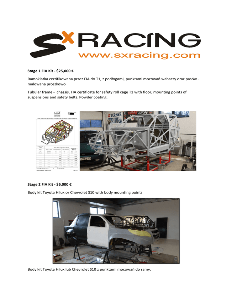 Stage 1 FIA Kit - $25,000 € Ramoklatka certifikowana przez FIA do T1, z podłogami, punktami mocowań wahaczy oraz pasów malowana proszkowo Tubular frame - chassis, FIA certificate for safety roll cage T1 with floor, mounting points of suspensions and safety belts. Powder coating. Stage 2 FIA Kit - $6,000 € Body kit Toyota Hilux or Chevrolet S10 with body mounting points Body kit Toyota Hilux lub Chevrolet S10 z punktami mocowań do ramy. Stage 3 FIA Kit - $12,500 € Stage 3 not included stage 1 and 2 All-inclusive kit - everything what you need to put your chassis on the wheels. Front A-arms, , front hubs and uprights, rear links, rear solid axle case with hubs, steering rack with steering rods and 4 wheels Stage 3 FIA Kit - $12,500 € Stage 3 nie zawiera Stage 1 i 2 Wszystko co potrzebujesz aby postawić ramo klatkę na kolach. Przednie wahacze, przednie piasty, zwrotnice, tylne wahacze, obudowa tylnego mostu z piastami, przekładnia kierownicza z drążkami, 4 koła NOTE: Upgrade for independent rear suspension plus 5000 € Upgrade na niezależne tylne zawieszenie plus 5000 €