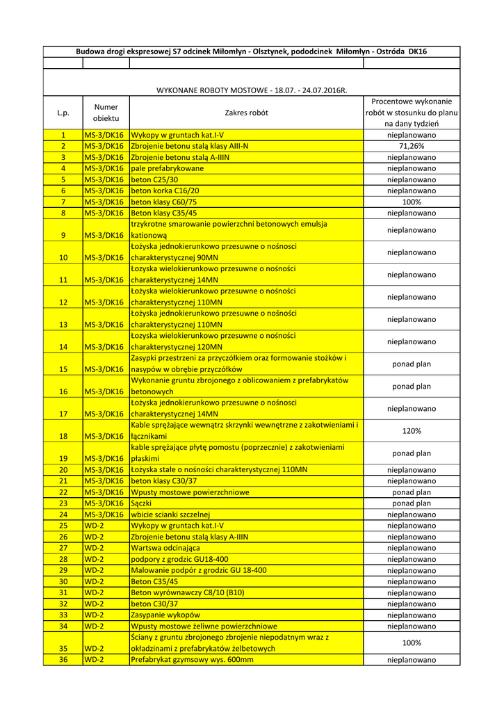 Budowa drogi ekspresowej S7 odcinek Miłomłyn - Olsztynek, pododcinek Miłomłyn - Ostróda DK16 WYKONANE ROBOTY MOSTOWE - 18.07. - 24.07.2016R. L.p. Numer obiektu 1 2 3 4 5 6 7 8 MS-3/DK16 MS-3/DK16 MS-3/DK16 MS-3/DK16 MS-3/DK16 MS-3/DK16 MS-3/DK16 MS-3/DK16 9 MS-3/DK16 10 MS-3/DK16 11 MS-3/DK16 12 MS-3/DK16 13 MS-3/DK16 14 MS-3/DK16 15 MS-3/DK16 16 MS-3/DK16 17 MS-3/DK16 18 MS-3/DK16 19 20 21 22 23 24 25 26 27 28 29 30 31 32 33 34 MS-3/DK16 MS-3/DK16 MS-3/DK16 MS-3/DK16 MS-3/DK16 MS-3/DK16 WD-2 WD-2 WD-2 WD-2 WD-2 WD-2 WD-2 WD-2 WD-2 WD-2 35 36 WD-2 WD-2 Zakres robót Wykopy w gruntach kat.I-V Zbrojenie betonu stalą klasy AIII-N Zbrojenie betonu stalą A-IIIN pale prefabrykowane beton C25/30 beton korka C16/20 beton klasy C60/75 Beton klasy C35/45 trzykrotne smarowanie powierzchni betonowych emulsja kationową Łożyska jednokierunkowo przesuwne o nośnosci charakterystycznej 90MN Łozyska wielokierunkowo przesuwne o nośności charakterystycznej 14MN Łożyska wielokierunkowo przesuwne o nośności charakterystycznej 110MN Łożyska jednokierunkowo przesuwne o nośności charakterystycznej 110MN Łozyska wielokierunkowo przesuwne o nośności charakterystycznej 120MN Zasypki przestrzeni za przyczółkiem oraz formowanie stożków i nasypów w obrębie przyczółków Wykonanie gruntu zbrojonego z oblicowaniem z prefabrykatów betonowych Łożyska jednokierunkowo przesuwne o nośnosci charakterystycznej 14MN Kable sprężające wewnątrz skrzynki wewnętrzne z zakotwieniami i łącznikami kable sprężające płytę pomostu (poprzecznie) z zakotwieniami płaskimi Łożyska stałe o nośności charakterystycznej 110MN beton klasy C30/37 Wpusty mostowe powierzchniowe Sączki wbicie scianki szczelnej Wykopy w gruntach kat.I-V Zbrojenie betonu stalą klasy A-IIIN Wartswa odcinająca podpory z grodzic GU18-400 Malowanie podpór z grodzic GU 18-400 Beton C35/45 Beton wyrównawczy C8/10 (B10) beton C30/37 Zasypanie wykopów Wpusty mostowe żeliwne powierzchniowe Ściany z gruntu zbrojonego zbrojenie niepodatnym wraz z okładzinami z prefabrykatów żelbetowych Prefabrykat gzymsowy wys. 600mm Procentowe wykonanie robót w stosunku do planu na dany tydzień nieplanowano 71,26% nieplanowano nieplanowano nieplanowano nieplanowano 100% nieplanowano nieplanowano nieplanowano nieplanowano nieplanowano nieplanowano nieplanowano ponad plan ponad plan nieplanowano 120% ponad plan nieplanowano nieplanowano ponad plan ponad plan nieplanowano nieplanowano nieplanowano nieplanowano nieplanowano nieplanowano nieplanowano nieplanowano nieplanowano nieplanowano nieplanowano 100% nieplanowano 37 38 39 40 41 42 43 WD-2 WD-2 WD-2 WD-2 WD-2 WD-2 WD-2 44 45 WD-2 WD-2 46 47 48 49 50 51 52 53 WD-2 WS-1 WS-1 WS-1 WS-1 WS-1 WS-1 WS-1 Wewnętrzne kable sprężające 19/0,6" AL=150mm2 Krawężnik kamienny Izolacja z papy termozgrzewalnej o gr. >0,5cm Beton C25/30 Saczki z tworzywa sztucznego Dren francuski z rurą 150mm kotwy talerzowe Bloki z gruntu zbrojonego zbrojeniem niepodatnym, za ścianami konstrukcji Elementy rozsączające trzykrotne smarowanie powierzchni betonowych emulsja kationową Wykopy w gruntach nieskalistych wraz z umocnieniem stała ścianka szczelna z grodzic Zbrojenie betonu stalą klasy A-IIIN Wykopy w gruntach nieskalistych dla wymiany gruntu Beton C35/45 - fundament pod prefabrykaty Zasypanie wykopów - zasypka konstrukcyjna Beton wyrównawczy C20/25 54 55 WS-1 WS-1 beton klasy C8/10 zastępujacy wymieniany grunt w wykopach Beton C35/45 - zamki 56 WS-1 Izolacja powierzchni betonowych stykajacych się z gruntem 57 WS-1 58 59 60 61 62 63 64 65 66 WS-1 WS-1 WS-1 WD-4 WD-4 WD-4 WD-4 WD-4 WD-4 Prefabrykaty betonowe C50/60 - typ elementu L1 i P1 ( 9,64 m3) Prefabrykaty betonowe C50/60 - typ elementu skrajne ( objętość średnia 8,44 m3) Beton C35/45 - próg stabilizujący wykopy w gruntach nieskalistych bez umocnienia wykopy w gruntach nieskalistych bez umocnienia Beton klasy C8/10 Beton wyrównawczy C8/10 (B10) Zbrojenie betonu stalą klasy A-IIIN Beton C35/45 Wewnętrzne kable sprężające 19/0,6" AL=150mm2 67 68 69 70 71 72 73 WD-4 WD-4 WD-4 WD-4 WD-4 WD-4 WD-4 74 75 WD-4 WD-4 Izolacja powierzchni betonowych stykajacych się z gruntem Beton klasy C8/10 Wpusty mostowe żeliwne powierzchniowe Wpusty mostowe krawężnikowe podpory z grodzic GU18-400 Saczki z tworzywa sztucznego Izolacja z papy termozgrzewalnej o gr. >0,5cm Zasypki przestrzeni za scianami konstrukcji oraz formowanie stożków i nsypów przy obiekcie beton C30/37 76 WD-4 beton klasy C8/10 zastępujacy wymieniany grunt w wykopach nieplanowano nieplanowano nieplanowano nieplanowano nieplanowano nieplanowano nieplanowano nieplanowano nieplanowano nieplanowano nieplanowano nieplanowano 100% nieplanowano nieplanowano nieplanowano nieplanowano nieplanowano 100% nieplanowano nieplanowano nieplanowano nieplanowano nieplanowano nieplanowano nieplanowano nieplanowano nieplanowano nieplanowano nieplanowano nieplanowano nieplanowano nieplanowano nieplanowano nieplanowano nieplanowano ponad plan nieplanowano nieplanowano nieplanowano