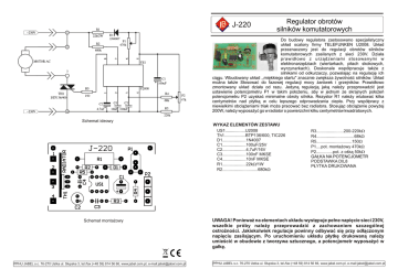 JABEL ® J-220 Regulator obrotów silników komutatorowych Do budowy regulatora zastosowano specjalistyczny układ scalony firmy TELEFUNKEN U2008. Układ przeznaczony jest do regulacji obrotów silników komutatorowych zasilanych z sieci 230V. Działa prawidłowo z urządzeniami stosowanymi w elektronarzędziach (wiertarkach, piłach skokowych, wyrzynarkach). Doskonale współpracuje także z silnikami od odkurzaczy, pozwalając na regulację ich ciągu. Wbudowany układ ,,miękkiego startu'' znacznie zwiększa żywotność silników. Układ można także Stosować do fazowej regulacji mocy żarówek i grzejników. Prawidłowo zmontowany układ działa od razu. Jedyną regulacją jaką należy przeprowadzić jest ustawienie potencjometru P1 w takim położeniu, aby w jednym ze skrajnych położeń potencjometru P2 uzyskać minimalne obroty silnika. Rezystor R1 należy wlutować kilka centymetrów nad płytką w celu lepszego odprowadzania ciepła. Przy współpracy z niewielkimi obciążeniami triak może pracować bez radiatora. Stosując obciążenie powyżej 200W, należy wyposażyć go w radiator o powierzchni kilku centymetrów kwadratowych. Schemat ideowy Schemat montażowy PPHU JABEL s.c. 76-270 Ustka ul. Słupska 3, tel./fax (+48 59) 814 56 66, www.jabel.com.pl, e-mail:[email protected] WYKAZ ELEMENTÓW ZESTAWU US1.................U2008 Th1..................BTP136/600, TIC226 D1....................1N4007 C1....................100uF/25V C2....................4,7uF/16V C3....................100nF MKSE C4....................10nF MKSE R1....................22kW/1W R2..............................680kW R3.......................200-220kW R4................................68kW R5..............................150W P1....pot. montażowy 470kW P2..............pot. z ośką 50kW GAŁKA NA POTENCJOMETR PODSTAWKA DIL8 PŁYTKA DRUKOWANA UWAGA! Ponieważ na elementach układu występuje pełne napięcie sieci 230V, wszelkie próby należy przeprowadzić z zachowaniem szczególnej ostrożności. Jakiekolwiek regulacje powinny odbywać się przy odłączonym napięciu zasilającym. Po uruchomieniu układu płytkę drukowaną należy umieścić w obudowie z tworzywa sztucznego, a potencjometr wyposażyć w gałkę. PPHU JABEL s.c. 76-270 Ustka ul. Słupska 3, tel./fax (+48 59) 814 56 66, www.jabel.com.pl, e-mail:[email protected]