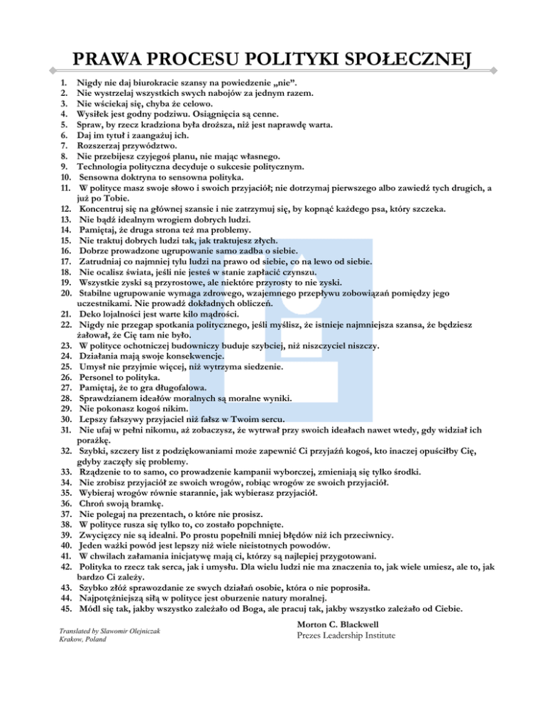 PRAWA PROCESU POLITYKI SPOŁECZNEJ 1. 2. 3. 4. 5. 6. 7. 8. 9. 10. 11. 12. 13. 14. 15. 16. 17. 18. 19. 20. 21. 22. 23. 24. 25. 26. 27. 28. 29. 30. 31. 32. 33. 34. 35. 36. 37. 38. 39. 40. 41. 42. 43. 44. 45. Nigdy nie daj biurokracie szansy na powiedzenie „nie”. Nie wystrzelaj wszystkich swych nabojów za jednym razem. Nie wściekaj się, chyba że celowo. Wysiłek jest godny podziwu. Osiągnięcia są cenne. Spraw, by rzecz kradziona była droższa, niż jest naprawdę warta. Daj im tytuł i zaangażuj ich. Rozszerzaj przywództwo. Nie przebijesz czyjegoś planu, nie mając własnego. Technologia polityczna decyduje o sukcesie politycznym. Sensowna doktryna to sensowna polityka. W polityce masz swoje słowo i swoich przyjaciół; nie dotrzymaj pierwszego albo zawiedź tych drugich, a już po Tobie. Koncentruj się na głównej szansie i nie zatrzymuj się, by kopnąć każdego psa, który szczeka. Nie bądź idealnym wrogiem dobrych ludzi. Pamiętaj, że druga strona też ma problemy. Nie traktuj dobrych ludzi tak, jak traktujesz złych. Dobrze prowadzone ugrupowanie samo zadba o siebie. Zatrudniaj co najmniej tylu ludzi na prawo od siebie, co na lewo od siebie. Nie ocalisz świata, jeśli nie jesteś w stanie zapłacić czynszu. Wszystkie zyski są przyrostowe, ale niektóre przyrosty to nie zyski. Stabilne ugrupowanie wymaga zdrowego, wzajemnego przepływu zobowiązań pomiędzy jego uczestnikami. Nie prowadź dokładnych obliczeń. Deko lojalności jest warte kilo mądrości. Nigdy nie przegap spotkania politycznego, jeśli myślisz, że istnieje najmniejsza szansa, że będziesz żałował, że Cię tam nie było. W polityce ochotniczej budowniczy buduje szybciej, niż niszczyciel niszczy. Działania mają swoje konsekwencje. Umysł nie przyjmie więcej, niż wytrzyma siedzenie. Personel to polityka. Pamiętaj, że to gra długofalowa. Sprawdzianem ideałów moralnych są moralne wyniki. Nie pokonasz kogoś nikim. Lepszy fałszywy przyjaciel niż fałsz w Twoim sercu. Nie ufaj w pełni nikomu, aż zobaczysz, że wytrwał przy swoich ideałach nawet wtedy, gdy widział ich porażkę. Szybki, szczery list z podziękowaniami może zapewnić Ci przyjaźń kogoś, kto inaczej opuściłby Cię, gdyby zaczęły się problemy. Rządzenie to to samo, co prowadzenie kampanii wyborczej, zmieniają się tylko środki. Nie zrobisz przyjaciół ze swoich wrogów, robiąc wrogów ze swoich przyjaciół. Wybieraj wrogów równie starannie, jak wybierasz przyjaciół. Chroń swoją bramkę. Nie polegaj na prezentach, o które nie prosisz. W polityce rusza się tylko to, co zostało popchnięte. Zwycięzcy nie są idealni. Po prostu popełnili mniej błędów niż ich przeciwnicy. Jeden ważki powód jest lepszy niż wiele nieistotnych powodów. W chwilach załamania inicjatywę mają ci, którzy są najlepiej przygotowani. Polityka to rzecz tak serca, jak i umysłu. Dla wielu ludzi nie ma znaczenia to, jak wiele umiesz, ale to, jak bardzo Ci zależy. Szybko złóż sprawozdanie ze swych działań osobie, która o nie poprosiła. Najpotężniejszą siłą w polityce jest oburzenie natury moralnej. Módl się tak, jakby wszystko zależało od Boga, ale pracuj tak, jakby wszystko zależało od Ciebie. Translated by Slawomir Olejniczak Krakow, Poland Morton C. Blackwell Prezes Leadership Institute