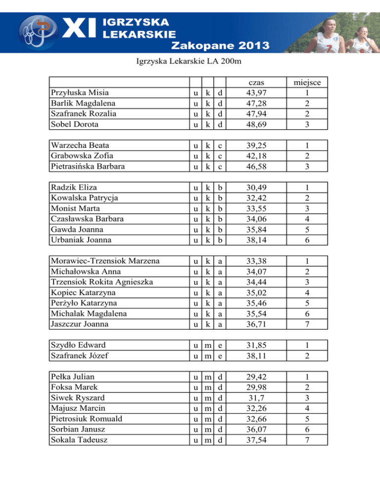 Igrzyska Lekarskie LA 200m Przyłuska Misia Barlik Magdalena Szafranek Rozalia Sobel Dorota u u u u d d d d czas 43,97 47,28 47,94 48,69 Warzecha Beata Grabowska Zofia Pietrasińska Barbara u k c u k c u k c 39,25 42,18 46,58 1 2 3 Radzik Eliza Kowalska Patrycja Monist Marta Czasławska Barbara Gawda Joanna Urbaniak Joanna u u u u u u k k k k k k b b b b b b 30,49 32,42 33,55 34,06 35,84 38,14 1 2 3 4 5 6 Morawiec-Trzensiok Marzena Michałowska Anna Trzensiok Rokita Agnieszka Kopiec Katarzyna Perżyło Katarzyna Michalak Magdalena Jaszczur Joanna u u u u u u u k k k k k k k a a a a a a a 33,38 34,07 34,44 35,02 35,46 35,54 36,71 1 2 3 4 5 6 7 Szydło Edward Szafranek Józef u m e u m e 31,85 38,11 1 2 Pełka Julian Foksa Marek Siwek Ryszard Majusz Marcin Pietrosiuk Romuald Sorbian Janusz Sokala Tadeusz u u u u u u u 29,42 29,98 31,7 32,26 32,66 36,07 37,54 1 2 3 4 5 6 7 k k k k m m m m m m m d d d d d d d miejsce 1 2 2 3 Gawda Piotr Stecuła Leszek Szymala Bogdan Mokrzycki Krzysztof u u u u m m m m c c c c 26,58 29,06 29,82 37,97 1 2 3 4 Wojciechowski Przemysław Opałczyński Zbigniew Grudnik Piotr Lubelski Łukasz Matras Krzysztof Pavalanski Jerzy Plech Marcin Szymala Bogdan u u u u u u u u m m m m m m m m b b b b b b b b 26,96 27,92 1,03,27 1 2 3 Polczak Łukasz Machaj Piotr Baltyn Jacek Dziedzic Mateusz Heliosz Adam u u u u u m m m m m a a a a a 25,75 26,74 1 2 Frelik Kamila Sowa Alina Stecuła Kinga ot ot ot 34,09 38,87 41,83 1 2 3 Kacała Artur Stecuła Benjamin ot ot 27,8 33,61 1 2