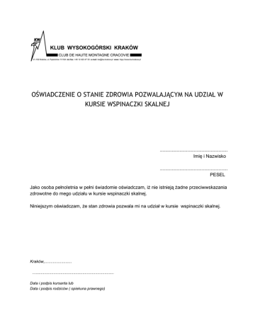 OŚWIADCZENIE O STANIE ZDROWIA POZWALAJĄCYM NA UDZIAŁ W KURSIE WSPINACZKI SKALNEJ .................................................... Imię i Nazwisko .................................................... PESEL Jako osoba pełnoletnia w pełni świadomie oświadczam, iż nie istnieją żadne przeciwwskazania zdrowotne do mego udziału w kursie wspinaczki skalnej. Niniejszym oświadczam, że stan zdrowia pozwala mi na udział w kursie wspinaczki skalnej. Kraków,.......................... …........................................................................... Data i podpis kursanta lub Data i podpis rodziców ( opiekuna prawnego)