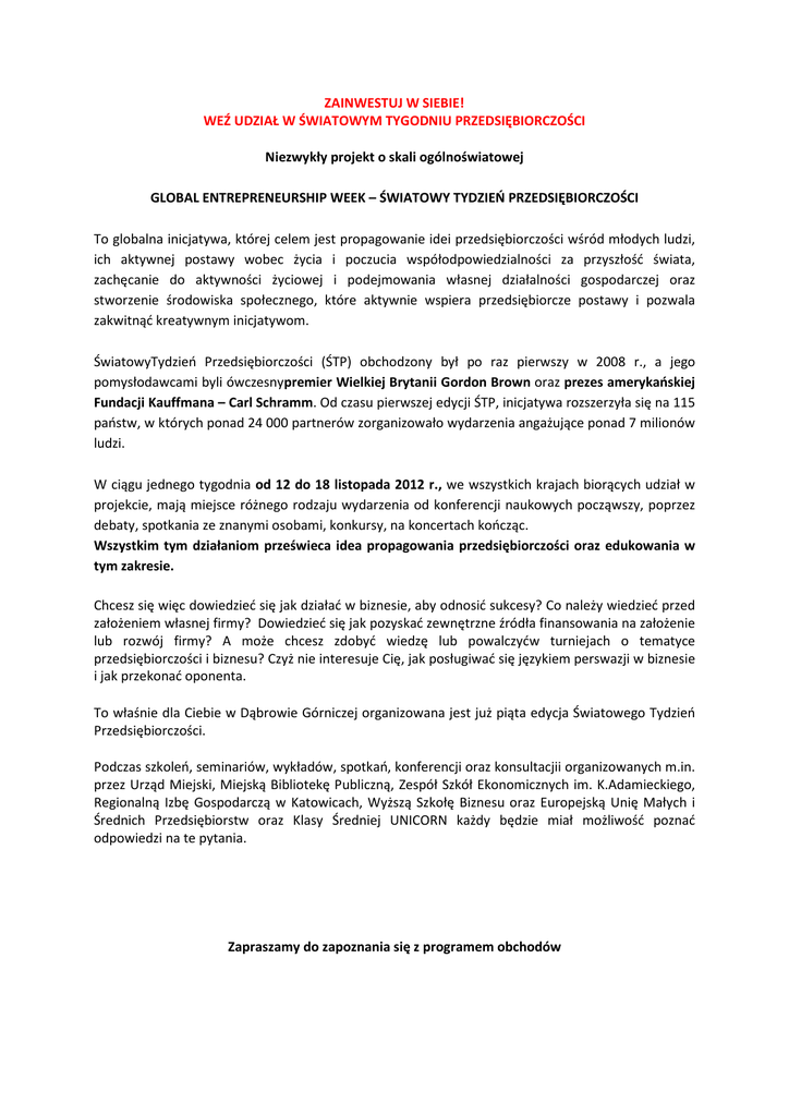 ZAINWESTUJ W SIEBIE! WEŹ UDZIAŁ W ŚWIATOWYM TYGODNIU PRZEDSIĘBIORCZOŚCI Niezwykły projekt o skali ogólnoświatowej GLOBAL ENTREPRENEURSHIP WEEK – ŚWIATOWY TYDZIEŃ PRZEDSIĘBIORCZOŚCI To globalna inicjatywa, której celem jest propagowanie idei przedsiębiorczości wśród młodych ludzi, ich aktywnej postawy wobec życia i poczucia współodpowiedzialności za przyszłość świata, zachęcanie do aktywności życiowej i podejmowania własnej działalności gospodarczej oraz stworzenie środowiska społecznego, które aktywnie wspiera przedsiębiorcze postawy i pozwala zakwitnąć kreatywnym inicjatywom. ŚwiatowyTydzień Przedsiębiorczości (ŚTP) obchodzony był po raz pierwszy w 2008 r., a jego pomysłodawcami byli ówczesnypremier Wielkiej Brytanii Gordon Brown oraz prezes amerykańskiej Fundacji Kauffmana – Carl Schramm. Od czasu pierwszej edycji ŚTP, inicjatywa rozszerzyła się na 115 państw, w których ponad 24 000 partnerów zorganizowało wydarzenia angażujące ponad 7 milionów ludzi. W ciągu jednego tygodnia od 12 do 18 listopada 2012 r., we wszystkich krajach biorących udział w projekcie, mają miejsce różnego rodzaju wydarzenia od konferencji naukowych począwszy, poprzez debaty, spotkania ze znanymi osobami, konkursy, na koncertach kończąc. Wszystkim tym działaniom prześwieca idea propagowania przedsiębiorczości oraz edukowania w tym zakresie. Chcesz się więc dowiedzieć się jak działać w biznesie, aby odnosić sukcesy? Co należy wiedzieć przed założeniem własnej firmy? Dowiedzieć się jak pozyskać zewnętrzne źródła finansowania na założenie lub rozwój firmy? A może chcesz zdobyć wiedzę lub powalczyćw turniejach o tematyce przedsiębiorczości i biznesu? Czyż nie interesuje Cię, jak posługiwać się językiem perswazji w biznesie i jak przekonać oponenta. To właśnie dla Ciebie w Dąbrowie Górniczej organizowana jest już piąta edycja Światowego Tydzień Przedsiębiorczości. Podczas szkoleń, seminariów, wykładów, spotkań, konferencji oraz konsultacjii organizowanych m.in. przez Urząd Miejski, Miejską Bibliotekę Publiczną, Zespół Szkół Ekonomicznych im. K.Adamieckiego, Regionalną Izbę Gospodarczą w Katowicach, Wyższą Szkołę Biznesu oraz Europejską Unię Małych i Średnich Przedsiębiorstw oraz Klasy Średniej UNICORN każdy będzie miał możliwość poznać odpowiedzi na te pytania. Zapraszamy do zapoznania się z programem obchodów PROGRAM ŚWIATOWEGO TYGODNIA PRZEDSIĘBIORCZOŚCI W DĄBROWIE GÓRNICZEJ Poniedziałek, 12 listopada godz. 10.00 – 13.00 Urząd Miejski ul. Graniczna 21 (hol I p.) Dyżur konsultanta Punktu Konsultacyjnego KSU działającego przy Rudzkiej Agencji Rozwoju „Inwestor” Sp. z o.o. – Informacje na temat możliwości uzyskania wsparcia na rozpoczęcie oraz rozwój działalności gospodarczej. godz. 16.00 Miejska Biblioteka Publiczna, ul. Kościuszki 25 Inauguracja Ligi Młodych Przedsiębiorców – Przedsięwzięcie skierowane do reprezentacji szkół gimnazjalnych. Wtorek, 13 listopada godz. 11.00 Zespół Szkół Ekonomicznych im. Karola Adamieckiego, Al. Piłsudskiego 5 „Przedsiębiorczy uczeń na lokalnym rynku pracy” – II edycja konkursu dla szkół ponadgimnazjalnych. godz. 12.00 - 14.00Urząd Miejski ul. Graniczna 21, sala nr 2 I piętro Seminarium warsztatowe „Wspieranie działalności gospodarczej w obszarze e-usług w ramach działania 8.1 Programu Operacyjnego Innowacyjna Gospodarka” - prowadzone przez eksperta Działu Doradztwa i Funduszy Europejskich Regionalnej Izby Gospodarczej w Katowicach. Karty zgłoszenia uczestnictwa proszę przesyłać na adres e-mail : [email protected](karta zgłoszenia dostępna na stronie www.idabrowa.pl). Środa, 14 listopada godz. 9.00 Zespół Szkół Ekonomicznych im. Karola Adamieckiego, Al. Piłsudskiego 5 II Konferencja dla pracodawców pn. „Rola praktycznej nauki zawodu w reformie kształcenia zawodowego”. godz. 9.30 – 13.30Urząd Miejski ul. Graniczna 21, sala sesyjna, I piętro Seminarium warsztatowe "Przedsiębiorco, eksportuj!Internacjonalizacja polskich MSPniezbędnym warunkiem konkurencyjności polskiej gospodarki” - organizowane przez Europejską Unię Małych i Średnich Przedsiębiorstw oraz Klasy Średniej UNICORN. Karty zgłoszenia uczestnictwa proszę przesyłać na adres e-mail : [email protected](karta zgłoszenia dostępna na stronie www.idabrowa.pl). Czwartek, 15 listopada Wyższa Szkoła Biznesu w Dąbrowie Górniczej, ul. Cieplaka 1c Kontakt : Akademickie Biuro Karier tel. 32 295 93 14, zapisy : [email protected] , pełny program : wsb.edu.pl godz. 9.00 Wykład inauguracyjny „Język perswazji w biznesie. Jak przekonać oponenta?”Tomasz Otawa, Otawa GroupSp.j. godz. 10.15 Debata oksfordzka „Kryzys ekonomiczny na świecie jest wynikiem działań banków centralnych”. Rada Mędrców: prof. nadzw. dr hab. Romuald Hanisz - Katedra Finansów i Gospodarki Światowej, Wyższa Szkoła Biznesu w Dąbrowie Górniczej, prof. zw. dr hab. Jacek Wódz - Katedra Socjologii WSB, dr Rafał Rębilas - Katedra Finansów i Gospodarki Światowej WSB, mgr Kazimierz Graca – Katedra Zarządzania WSB, Dyrektor Oddziału Banku Zachodniego WBK SA w Rudzie Śląskiej. godz. 10.30 Szkolenie:, „Jak negocjować z silniejszym partnerem? Proces negocjacji podparty wiedzą naukową”- dr Ewa Sadowska – Katedra Zarządzania, Wyższa Szkoła Biznesu w Dąbrowie Górniczej. godz. 10.30 Szkolenie „CSR - co to znaczy prowadzić firmę odpowiedzialną społecznie?”Sylwia Sędrowicz, Job Trainings Sp. z o.o. godz. 12.00 Szkolenie: „Komputer, biznes i język obcy w klasie” – szkolenie z wykorzystaniem tablic interaktywnych – mgr Tomasz Zelek – Wyższa Szkoła Biznesu w Dąbrowie Górniczej. godz. 12.00-14.00 Szkolenie „Kawa czy herbata”- tajniki rozmowy kwalifikacyjnej, Anna Sypek DPM Sp. z o.o. Całodzienny dyżur doradcy zawodowego Piątek, 16 listopada godz. 10.00 – 12.00 Urząd M
