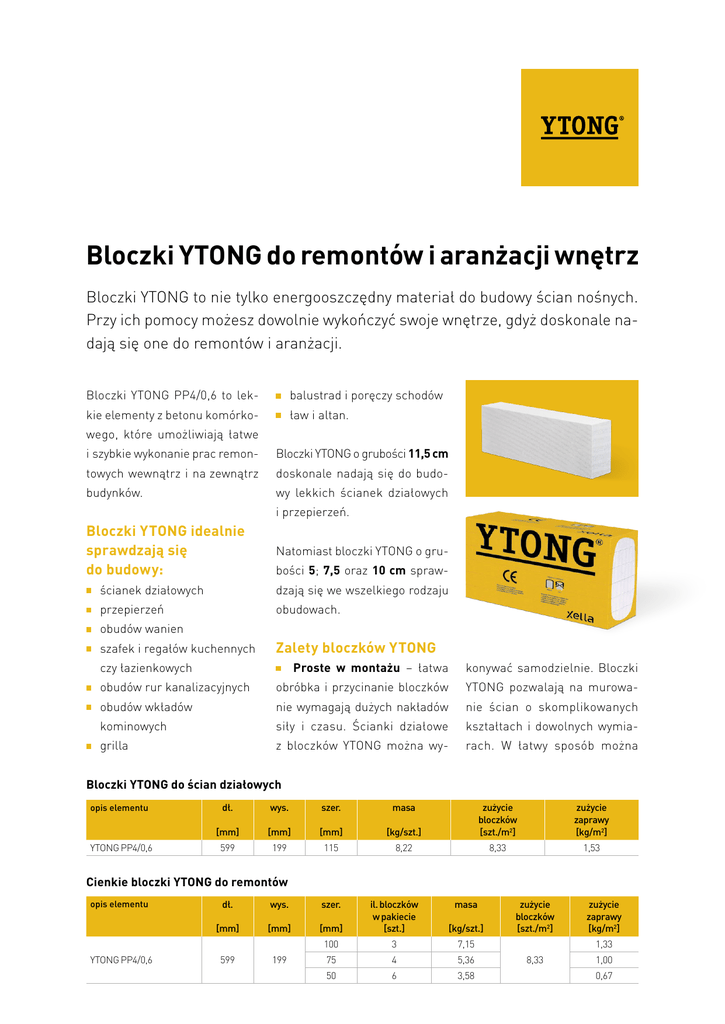 Bloczki YTONG do remontów i aranżacji wnętrz Bloczki YTONG to nie tylko energooszczędny materiał do budowy ścian nośnych. Przy ich pomocy możesz dowolnie wykończyć swoje wnętrze, gdyż doskonale nadają się one do remontów i aranżacji. Bloczki YTONG PP4/0,6 to lek- balustrad i poręczy schodów kie elementy z betonu komórko- ław i altan. wego, które umożliwiają łatwe i szybkie wykonanie prac remon- Bloczki YTONG o grubości 11,5 cm towych wewnątrz i na zewnątrz doskonale nadają się do budo- budynków. wy lekkich ścianek działowych i przepierzeń. Bloczki YTONG idealnie sprawdzają się do budowy: Natomiast bloczki YTONG o grubości 5; 7,5 oraz 10 cm spraw- ścianek działowych dzają się we wszelkiego rodzaju przepierzeń obudowach. obudów wanien szafek i regałów kuchennych Zalety bloczków YTONG Proste w montażu – łatwa konywać samodzielnie. Bloczki obudów rur kanalizacyjnych obróbka i przycinanie bloczków YTONG pozwalają na murowa- obudów wkładów nie wymagają dużych nakładów nie ścian o skomplikowanych siły i czasu. Ścianki działowe kształtach i dowolnych wymia- z bloczków YTONG można wy- rach. W łatwy sposób można czy łazienkowych kominowych grilla Bloczki YTONG do ścian działowych opis elementu YTONG PP4/0,6 dł. wys. szer. masa [kg/szt.] zużycie bloczków [szt./m2] zużycie zaprawy [kg/m2] [mm] [mm] [mm] 599 199 115 8,22 8,33 1,53 Cienkie bloczki YTONG do remontów opis elementu YTONG PP4/0,6 dł. wys. szer. [mm] [mm] 599 199 [mm] il. bloczków w pakiecie [szt.] masa [kg/szt.] 100 3 7,15 75 4 5,36 50 6 3,58 zużycie bloczków [szt./m2] zużycie zaprawy [kg/m2] 1,33 8,33 1,00 0,67 Wygodne w transporcie – Do obróbki bloczków stosuje się systemowe narzędzia: bloczki YTONG są lekkie, a przez kielnię do cienkich spoin je łączyć z innymi materiałami, np. drewnem czy mozaiką. to łatwe do przetransportowa- o szerokości dopasowanej nia. Te o grub. 5; 7,5 i 10 cm są do bloczków; ponadto pakowane w poręczne ręczną piłę widiową; do przenoszenia pakiety. packę do szlifowania. Trwałe – ścianki działowe z bloczków YTONG stanowią trwałe i stabilne rozwiązanie oraz zapewniają komfortowe Zobacz jak łatwo zaastosować bloczki YTONG. warunki akustyczne. Odporne na działanie wilgoci Krok 1 – bloczki YTONG można z powo- Dopasuj elementy do przyszłej dzeniem stosować do aranżacji zabudowy. Zaplanuj gdzie i w jaki łazienek i toalet. sposób ułożyć bloczki; zmierz, Bezpieczne i zdrowe – bloczki są niepalne, trwałe i produko- które z nich będą wymagały docięcia i szlifowania. wane jedynie z naturalnych surowców. Krok 2 Lekkie – dzięki swojej lek- Przygotuj cienkie bloczki YTONG kości nie obciążają znacząco do montażu. Przytnij je ręczną stropów, ułatwiają murowanie piłą widiową i szlifując nadaj im i przenoszenie. odpowiedni kształt. Wykonanie konstrukcji z cien- Krok 3 kich bloczków YTONG to praw- Wbuduj bloczki YTONG zgodnie dziwa przyjemność. Do łączenia z własnym projektem. Do łącze- bloczków stosuje się zaprawę nia bloczków zastosuj zaprawę do cienkich spoin SILKA-YTONG. SILKA-YTONG. Krok 4 Wykończ powierzchnię bloczków w preferowany sposób: otynkuj je, przyklej bezpośrednio mozaikę lub drewno. Gotowe! Skontaktuj się z nami · www.ytong-silka.pl Infolinia 801 122 223 · 29 767 03 60 Zobacz, jak budują inni · www.budowane.pl Zamów szkolenie ekipy wykonawczej na budowie · www.sklep.xella.pl