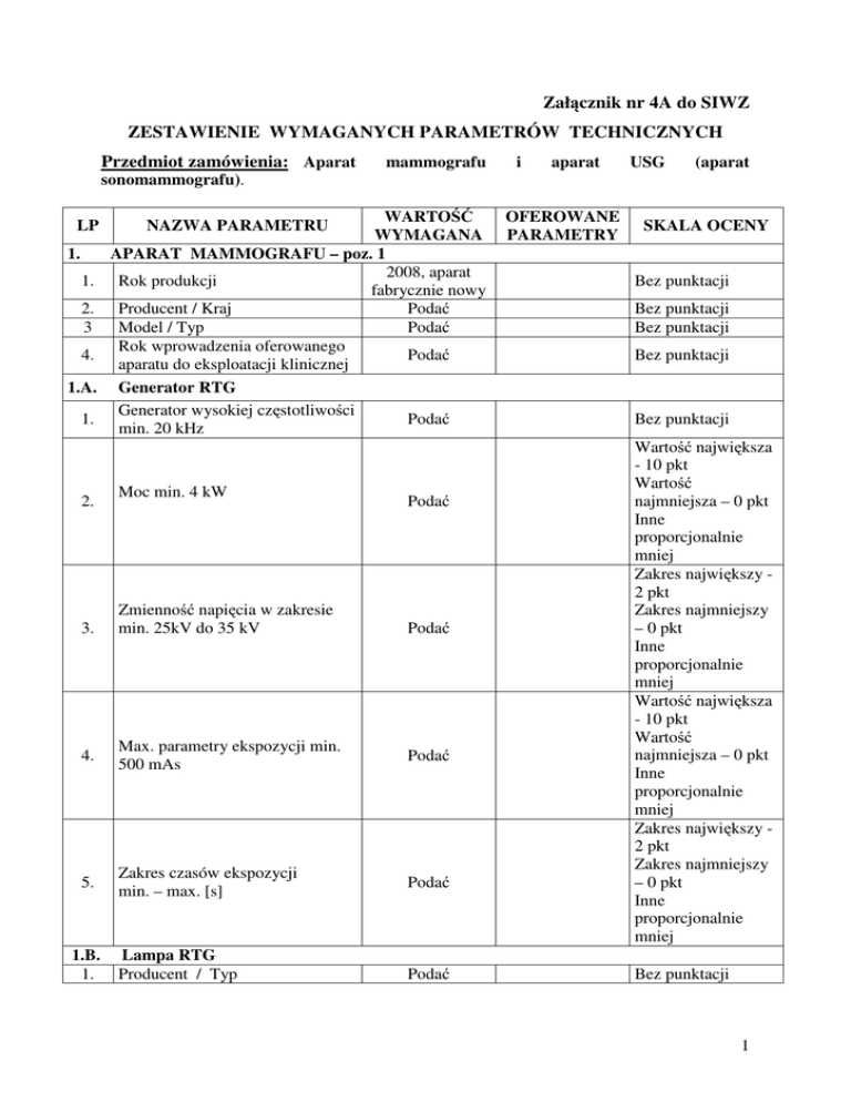 Załącznik nr 4A do SIWZ ZESTAWIENIE WYMAGANYCH PARAMETRÓW TECHNICZNYCH Przedmiot zamówienia: Aparat mammografu i aparat USG (aparat sonomammografu). LP 1. 1. 2. 3 4. 1.A. 1. 2. 3. WARTOŚĆ WYMAGANA APARAT MAMMOGRAFU – poz. 1 2008, aparat Rok produkcji fabrycznie nowy Producent / Kraj Podać Model / Typ Podać Rok wprowadzenia oferowanego Podać aparatu do eksploatacji klinicznej Generator RTG Generator wysokiej częstotliwości Podać min. 20 kHz NAZWA PARAMETRU Moc min. 4 kW Zmienność napięcia w zakresie min. 25kV do 35 kV Podać Podać 4. Max. parametry ekspozycji min. 500 mAs Podać 5. Zakres czasów ekspozycji min. – max. [s] Podać 1.B. 1. Lampa RTG Producent / Typ Podać OFEROWANE PARAMETRY SKALA OCENY Bez punktacji Bez punktacji Bez punktacji Bez punktacji Bez punktacji Wartość największa - 10 pkt Wartość najmniejsza – 0 pkt Inne proporcjonalnie mniej Zakres największy 2 pkt Zakres najmniejszy – 0 pkt Inne proporcjonalnie mniej Wartość największa - 10 pkt Wartość najmniejsza – 0 pkt Inne proporcjonalnie mniej Zakres największy 2 pkt Zakres najmniejszy – 0 pkt Inne proporcjonalnie mniej Bez punktacji 1 2. Dwie ścieżki anody wykonane z dwóch różnych materiałów wymienić materiały NIE Podać 3. Liczba ognisk: nie mniej niż 2 Podać 4. Wymiary ognisk 0,1 mm i 0,3 mm Podać 5. Maksymalna moc na małe ognisko [kW] Podać 6. Maksymalna moc na duże ognisko [kW] Podać 7. Maksymalny prąd lampy nie mniej niż 100 mA Podać 8. 9. 10. 11. 1.C. Filtry: molibdenowy / rodowy Filtry wprowadzane skośnie dla poprawienia równomierności zaczernienia filmu Pojemność cieplna lampy (lub kołpaka z lampą – zależnie od terminologii producenta ) nie mniej niż 400 kHU Obroty anody nie mniej niż 8400 obr/min Automatyka 1. Automatyka ekspozycji 2. Automatyka doboru filtra TAK/TAK TAK – 20 pkt. NIE – 0 pkt. Wartość największa - 4 pkt Wartość najmniejsza 0 pkt Inne proporcjonalnie mniej Bez punktacji Wartość największa - 2 pkt Wartość najmniejsza 0 pkt Inne proporcjonalnie mniej Wartość największa - 5 pkt Wartość najmniejsza 0 pkt Inne proporcjonalnie mniej Wartość największa - 10 pkt Wartość najmniejsza 0 pkt Inne proporcjonalnie mniej Bez punktacji NIE Podać TAK – 2 pkt NIE – 0 pkt Podać Wartość największa - 10 pkt Wartość najmniejsza 0 pkt Inne proporcjonalnie mniej Podać Bez punktacji TAK Opisać TAK Opisać Bez punktacji Bez punktacji 2 3. 4. 5. Budowa i możliwe położenie detektorów Automatyka kompresji Automatyczny dobór siły kompresji do gęstości i typu tkanki - opisać TAK Opisać TAK Bez punktacji NIE Podać TAK – 10 pkt NIE – 0 pkt Bez punktacji 6. Maksymalna siła kompresji [N] Podać Wartość największa - 2 pkt Wartość najmniejsza 0 pkt Inne proporcjonalnie mniej 7. Automatyczne zwolnienie docisku po ekspozycji TAK Bez punktacji 8. Pomiar lub kalkulacja dawki TAK Opisać Bez punktacji TAK Bez punktacji TAK Bez punktacji Cyfrowy wyświetlacz parametrów badania i ekspozycji 10. Wskaźnik kasety naświetlonej 1.D. Parametry statywu 9. Wartość największa - 5 pkt Wartość najmniejsza 0 pkt Inne proporcjonalnie mniej Wartość największa - 2 pkt Wartość najmniejsza 0 pkt Inne proporcjonalnie mniej 1. SID nie mniej niż 65 cm Podać 2. Zakres regulacji wysokości powierzchni stolika od podłogi [cm] Podać 3. Formaty filmów i oferowanych stolików: 18 x 24 cm i 24 x 30 cm TAK Bez punktacji Podać Wartość największa - 2 pkt Wartość najmniejsza 0 pkt Inne proporcjonalnie mniej 4. Możliwość używania obydwu formatów bez potrzeby ich wymiany w aparacie (demontażu jednego ze stolików) 3 5. 6. 7. 8. 1.E. 1. 2. 3. 4. 5. Zakres ruchu obrotowego kolumny [°] Sposób obracania ramienia elektrycznie / ręcznie Parametry kratki przeciwrozproszeniowej – oscylującej Ruch ramienia z zachowaniem izocentryczności obrotu Inne wymagania Komplet płytek do kompresji do obu formatów stolików Komplet kaset zgodnych z wymaganiami producenta mammografu i zaoferowanej wywoływarki - 18 x 24 cm min. 8 szt. - 24 x 30 cm min. 4 szt. Zestaw akcesoriów do zdjęć powiększonych i do celowanych powiększonych Wielkość powiększenia w zakresie x1,6 – x1,9 Osłona antyradiacyjna (ekwiwalent Pb w [mm]) Podać Opisać Wartość największa - 2 pkt Wartość najmniejsza 0 pkt Inne proporcjonalnie mniej Elektrycznie – 5 pkt Ręcznie – 0 pkt Podać Bez punktacji TAK Bez punktacji TAK Opisać Bez punktacji TAK Bez punktacji TAK Opisać Bez punktacji TAK Bez punktacji TAK Podać Wartość największa - 5 pkt Wartość najmniejsza 0 pkt Inne proporcjonalnie mniej Podać Oprzyrządowanie do identyfikacji TAK filmów (kamera identyfikacyjna) Wymienić dane 6. z naświetlaniem parametrów nanoszone na film ekspozycyjnych oraz dawki. Aparat wyposażony w znacznik TAK 7. literowy do identyfikacji rodzaju Opisać projekcji na zdjęciach Możliwość rozbudowy o opcję cyfrową DR bez potrzeby NIE 8. wymiany elementów aparatu tj.: Podać generatora, lampy, statywu. WYWOŁYWARKA MAMMOGRAFICZNA 2008, aparat 1. Rok produkcji fabrycznie nowy 2. Producent / Kraj Podać 3. Model / Typ Podać Bez punktacji Bez punktacji TAK – 10 pkt NIE – 0 pkt Bez punktacji Bez punktacji Bez punktacji 4 Automat dopuszczony przez producenta do współpracy z TAK oferowanym typem mammografu Wywoływarka dedykowana do 5. TAK mammografii 6. Automatyka „stand-by” TAK Obsługiwany format filmów min: 7. TAK 18 x 24 cm i 24 x 30 cm Automat wolnostojący i/lub 8. TAK podstawa pod automat 2. APARAT USG ( APARAT SONOMAMMOGRAFU) – poz. 2 2008, aparat 1. Rok produkcji fabrycznie nowy 2. Producent / Kraj Podać 3 Model / Typ Podać Rok wprowadzenia oferowanego 4. Podać aparatu do eksploatacji klinicznej 2.A. Jednostka główna Liczba kanałów odbiorczych min. TAK 1. 2048 Podać Monitor kolorowy LCD TFT min. 2. TAK 15’’ na ruchomym ramieniu TAK Min. 3 aktywne gniazda do 3. przyłączenia głowic obrazowych Podać Liczba obrazów pami