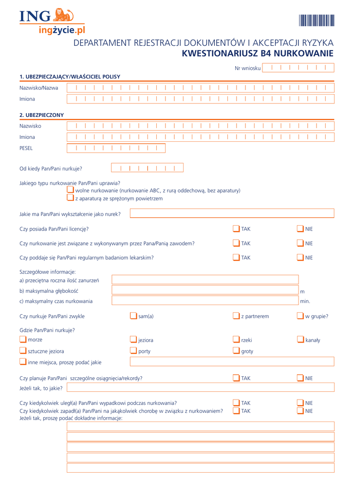 *U006* Departament Rejestracji Dokumentów i Akceptacji Ryzyka Kwestionariusz B4 nurkowanie Nr wniosku | | | | | | | 1. UBEZPIECZAJĄCY/WŁaściciel Polisy Nazwisko/Nazwa | | | | | | | | | | | | | | | | | | | | | | | | | | | | | Imiona | | | | | | | | | | | | | | | | | | | | | | | | | | | | | Nazwisko | | | | | | | | | | | | | | | | | | | | | | | | | | | | | Imiona | | | | | | | | | | | | | | | | | | | | | | | | | | | | | PESEL | | | | | | | | | | | | | | | | | 2. UBEZPIECZONY Od kiedy Pan/Pani nurkuje? Jakiego typu nurkowanie Pan/Pani uprawia? wolne nurkowanie (nurkowanie ABC, z rurą oddechową, bez aparatury) z aparaturą ze sprężonym powietrzem Jakie ma Pan/Pani wykształcenie jako nurek? Czy posiada Pan/Pani licencję? TAK NIE Czy nurkowanie jest związane z wykonywanym przez Pana/Panią zawodem? TAK NIE Czy poddaje się Pan/Pani regularnym badaniom lekarskim? TAK NIE Szczegółowe informacje: a) przeciętna roczna ilość zanurzeń b) maksymalna głębokość m c) maksymalny czas nurkowania Czy nurkuje Pan/Pani zwykle min. sam(a) z partnerem w grupie? morze jeziora rzeki kanały sztuczne jeziora porty groty Gdzie Pan/Pani nurkuje? inne miejsca, proszę podać jakie Czy planuje Pan/Pani szczególne osiągnięcia/rekordy? TAK NIE TAK TAK NIE NIE Jeżeli tak, to jakie? Czy kiedykolwiek uległ(a) Pan/Pani wypadkowi podczas nurkowania? Czy kiedykolwiek zapadł(a) Pan/Pani na jakąkolwiek chorobę w związku z nurkowaniem? Jeżeli tak, proszę podać dokładne informacje: Dalsze informacje, które mogą mieć wpływ na ocenę ryzyka: Potwierdzam, że powyższe dane są kompletne i zgodne z prawdą. Niniejszy dokument jest częścią wniosku o ubezpieczenie. PRZEDSTAWICIEL UBEZPIECZONY Imię i nazwisko (czytelny podpis) Imię i nazwisko (czytelny podpis) | | | | Nr Przedstawiciela Podpis1 Data Podpis Data 1 zgodny ze wzorem podpisu złożonym na wniosku o ubezpieczenie ING Towarzystwo Ubezpieczeń na Życie S.A.; ul. Topiel 12, 00-342 Warszawa; tel. +48 (22) 522 00 00, fax +48 (22) 522 11 11 Sąd Rejonowy dla m.st. Warszawy; XII Wydział Gospodarczy Krajowego Rejestru Sądowego KRS 25443; NIP: 527-10-02-574 Kapitał zakładowy - 41 000 000 zł, wpłacony w całości | | Nr Oddziału