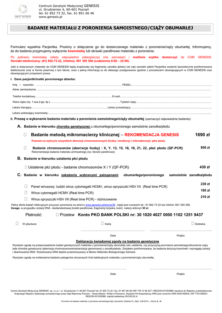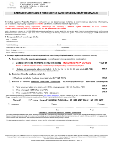 Centrum Genetyki Medycznej GENESIS ul. Grudzieniec 4, 60-601 Poznań tel. 61 852 73 32, fax. 61 851 66 46 www.genesis.pl BADANIE MATERIAŁU Z PORONIENIA SAMOISTNEGO/CIĄŻY OBUMARŁEJ Formularz wypełnia Pacjentka. Prosimy o dołączenie go do dostarczanego materiału z poronienia/ciąży obumarłej. Informujemy, że do badania przyjmujemy wyłącznie kosmówkę lub skrawki parafinowe materiału z poronienia. Po pobraniu kosmówkę należy odpowiednio zabezpieczyć (nie zamrażać) i Kontakt telefoniczny: (61) 852-73-32, infolinia: 601 305 306 (codziennie 8:00 – 22:00). możliwie szybko dostarczyć do CGM GENESIS. Jeśli w doręczonym materiale do CGM GENESIS będą znajdowały się fragmenty zarodka (płodu) lub cały zarodek (płód) Pacjentka zostanie bezzwłocznie poinformowana telefonicznie oraz w formie pisemnej o tym fakcie, wraz z pełną informacją co do dalszego postępowania zgodnie z procedurami obowiązującymi w CGM GENESIS oraz obowiązującymi przepisami prawa. I. Dane pacjentki/matki poronionego dziecka: Imię i nazwisko ………………………………………………………………………………………PESEL:………………………..………………………………………………………. Adres zamieszkania ………………………………………………………………………………………………………………………………………………………………………………… Telefon kontaktowy………………………………………………………………………..……E-mail:……………………………………………………………………..……………………. Która ciąża (np. 1-sza,2-ga, itp.)………………………………………………………………………Tydzień ciąży………………………………………………………..………...…..…… Lekarz kierujący:……………………………………………………………………………Lekarz prowadzący:………………………………………………………………………………… Lekarz pobierający kosmówkę:…………………………………………………………………………………………………………………………………………………………………….. II. Proszę o wykonanie badania materiału z poronienia samoistnego/ciąży obumarłej (zaznaczyć odpowiednie badanie): A. Badanie w kierunku choroby genetycznej u obumarłego/poronionego samoistnie zarodka/płodu Badanie metodą mikromacierzy klinicznej – REKOMENDACJA GENESIS 1690 zł Pozwala na wykrycie wszystkich aberracji chromosomowych (liczby i struktury) i mikroaberracji; płeć płodu Badanie chromosomów (aberracje liczby) : X, Y, 13, 15, 16, 18, 21, 22, płeć płodu (QF-PCR) 850 zł Rekomendacja badania materiału archiwalnego (np. bloczki parafinowe) B. Badanie w kierunku ustalenia płci płodu 430 zł Ustalenie płci płodu - badanie chromosomów X i Y (QF-PCR) C. Badanie w kierunku zakażenia wybranymi patogenami obumarłego/poronionego samoistnie zarodka/płodu 230 zł Panel wirusowy: ludzki wirus cytomegalii HCMV, wirus opryszczki HSV I/II (Real time PCR) 185 zł Wirus cytomegalii HCMV (Real time PCR) 210 zł Wirus opryszczki HSV I/II (Real time PCR) - różnicowanie Pełna oferta badań infekcyjnych przyczyn poronienia na stroni e www.genesis.pl/strona/36 , bądź pod numerem tel.: 61 852 73 32 lub Infolinii: 601 305 306 . Uwaga: w przypadku izolacji DNA niestandardowej (kostki parafinowe, fragmenty łożyska, kość) należy doliczyć 95 zł. Płatność: W placówce Przelew Konto PKO BANK POLSKI nr: 30 1020 4027 0000 1102 1251 9437 Karta Gotówka ……………………………………………………………….. ……………………………………………………………... Data Podpis Deklaracja świadomej zgody na badania genetyczne Wyrażam zgodę na przeprowadzenie badań genetycznych materiału z poronienia/ciąży obumarłej celu ustalenia, czy przyczyną poronienia samoistnego/obumarcia ciąży była choroba genetyczna (aberracja chromosomowa/rearanżacja genomowa) u zarodka/płodu. Zostałam poinformowana, że badania dotyczą kosmówki i wymagają izolacji i zbankowania DNA. Wyizolowany DNA będzie przechowywany w Banku Materiału Biologicznego Genesis. Wyrażam zgodę na molekularne badanie patogenów wirusowych i/lub bakteryjnych materiału z poronienia/ciąży obumarłej. ……………………………………………………………….. …………………………………………………….............. Data Podpis Centra Genetyki Medycznej GENESIS sp. z o.o. / ul. Grudzieniec 4 / 60-601 Poznań/ tel. 61 852 73 32 / fax. 61 851 66 46/ NIP 778 13 56 527 / REGON 631002980 /wpisana do Rejestru przedsiębiorców Krajowego Rejestru Sądowego prowadzonego przez Sąd Rejonowy Poznań – Nowe Miasto i Wilda w Poznaniu, Wydział VIII Gospodarczy KRS pod numerem KRS 0000169935, NIP 7781356527, REGON 631002980, kapitał zakładowy 58.500,00 zł Formularz do badania materiału z poronienia samoistnego/ciąży obumarłej. Wydanie:21, Data: 5.08.2015 r., Strona 1 z 4 Formularz zastępuje wywiad zbierany przez lekarza w poradni genetycznej, dlatego należy dołożyć starań, aby informacje były rzetelne. Będą one analizowane przez lekarza genetyka przy opracowywaniu wyników badania i wydawaniu zaleceń. Jeżeli zabraknie miejsca na formularzu, proszę opisać na dodatkowej kartce. Wszystkie podane informacje i dane osobowe są objęte ścisłą tajemnicą lekarską. III. Dane dotyczące aktualnego poronienia/obumarcia aktualnej ciąży Data i godzina pobrania materiału z poronienia: ………………………………………………………………………………………………………………… Kto pobierał materiał z poronienia: Lekarz w czasie zabiegu Pacjentka po poronieniu jaja płodowego Jak uz