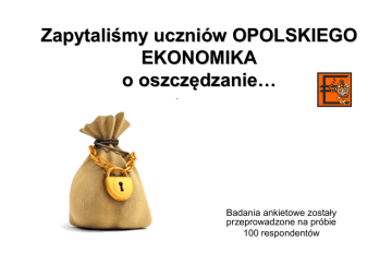 Zapytaliśmy uczniów OPOLSKIEGO EKONOMIKA o oszczędzanie… Badania ankietowe zostały przeprowadzone na próbie 100 respondentów Czy oszczędzanie pieniędzy jest dla mnie ważne ? 60 52 50 40 30 30 20 10 10 5 3 0 1 Zdecydowanie nie zgadzam się Raczej nie zgadzam się Nie mam zdania Raczej zgadzam się Zdecydowanie zgadzam się Nasi ankietowani zdecydowanie uznali, że oszczędzanie pieniędzy jest bardzo ważne. Około 10% respondentów nie przywiązuje wagi do oszczędzania. Z czego to może wynikać? Prawdopodobnie na ten wynik miał wpływ fakt, że niektórzy z Nas nie zarabiają jeszcze samodzielnie pieniędzy, zatem „wartość” pieniądza nie jest im tak dobrze znana. Czy uważasz, że posiadanie konta bankowego w Twoim wieku jest potrzebne? 40 35 37 35 30 25 20 10 12 12 15 4 5 0 1 Zdecydowanie nie zgadzam się Raczej nie zgadzam się Nie mam zdania Zdecydowanie zgadzam się Raczej zgadzam się Prawie połowa ankietowanym twierdzi, że posiadanie konta jest im potrzebne. Niepokojące jest to, że 35% ankietowanych nie ma na ten temat zdania, a 16% twierdzi, że posiadanie konta w ich wieku jest zupełnie niepotrzebne. Oszczędzam tylko wtedy, kiedy potrzebuję zgromadzić pieniądze na jakiś konkretny zakup 38 40 35 30 25 20 17 20 19 15 10 6 5 0 1 Zdecydowanie nie zgadzam się Raczej nie zgadzam się Nie mam zdania Raczej zgadzam się Zdecydowanie zgadzam się Zazwyczaj oszczędzamy kiedy potrzebujemy zgromadzić większą gotówkę na zakup jakiegoś konkretnego produktu. Tutaj ankietowani w większości zgadzają się z tą tezą. Warto dodać, że około 26% nie oszczędza w ten sposób. Pieniądze wydaje według własnych potrzeb, a odkładam to, co ewentualnie zostanie 60 60 50 40 30 21 20 10 9 7 3 0 1 Zdecydowanie nie zgadzam się Raczej nie zgadzam się Nie mam zdania Raczej zgadzam się Zdecydowanie zgadzam się Uczniowie naszej szkoły zdecydowanie wydają praktycznie wszystkie pieniądze, które dostają. Oszczędzamy dopiero wtedy gdy mamy niewielką nadwyżkę. Można założyć, że tendencja ta będzie się zmieniać w momencie kiedy zaczniemy zarabiać większe pieniądze. Czy uważasz, że oszczędzanie na lokacie jest opłacalne ? 39 36 40 35 30 25 17 20 15 10 5 3 5 0 1 Zdecydowanie ni ezgadzam się Raczej nie zgadzam się Nie mam zdania Raczej zgadzam się Zdecydowanie zgadzam się Przekonanie, że oszczędzanie pieniędzy na lokacie jest opłacalne okazało się dominujące wśród uczniów Zespołu Szkół Ekonomicznych. Można domniemywać, że lokaty oszczędnościowe są dla Nas dobrym sposobem nie tylko na oszczędzanie, ale także zarabianie pieniędzy. Opracowanie i przygotowanie: D. Kapinos, M. Skrobek, Ł. Hetman, D. Max