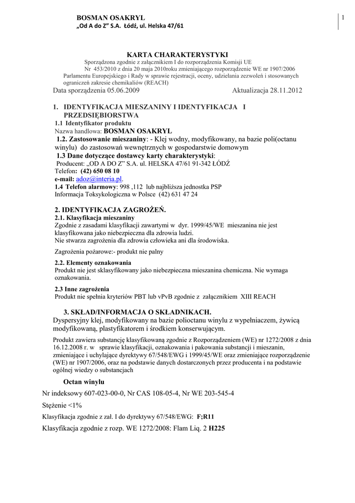 1 BOSMAN OSAKRYL „Od A do Z” S.A. Łódź, ul. Helska 47/61 KARTA CHARAKTERYSTYKI Sporządzona zgodnie z załącznikiem I do rozporządzenia Komisji UE Nr 453/2010 z dnia 20 maja 2010roku zmieniającego rozporządzenie WE nr 1907/2006 Parlamentu Europejskiego i Rady w sprawie rejestracji, oceny, udzielania zezwoleń i stosowanych ograniczeń zakresie chemikaliów (REACH) Data sporządzenia 05.06.2009 Aktualizacja 28.11.2012 1. IDENTYFIKACJA MIESZANINY I IDENTYFIKACJA I PRZEDSIĘBIORSTWA 1.1 Identyfikator produktu Nazwa handlowa: BOSMAN OSAKRYL 1.2. Zastosowanie mieszaniny: - Klej wodny, modyfikowany, na bazie poli(octanu winylu) do zastosowań wewnętrznych w gospodarstwie domowym 1.3 Dane dotyczące dostawcy karty charakterystyki: Producent: „OD A DO Z” S.A. ul. HELSKA 47/61 91-342 ŁÓDŹ Telefon: (42) 650 08 10 e-mail: [email protected]. 1.4 Telefon alarmowy: 998 ,112 lub najbliższa jednostka PSP Informacja Toksykologiczna w Polsce (42) 631 47 24 2. IDENTYFIKACJA ZAGROŻEŃ. 2.1. Klasyfikacja mieszaniny Zgodnie z zasadami klasyfikacji zawartymi w dyr. 1999/45/WE mieszanina nie jest klasyfikowana jako niebezpieczna dla zdrowia ludzi. Nie stwarza zagrożenia dla zdrowia człowieka ani dla środowiska. Zagrożenia pożarowe:- produkt nie palny 2.2. Elementy oznakowania Produkt nie jest sklasyfikowany jako niebezpieczna mieszanina chemiczna. Nie wymaga oznakowania. 2.3 Inne zagrożenia Produkt nie spełnia kryteriów PBT lub vPvB zgodnie z załącznikiem XIII REACH 3. SKŁAD/INFORMACJA O SKŁADNIKACH. Dyspersyjny klej, modyfikowany na bazie polioctanu winylu z wypełniaczem, żywicą modyfikowaną, plastyfikatorem i środkiem konserwującym. Produkt zawiera substancję klasyfikowaną zgodnie z Rozporządzeniem (WE) nr 1272/2008 z dnia 16.12.2008 r. w sprawie klasyfikacji, oznakowania i pakowania substancji i mieszanin, zmieniające i uchylające dyrektywy 67/548/EWG i 1999/45/WE oraz zmieniające rozporządzenie (WE) nr 1907/2006, oraz na podstawie danych dostarczonych przez producenta i na podstawie ogólnej wiedzy o substancjach Octan winylu Nr indeksowy 607-023-00-0, Nr CAS 108-05-4, Nr WE 203-545-4 Stężenie <1% Klasyfikacja zgodnie z zał. I do dyrektywy 67/548/EWG: F;R11 Klasyfikacja zgodnie z rozp. WE 1272/2008: Flam Liq. 2 H225 BOSMAN OSAKRYL „Od A do Z” S.A. Łódź, ul. Helska 47/61 uwaga 4. ŚRODKI PIERWSZEJ POMOCY Zatrucie inhalacyjne W normalnych warunkach produkt nie stanowi zagrożenia. W przypadku złego samopoczucia wyprowadzić osobę poszkodowaną na świeże powietrze, zapewnić spokój, ewentualnie wezwać pomoc medyczną. Skażenie oczu Usunąć szkła kontaktowe, przemyć oczy dużą ilością wody przez ok. 15 minut. Podczas płukania trzymać powieki szeroko otwarte i poruszać gałką oczną (unikać silnego strumienia wody ze względu na ryzyko uszkodzenia rogówki) Zwrócić się o pomoc do lekarza okulisty. Skażenie skóry Zdjąć zanieczyszczoną odzież, skażoną skórę zmyć dokładnie dużą ilością wody, najlepiej bieżącej(nie gorącej). W przypadku utrzymywania się podrażnienia, posmarować skórę kremem i skonsultować się z lekarzem. Spożycie W przypadku połknięcia natychmiast zapewnić pomoc lekarską 5. POSTĘPOWANIE W PRZYPADKU POŻARU Produkt jest nie palną dyspersją wodną. Środki gaśnicze właściwe dla palącego się w otoczeniu materiału. 5.1 Środki gaśnicze : dwutlenek węgla, (gaśnica śniegowa), proszek gaśniczy, prądy wodne rozproszone, piana gaśnicza odporna na działanie alkoholu nie stosować zwartych strumieni wodnych. proszki gaśnicze, piany, rozproszone prądy wodne Nieodpowiednie środki gaśnicze nie stosować zwartych strumieni wody . 5.2 Szczególne zagrożenia związane z substancją lub mieszaniną Zalecenia ogólne: Zawiadomić otoczenie o pożarze. Usunąć z obszaru zagrożenia wszystkie osoby postronne. W razie potrzeby wezwać Straż Pożarną i Policję. Zbiorniki narażone na działanie ognia lub wysokiej temperatury chłodzić wodą z bezpiecznej odległości, a jeżeli to możliwe usunąć je z obszaru zagrożenia. Podczas spalania preparatu powstają dymy zawierające niebezpieczne dla zdrowia substancje chemiczne, m.in. tlenki węgla. 5.3 Informacje dla straży pożarnej -odzież ochronna gazoszczelna, aparat izolujący drogi oddechowe 6. POSTĘPOWANIE W PRZYPADKU NIEZAMIERZONEGO UWOLNIENIA DO ŚRODOWISKA Zalecenia ogólne: Zawiadomić otoczenie o awarii, usunąć z obszaru zagrożenia wszystkie osoby nie biorące udziału w likwidowaniu awarii – w razie potrzeby wezwać ekipy ratownicze – Straż Pożarną i Policję. 6.1 Indywidualne środki ostrożności, wyposażenie ochronne: Ubrania robocze ze zwartej tkaniny, rękawice z tworzywa odpornego na działanie węglowodorów, buty z tworzywa nitrylowego, okulary ochronne w szczelnej obudowie. 6.2 Środki ostrożności w zakresie ochrony środowiska: 2 BOSMAN OSAKRYL „Od A do Z” S.A. Łódź, ul. Helska 47/61 Nie dopuścić do przedostania się do kanalizacji i cieków wodnych. Zabezpieczyć studzienki ściekowe. Nie dopuszczać do zanieczyszczenia wód powierzchniowych i gruntowych lub niżej położonych terenów, jeśli to możliwe, zlikwidować wyciek (np. zamknąć wypływ produktu, uszczelnić uszkodzone opakowanie)Zabezpieczyć studzienki ściekowe. W przypadku skażenia wód powiadomić odpowiednie władze. 6.3 Metody i materiały zapobiegające rozprzestrzenianiu się skażenia: Zabezpieczyć uszkodzone opakowania, zebraną przy pomocy piasku, trocin, ziemi okrzemkowej ze środowiska ciecz umieścić w opakowaniu zastępczym i skierować do zniszczenia. 7. POSTĘPOWANIE Z MIESZANINAMI ORAZ ICH MAGAZYNOWANIE 7.1 Środki ostrożności dotyczące bezpiecznego postępowania Chronić oczy, skórę i odzież przed kontaktem z produktem. Nie wdychać oparów. Nie jeść, nie pić podczas stosowania preparatu. Nosić odpowiednią odzież ochronną. Pracować w dobrze wentylowanych pomieszczeniach. Przestrzegać podstawowy