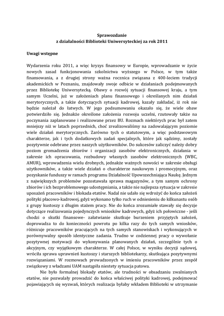 Sprawozdanie z działalności Biblioteki Uniwersyteckiej za rok 2011 Uwagi wstępne Wydarzenia roku 2011, a więc kryzys finansowy w Europie, wprowadzanie w życie nowych zasad funkcjonowania szkolnictwa wyższego w Polsce, w tym także finansowania, a z drugiej strony ważna rocznica związana z 400-leciem tradycji akademickich w Poznaniu, znajdowały swoje odbicie w działaniach podejmowanych przez Bibliotekę Uniwersytecką. Obawy o rozwój sytuacji finansowej kraju, a tym samym Uczelni, już w założeniach planu finansowego i określanych nim działań merytorycznych, a także dotyczących sytuacji kadrowej, kazały zakładać, iż rok nie będzie należał do łatwych. W jego podsumowaniu okazało się, że wiele obaw potwierdziło się. Jednakże określone założenia rozwoju uczelni, rzutowały także na poczynania zaplanowane i realizowane przez BU. Rozmach niektórych prac był zatem mniejszy niż w latach poprzednich, choć zrealizowaliśmy na zadowalającym poziomie wiele działań merytorycznych. Zarówno tych o statutowym, a więc podstawowym charakterze, jak i tych dodatkowych zadań specjalnych, które jak sądzimy, zostały pozytywnie odebrane przez naszych użytkowników. Do sukcesów zaliczyć należy dobry poziom gromadzenia zbiorów i organizacji zasobów elektronicznych, działania w zakresie ich opracowania, rozbudowy własnych zasobów elektronicznych (WBC, AMUR), wprowadzenia wielu drobnych, jednakże ważnych nowości w zakresie obsługi użytkowników, a także wiele działań o charakterze naukowym i promocyjnym, oraz pozyskanie funduszy w ramach programu Działalność Upowszechniająca Naukę. Jednym z największych problemów pozostawała sprawa magazynów, a tym samym ochrony zbiorów i ich bezproblemowego udostępniania, a także nie najlepsza sytuacja w zakresie uposażeń pracowników i blokada etatów. Nadal nie udało się wdrożyć do końca założeń polityki płacowo-kadrowej, gdyż wykonano tylko ruch w odniesieniu do kilkunastu osób z grupy kustoszy z długim stażem pracy. Nie do końca zrozumiałe stawały się decyzje dotyczące realizowania pojedynczych wniosków kadrowych, gdyż ich połowiczne - jeśli chodzi o skutki finansowe- załatwianie skutkuje burzeniem przyjętych założeń, doprowadza to do konieczności powrotu po kilka razy do tych samych wniosków, różnicuje pracowników pracujących na tych samych stanowiskach i wykonujących w porównywalny sposób identyczne zadania. Trudno w codziennej pracy o wywołanie pozytywnej motywacji do wykonywania planowanych działań, szczególnie tych o akcyjnym, czy wyjątkowym charakterze. W całej Polsce, w wyniku decyzji sądowej, wróciła sprawa uprawnień kustoszy i starszych bibliotekarzy, skutkująca pozytywnymi rozwiązaniami. W rozmowach prowadzonych w imieniu pracowników przez zespół związkowy z władzami UAM nastąpiła niestety sytuacja patowa. Nie było formalnej blokady etatów, ale trudności w obsadzaniu zwalnianych etatów, nie pozwalały prowadzić do końca właściwej polityki kadrowej, podejmować pojawiających się wyzwań, których realizacja byłaby wkładem Biblioteki w utrzymanie wysokiej pozycji UAM w rankingach. Trudno realizować bezproblemowo zadania zwłaszcza w zakresie obsługi użytkowników, ale także organizacji zasobów, czy promocji zbiorów. Podjęte działania reorganizacyjne - jako realizacja zasad nowoczesnego zarządzania - miały nie tylko usprawniać działanie Biblioteki, pozwalać na elastyczne reagowanie na potrzeby otoczenia, ale także przyczyniać się do minimalizowania kosztów jej funkcjonowania. Wspomniana sytuacja finansowa skutkowała przyznaniem Bibliotece niższych niż w roku 2010 środków budżetowych. To nakazywało prowadzenie polityki oszczędnościowej, skrupulatnego przestrzegania dyscypliny budżetowej. Budżet nie został wykorzystany w 100%, ale zrealizowany w stopniu znacznie wyższym niż w roku ubiegłym. Oszczędności generowały wspomniane decyzje dotyczące polityki kadrowej, ale też rozszerzony, centralny zakup kilku podstawowych baz danych. Nie brakowało środków na utrzymanie gromadzenia i organizacji dostępów do zasobów na wysokim poziomie. Gorzej przedstawiała się sytuacja w zakresie zakupu sprzętu, wyposażenia, realizacji drobnych remontów, które niestety musimy (o ile to możliwe) pokrywać ze środków budżetowych lub skromnych dochodów własnych. Nie są one wysokie, a podejmowane działania zmniejszają wpływy w dość ważnym źródle jakim są opłaty karne, co paradoksalnie z drugiej strony nas cieszy. Motywowało to do szukania innych dochodów (intensyfikacja sprzedaży wydawnictw własnych, wykonywanie usług mikrofilmowych, konserwatorskich, introligatorskich). Zasadniczą zmianę w tym zakresie stanowiło uruchomienie specjalnej ścieżki finansowania działań bibliotecznych, w ramach programu DUN. Trzy złożone projekty uzyskały akceptację, i zostały przyjęte do realizacji. W roku sprawozdawczym spłynęły środki pozwalające podjąć realizację pierwszego z nich, tj. digitalizację katalogu kartkowego. Dzięki temu w końcu roku 2013 powinniśmy elektronicznie informować o pełnym zasobie książek i czasopism (poza zbiorami specjalnymi). Mankamentem DUNów jest brak możliwości finansowania zakupów sprzętowych, co jest ważne w związku ze złym stanem sprzętu do mikrofilmowania, digitalizacji, czy obsługi użytkowników. Mimo składanych obietnic i deklaracji opłacenia w 1/3 kosztów zakupu skanerów samoobsługowych, nie otrzymaliśmy ze środków inwestycyjnych UAM pieniędzy na ich nabycie. Podobnie problem nierozwiązany stanowi brak zakupu serwera, na którym posadowiony jest program umożliwiający zdalne korzystanie z e-źródeł. Stąd podejmowane, na razie bez rezultatu starania, o wpisanie takich zakupów do dużych projektów ogólnouczelnianych, które BU może i chce współrealizować (np. zakup kamer do digitalizacji w projektach zakładaj