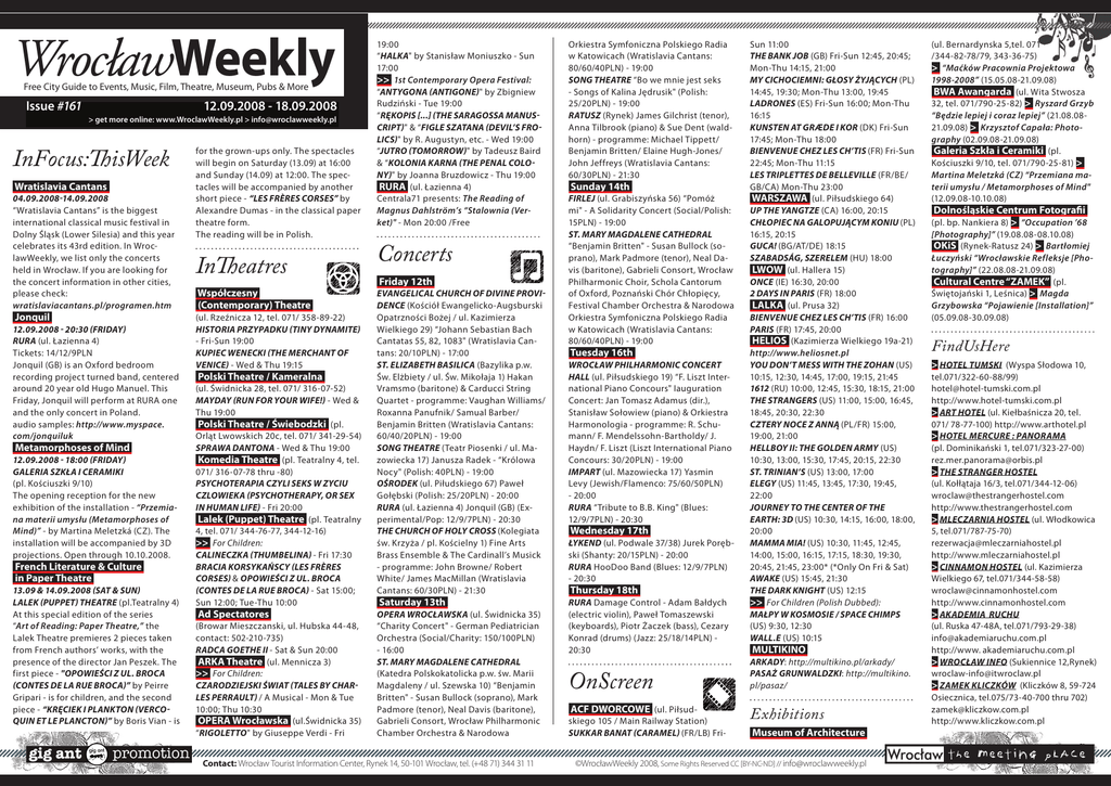 WrocławWeekly Free City Guide to Events, Music, Film, Theatre, Museum, Pubs & More Issue #161 12.09.2008 - 18.09.2008 > get more online: www.WroclawWeekly.pl > [email protected] InFocus:ThisWeek Wratislavia Cantans 04.09.2008-14.09.2008 “Wratislavia Cantans” is the biggest international classical music festival in Dolny Śląsk (Lower Silesia) and this year celebrates its 43rd edition. In WroclawWeekly, we list only the concerts held in Wrocław. If you are looking for the concert information in other cities, please check: wratislaviacantans.pl/programen.htm Jonquil 12.09.2008 - 20:30 (Friday) RURA (ul. Łazienna 4) Tickets: 14/12/9PLN Jonquil (GB) is an Oxford bedroom recording project turned band, centered around 20 year old Hugo Manuel. This Friday, Jonquil will perform at RURA one and the only concert in Poland. audio samples: http://www.myspace. com/jonquiluk Metamorphoses of Mind 12.09.2008 - 18:00 (Friday) Galeria Szkła i Ceramiki (pl. Kościuszki 9/10) The opening reception for the new exhibition of the installation - “Przemiana materii umysłu (Metamorphoses of Mind)” - by Martina Meletzká (CZ). The installation will be accompanied by 3D projections. Open through 10.10.2008. French Literature & Culture in Paper Theatre 13.09 & 14.09.2008 (Sat & Sun) Lalek (Puppet) Theatre (pl.Teatralny 4) At this special edition of the series “Art of Reading: Paper Theatre,” the Lalek Theatre premieres 2 pieces taken from French authors’ works, with the presence of the director Jan Peszek. The first piece - "Opowieści z ul. Broca (Contes de la rue Broca)” by Peirre Gripari - is for children, and the second piece - “Kręciek i plankton (Vercoquin et le plancton)” by Boris Vian - is for the grown-ups only. The spectacles will begin on Saturday (13.09) at 16:00 and Sunday (14.09) at 12:00. The spectacles will be accompanied by another short piece - “Les frères corses” by Alexandre Dumas - in the classical paper theatre form. The reading will be in Polish. InTheatres Współczesny (Contemporary) Theatre (ul. Rzeźnicza 12, tel. 071/ 358-89-22) Historia przypadku (Tiny Dynamite) - Fri-Sun 19:00 Kupiec wenecki (The Merchant of Venice) - Wed & Thu 19:15 Polski Theatre / Kameralna (ul. Świdnicka 28, tel. 071/ 316-07-52) Mayday (Run for Your Wife!) - Wed & Thu 19:00 Polski Theatre / Świebodzki (pl. Orląt Lwowskich 20c, tel. 071/ 341-29-54) Sprawa Dantona - Wed & Thu 19:00 Komedia Theatre (pl. Teatralny 4, tel. 071/ 316-07-78 thru -80) Psychoterapia czyli seks w zyciu czlowieka (Psychotherapy, or sex in human life) - Fri 20:00 Lalek (Puppet) Theatre (pl. Teatralny 4, tel. 071/ 344-76-77, 344-12-16) >> For Children: Calineczka (Thumbelina) - Fri 17:30 Bracia korsykańscy (Les frères corses) & Opowieści z ul. Broca (Contes de la rue Broca) - Sat 15:00; Sun 12:00; Tue-Thu 10:00 Ad Spectatores (Browar Mieszczanski, ul. Hubska 44-48, contact: 502-210-735) Radca Goethe II - Sat & Sun 20:00 ARKA Theatre (ul. Mennicza 3) >> For Children: Czarodziejski Świat (Tales by Charles Perrault) / A Musical - Mon & Tue 10:00; Thu 10:30 OPERA Wrocławska (ul.Świdnicka 35) “Rigoletto" by Giuseppe Verdi - Fri 19:00 “Halka" by Stanisław Moniuszko - Sun 17:00 >> 1st Contemporary Opera Festival: “Antygona (Antigone)" by Zbigniew Rudziński - Tue 19:00 “Rękopis [...] (The Saragossa Manuscript)" & “Figle szatana (Devil’s Frolics)" by R. Augustyn, etc. - Wed 19:00 “Jutro (Tomorrow)" by Tadeusz Baird & “Kolonia karna (The Penal Colony)" by Joanna Bruzdowicz - Thu 19:00 RURA (ul. Łazienna 4) Centrala71 presents: The Reading of Magnus Dahlström’s “Stalownia (Verket)" - Mon 20:00 /Free Concerts Friday 12th EVANGELICAL CHURCH OF DIVINE PROVIDENCE (Kościół Ewangelicko-Augsburski Opatrzności Bożej / ul. Kazimierza Wielkiego 29) “Johann Sebastian Bach Cantatas 55, 82, 1083" (Wratislavia Cantans: 20/10PLN) - 17:00 ST. ELIZABETH BASILICA (Bazylika p.w. Św. Elżbiety / ul. Św. Mikołaja 1) Hakan Vramsmo (baritone) & Carducci String Quartet - programme: Vaughan Williams/ Roxanna Panufnik/ Samual Barber/ Benjamin Britten (Wratislavia Cantans: 60/40/20PLN) - 19:00 SONG THEATRE (Teatr Piosenki / ul. Mazowiecka 17) Janusza Radek - “Królowa Nocy" (Polish: 40PLN) - 19:00 OŚRODEK (ul. Piłudskiego 67) Paweł Gołębski (Polish: 25/20PLN) - 20:00 RURA (ul. Łazienna 4) Jonquil (GB) (Experimental/Pop: 12/9/7PLN) - 20:30 THE CHURCH OF HOLY CROSS (Kolegiata św. Krzyża / pl. Kościelny 1) Fine Arts Brass Ensemble & The Cardinall’s Musick - programme: John Browne/ Robert White/ James MacMillan (Wratislavia Cantans: 60/30PLN) - 21:30 Saturday 13th OPERA WROCŁAWSKA (ul. Świdnicka 35) “Charity Concert" - German Pediatrician Orchestra (Social/Charity: 150/100PLN) - 16:00 ST. MARY MAGDALENE CATHEDRAL (Katedra Polskokatolicka p.w. św. Marii Magdaleny / ul. Szewska 10) “Benjamin Britten" - Susan Bullock (soprano), Mark Padmore (tenor), Neal Davis (baritone), Gabrieli Consort, Wrocław Philharmonic Chamber Orchestra & Narodowa Contact: Wrocław Tourist Information Center, Rynek 14, 50-101 Wrocław, tel. (+48 71) 344 31 11 Orkiestra Symfoniczna Polskiego Radia w Katowicach (Wratislavia Cantans: 80/60/40PLN) - 19:00 SONG THEATRE “Bo we mnie jest seks - Songs of Kalina Jędrusik" (Polish: 25/20PLN) - 19:00 RATUSZ (Rynek) James Gilchrist (tenor), Anna Tilbrook (piano) & Sue Dent (waldhorn) - programme: Michael Tippett/ Benjamin Britten/ Elaine Hugh-Jones/ John Jeffreys (Wratislavia Cantans: 60/30PLN) - 21:30 Sunday 14th FIRLEJ (ul. Grabiszyńska 56) “Pomóż mi" - A Solidarity Concert (Social/Polish: 15PLN) - 19:00 ST. MARY MAGDALENE CATHEDRAL “Benjamin Britten" - Susan Bullock (soprano), Mark Padmore (tenor), Neal Davis (baritone), Gabrieli Consort, Wrocław Philharmonic Choir, Schola Cantorum of Oxford, Poznański Chór Chłopięcy, Festival Chamber Orchestra & Narodowa Orkiestra Symfoniczna Polskiego Radia w Katowicach (Wratislavia Cantans: 80/60/40PLN) - 19:00 Tuesday 16th WRO