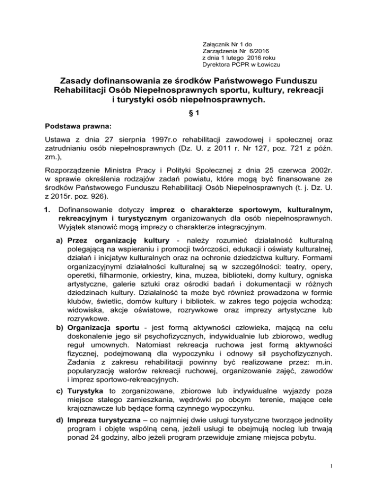 Załącznik Nr 1 do Zarządzenia Nr 6/2016 z dnia 1 lutego 2016 roku Dyrektora PCPR w Łowiczu Zasady dofinansowania ze środków Państwowego Funduszu Rehabilitacji Osób Niepełnosprawnych sportu, kultury, rekreacji i turystyki osób niepełnosprawnych. §1 Podstawa prawna: Ustawa z dnia 27 sierpnia 1997r.o rehabilitacji zawodowej i społecznej oraz zatrudnianiu osób niepełnosprawnych (Dz. U. z 2011 r. Nr 127, poz. 721 z późn. zm.), Rozporządzenie Ministra Pracy i Polityki Społecznej z dnia 25 czerwca 2002r. w sprawie określenia rodzajów zadań powiatu, które mogą być finansowane ze środków Państwowego Funduszu Rehabilitacji Osób Niepełnosprawnych (t. j. Dz. U. z 2015r. poz. 926). 1. Dofinansowanie dotyczy imprez o charakterze sportowym, kulturalnym, rekreacyjnym i turystycznym organizowanych dla osób niepełnosprawnych. Wyjątek stanowić mogą imprezy o charakterze integracyjnym. a) Przez organizację kultury - należy rozumieć działalność kulturalną polegającą na wspieraniu i promocji twórczości, edukacji i oświaty kulturalnej, działań i inicjatyw kulturalnych oraz na ochronie dziedzictwa kultury. Formami organizacyjnymi działalności kulturalnej są w szczególności: teatry, opery, operetki, filharmonie, orkiestry, kina, muzea, biblioteki, domy kultury, ogniska artystyczne, galerie sztuki oraz ośrodki badań i dokumentacji w różnych dziedzinach kultury. Działalność ta może być również prowadzona w formie klubów, świetlic, domów kultury i bibliotek. w zakres tego pojęcia wchodzą: widowiska, akcje oświatowe, rozrywkowe oraz imprezy artystyczne lub rozrywkowe. b) Organizacja sportu - jest formą aktywności człowieka, mającą na celu doskonalenie jego sił psychofizycznych, indywidualnie lub zbiorowo, według reguł umownych. Natomiast rekreacja ruchowa jest formą aktywności fizycznej, podejmowaną dla wypoczynku i odnowy sił psychofizycznych. Zadania z zakresu rehabilitacji powinny być realizowane przez: m.in. popularyzację walorów rekreacji ruchowej, organizowanie zajęć, zawodów i imprez sportowo-rekreacyjnych. c) Turystyka to zorganizowane, zbiorowe lub indywidualne wyjazdy poza miejsce stałego zamieszkania, wędrówki po obcym terenie, mające cele krajoznawcze lub będące formą czynnego wypoczynku. d) Impreza turystyczna – co najmniej dwie usługi turystyczne tworzące jednolity program i objęte wspólną ceną, jeżeli usługi te obejmują nocleg lub trwają ponad 24 godziny, albo jeżeli program przewiduje zmianę miejsca pobytu. 1 e) Wycieczka – rodzaj imprezy turystycznej, której program obejmuje zmianę miejsca pobytu jej uczestników. §2 1. O dofinansowanie organizacji sportu, kultury, rekreacji i turystyki osób niepełnosprawnych ze środków Funduszu mogą ubiegać się osoby prawne i jednostki organizacyjne nieposiadające osobowości prawnej, jeżeli: a) prowadzą działalność na rzecz osób niepełnosprawnych przez okres co najmniej 2 lat przed dniem złożenia wniosku; b) udokumentują zapewnienie odpowiednich do potrzeb osób niepełnosprawnych warunków technicznych i lokalowych do realizacji zadania; c) udokumentują posiadanie środków własnych lub pozyskanych z innych źródeł na sfinansowanie przedsięwzięcia w wysokości nieobjętej dofinansowaniem ze środków Funduszu. 2. Dofinansowanie organizacji sportu, kultury, niepełnosprawnych nie jest możliwe, jeżeli: rekreacji i turystyki osób a) wnioskodawca ma zaległości wobec Funduszu; b) w ciągu 3 lat przed złożeniem wniosku wnioskodawca był stroną umowy o dofinansowanie ze środków Funduszu, rozwiązanej z przyczyn leżących po stronie wnioskodawcy. 3. Przyznanie dofinansowania następuje na pisemny wniosek złożony, na odpowiednim formularzu do Powiatowego Centrum Pomocy Rodzinie, właściwego dla: a) miejsca zamieszkania – w przypadku osoby niepełnosprawnej, b) siedziby albo miejsca prowadzenia działalności – w przypadku osoby fizycznej prowadzącej działalność gospodarczą, osoby prawnej i jednostki organizacyjnej nieposiadającej osobowości prawnej, Wniosek o dofinansowanie ze środków Funduszu składa się w terminie do 30 listopada roku poprzedzającego realizację zadania. 4. Wnioski są rozpatrywane na bieżąco po otrzymaniu środków Funduszu. 5. Wnioski mogą dotyczyć osób niepełnosprawnych zamieszkałych na terenie Powiatu Łowickiego. 6. Wnioski o udzielenie dofinansowania ostemplowane pieczątką wnioskodawcy oraz pieczątkami imiennymi osób upoważnionych do składania oświadczeń woli w zakresie praw i obowiązków majątkowych wnioskodawcy należy składać do Powiatowego Centrum Pomocy Rodzinie w Łowiczu wraz z kompletem wymaganych załączników. 7. Wnioskodawcy nie posiadający osobowości prawnej składają wnioski wraz z opinią i pełnomocnictwem swych organów nadrzędnych. 8. Nie podlegają rozpatrzeniu wnioski: niekompletne, 2 9. wnioskodawców, którzy w ciągu trzech lat przed złożeniem wniosku, byli stroną umowy z Funduszem i rozwiązanej z przyczyn leżących po stronie wnioskodawcy, wnioskodawców posiadających zaległości wobec Funduszu. W przypadku złożenia wniosków niekompletnych PCPR w Łowiczu w ciągu 10 dni od daty otrzymania wniosku powiadamia pisemnie wnioskodawców o zakresie i terminie uzupełnienia dokumentacji. Nie uzupełnienie wniosku w ciągu 30 dni powoduje pozostawienie wniosku bez rozpatrzenia. 10. W przypadku, gdy złożone dokumenty nie w pełni potwierdzają konieczność udzielenia dofinansowania PCPR w Łowiczu może wezwać wnioskodawców do złożenie dodatkowych dokumentów i udzielenia potrzebnych informacji w sprawie przedmiotu wniosku. §3 1. Wysokość dofinansowania wynosi do 60% kosztów przedsięwzięci pod warunkiem posiadania przez wnioskodawcę pozostałych 40% środków własnych lub pozyskanych z innych źródeł. 2. Dofinansowanie nie może obejmować kosztów realizacji zadania poniesionych przed przyznaniem środków finansowych