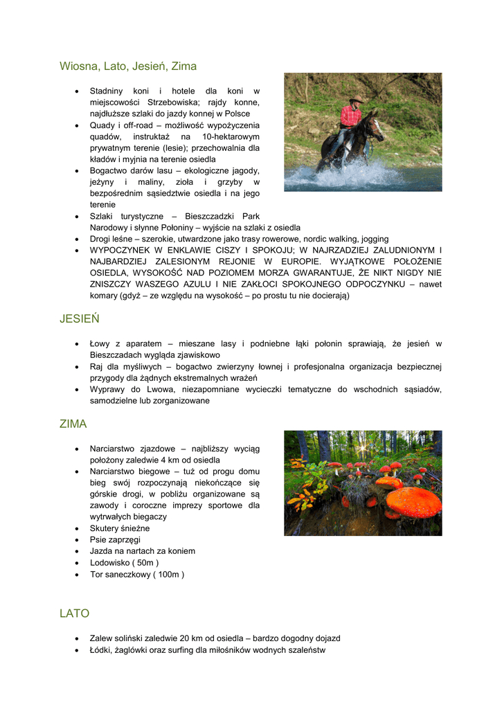 Wiosna, Lato, Jesień, Zima • • • • • • Stadniny koni i hotele dla koni w miejscowości Strzebowiska; rajdy konne, najdłuższe szlaki do jazdy konnej w Polsce Quady i off-road – możliwość wypożyczenia quadów, instruktaż na 10-hektarowym prywatnym terenie (lesie); przechowalnia dla kładów i myjnia na terenie osiedla Bogactwo darów lasu – ekologiczne jagody, jeżyny i maliny, zioła i grzyby w bezpośrednim sąsiedztwie osiedla i na jego terenie Szlaki turystyczne – Bieszczadzki Park Narodowy i słynne Połoniny – wyjście na szlaki z osiedla Drogi leśne – szerokie, utwardzone jako trasy rowerowe, nordic walking, jogging WYPOCZYNEK W ENKLAWIE CISZY I SPOKOJU; W NAJRZADZIEJ ZALUDNIONYM I NAJBARDZIEJ ZALESIONYM REJONIE W EUROPIE. WYJĄTKOWE POŁOŻENIE OSIEDLA, WYSOKOŚĆ NAD POZIOMEM MORZA GWARANTUJE, ŻE NIKT NIGDY NIE ZNISZCZY WASZEGO AZULU I NIE ZAKŁOCI SPOKOJNEGO ODPOCZYNKU – nawet komary (gdyż – ze względu na wysokość – po prostu tu nie docierają) JESIEŃ • • • Łowy z aparatem – mieszane lasy i podniebne łąki połonin sprawiają, że jesień w Bieszczadach wygląda zjawiskowo Raj dla myśliwych – bogactwo zwierzyny łownej i profesjonalna organizacja bezpiecznej przygody dla żądnych ekstremalnych wrażeń Wyprawy do Lwowa, niezapomniane wycieczki tematyczne do wschodnich sąsiadów, samodzielne lub zorganizowane ZIMA • • • • • • • Narciarstwo zjazdowe – najbliższy wyciąg położony zaledwie 4 km od osiedla Narciarstwo biegowe – tuż od progu domu bieg swój rozpoczynają niekończące się górskie drogi, w pobliżu organizowane są zawody i coroczne imprezy sportowe dla wytrwałych biegaczy Skutery śnieżne Psie zaprzęgi Jazda na nartach za koniem Lodowisko ( 50m ) Tor saneczkowy ( 100m ) LATO • • Zalew soliński zaledwie 20 km od osiedla – bardzo dogodny dojazd Łódki, żaglówki oraz surfing dla miłośników wodnych szaleństw