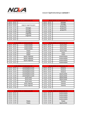 Liceum Ogólnokształcące semestr I 27.02.2016 ul. Krakowska 31 08:00 - 08:45 08:50 - 09:35 09:40 - 10:25 10:30 - 11:15 11:20 - 12.05 12:10 - 12.55 13:00 - 13:45 13:50 - 14:35 28.02.2016 ul. Krakowska 31 biologia 08:50 - 09:35 biologia 09:40 - 10:25 geografia 10:30 - 11:15 geografia 11:20 - 12.05 geografia 08:00 - 08:45 zajęcia organizacyjne biologia biologia biologia angielski angielski 12:10 - 12.55 13:00 - 13:45 13:50 - 14:35 14:40 - 15:25 14:40 - 15:25 15:30 - 16:15 15:30 - 16:15 12.03.2016 ul. Krakowska 31 matematyka 08:50 - 09:35 matematyka 09:40 - 10:25 matematyka 10:30 - 11:15 fizyka 11:20 - 12.05 fizyka 12:10 - 12.55 fizyka 13:00 - 13:45 Język angielski 13:50 - 14:35 Język angielski 14:40 - 15:25 Język angielski 08:00 - 08:45 15:30 - 16:15 2.04.2016 ul. Krakowska 31 przedsiębiorczość 08:50 - 09:35 przedsiębiorczość 09:40 - 10:25 przedsiębiorczość 10:30 - 11:15 przedsiębiorczość 11:20 - 12.05 przedsiębiorczość 12:10 - 12.55 13:50 - 14:35 14:40 - 15:25 15:30 - 16:15 język polski język polski język polski Język angielski Język angielski 16:20 - 17:05 08:00 - 08:45 08:50 - 09:35 09:40 - 10:25 10:30 - 11:15 12:10 - 12.55 09:40 - 10:25 10:30 - 11:15 11:20 - 12.05 12:10 - 12.55 13:00 - 13:45 13:50 - 14:35 14:40 - 15:25 Język polski Język polski Język polski Język polski fizyka fizyka matematyka matematyka matematyka matematyka 03.04.2016 ul. Krakowska 31 historia 08:50 - 09:35 historia 09:40 - 10:25 historia 10:30 - 11:15 Język polski 11:20 - 12.05 Język polski 12:10 - 12.55 Język polski 13:00 - 13:45 Język polski 13:50 - 14:35 chemia 14:40 - 15:25 chemia 15:30 - 16:15 chemia 08:00 - 08:45 16:20 - 17:05 16.04.2016 ul. Krakowska 31 11:20 - 12.05 08:50 - 09:35 15:30 - 16:15 08:00 - 08:45 13:00 - 13:45 13.03.2016 ul. Krakowska 31 08:00 - 08:45 fizyka fizyka 17.04..2016 ul. Krakowska 31 08:00 - 08:45 matematyka 08:50 - 09:35 matematyka 09:40 - 10:25 matematyka 10:30 - 11:15 matematyka 11:20 - 12.05 fizyka 12:10 - 12.55 Język polski 13:00 - 13:45 13:50 - 14:35 14:40 - 15:25 15:30 - 16:15 16:20 - 17:05 17.10 - 17:55 18.00 – 18.45 18.50 – 19.35 19.40 – 20.25 matematyka matematyka matematyka matematyka podstawy przedsiębiorczości podstawy przedsiębiorczości podstawy przedsiębiorczości podstawy przedsiębiorczości podstawy przedsiębiorczości 7.05.2016 ul. Krakowska 31 08:00 - 08:45 historia 08:50 - 09:35 historia 09:40 - 10:25 historia 10:30 - 11:15 angielski 11:20 - 12.05 angielski 12:10 - 12.55 chemia 13:00 - 13:45 chemia 13:50 - 14:35 chemia 13:00 - 13:45 13:50 - 14:35 14:40 - 15:25 15:30 - 16:15 16:20 - 17:05 Język polski Język polski chemia chemia chemia 17.10 - 17:55 18.00 – 18.45 18.50 – 19.35 19.40 – 20.25 15:30 - 16:15 8.05.2016 ul. Krakowska 31 08:00 - 08:45 historia 08:50 - 09:35 historia 09:40 - 10:25 historia 10:30 - 11:15 historia 11:20 - 12.05 polski 12:10 - 12.55 polski 13:00 - 13:45 polski 13:50 - 14:35 chemia 14:40 - 15:25 chemia 15:30 - 16:15 chemia 16:20 - 17:05 16:20 - 17:05 14:40 - 15:25 21.05.2016 ul. Krakowska 31 22.05.2016 ul. Krakowska 31 08:00 - 08:45 08:00 - 08:45 08:50 - 09:35 08:50 - 09:35 09:40 - 10:25 09:40 - 10:25 10:30 - 11:15 10:30 - 11:15 11:20 - 12.05 11:20 - 12.05 12:10 - 12.55 13:00 - 13:45 13:50 - 14:35 14:40 - 15:25 15:30 - 16:15 16:20 - 17:05 17.10 - 17:55 18.00 – 18.45 18.50 – 19.35 19.40 – 20.25 12:10 - 12.55 Język angielski Język angielski Język angielski Język angielski podstawy przedsiębiorczości podstawy przedsiębiorczości podstawy przedsiębiorczości podstawy przedsiębiorczości podstawy przedsiębiorczości 28.05.2016 ul. Krakowska 31 08:00 - 08:45 08:50 - 09:35 09:40 - 10:25 10:30 - 11:15 13:50 - 14:35 Język angielski Język angielski Język angielski Język angielski 14:40 - 15:25 język polski 11:20 - 12.05 12:10 - 12.55 13:00 - 13:45 13:00 - 13:45 13:50 - 14:35 14:40 - 15:25 15:30 - 16:15 historia historia historia biologia biologia biologia geografia geografia 16:20 - 17:05 17.10 - 17:55 18.00 – 18.45 18.50 – 19.35 19.40 – 20.25 29.05.2016 LO2 – gen. K Pułaskiego 3, sala 7 08:00 - 08:45 historia 08:50 - 09:35 historia 09:40 - 10:25 historia 10:30 - 11:15 matematyka 11:20 - 12.05 matematyka 12:10 - 12.55 matematyka 13:00 - 13:45 matematyka 13:50 - 14:35 fizyka 14:40 - 15:25 fizyka 15:30 - 16:15 16:20 - 17:05 17.10 - 17:55 18.00 – 18.45 18.50 – 19.35 język polski język polski chemia chemia chemia 15:30 - 16:15 16:20 - 17:05 17.10 - 17:55 18.00 – 18.45 18.50 – 19.35 11.06.2016 ul. Krakowska 31 13:50 – 14:35 14:40 - 15:25 15:30 - 16:15 16:20 - 17:05 17.10 - 17:55 18.00 – 18.45 18.50 – 19.35 geografia geografia geografia biologia biologia biologia biologia 19.40 – 20.25 08:00 - 08:45 08:50 - 09:35 09:40 - 10:25 10:30 - 11:15 11:20 - 12.05 12:10 - 12.55 13:50 - 14:35 14:40 - 15:25 15:30 - 16:15 16:20 - 17:05 17.10 - 17:55 18.00 – 18.45 18.50 – 19.35 19.40 – 20.25 1 2 3 4 5 6 7 8 9 14:40 - 15:25 15:30 - 16:15 16:20 - 17:05 17.10 - 17:55 18.00 – 18.45 18.50 – 19.35 19.40 – 20.25 18.06.2016 ul. Krakowska 31 13:00 - 13:45 13:50 - 14:35 Język angielski Język angielski Język angielski Język angielski podstawy przedsiębiorczości podstawy przedsiębiorczości podstawy przedsiębiorczości podstawy przedsiębiorczości podstawy przedsiębiorczości 19.06.2016 ul. Krakowska 31 08:00 - 08:45 historia 08:50 - 09:35 historia 09:40 - 10:25 historia 10:30 - 11:15 historia 11:20 - 12.05 geografia 12:10 - 12.55 geografia 13:00 - 13:45 biologia 13:50 - 14:35 biologia 14:40 - 15:25 biologia 15:30 - 16:15 16:20 - 17:05 17.10 - 17:55 18.00 – 18.45 18.50 – 19.35 19.40 – 20.25 Przedmiot egzamin język polski 20 pisemny i ustny język angielski 22 pisemny i ustny historia 20 pisemny podstawy przedsiębiorczości 20 pisemny geografia 10 pisemny biologia 15 pisemny chemia 15 pisemny fizyka 10 pisemny matematyka 20 pisemny i ustny razem 152 wykładowca Barbara Kurowska Marek Golec Joanna Madeja Przemysław Żarnecki Dominika Antczak Dominika Antczak 