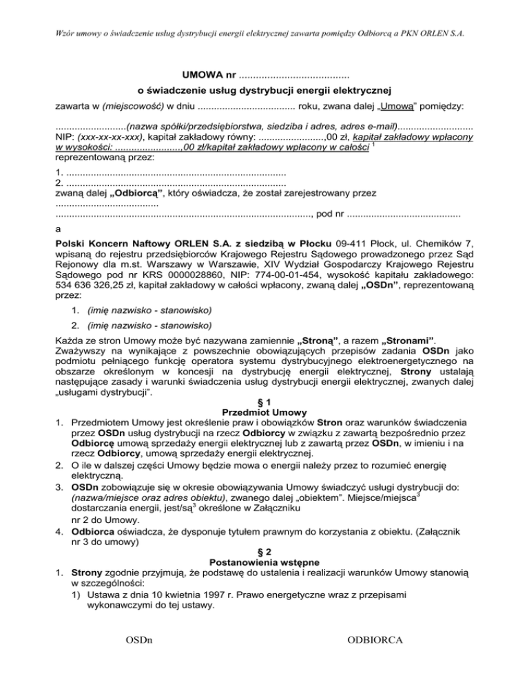Wzór umowy o świadczenie usług dystrybucji energii elektrycznej zawarta pomiędzy Odbiorcą a PKN ORLEN S.A. UMOWA nr ....................................... o świadczenie usług dystrybucji energii elektrycznej zawarta w (miejscowość) w dniu .................................... roku, zwana dalej „Umową” pomiędzy: ..........................(nazwa spółki/przedsiębiorstwa, siedziba i adres, adres e-mail)............................ NIP: (xxx-xx-xx-xxx), kapitał zakładowy równy: ........................,00 zł, kapitał zakładowy wpłacony w wysokości: ........................,00 zł/kapitał zakładowy wpłacony w całości 1 reprezentowaną przez: 1. ................................................................................. 2. ................................................................................. zwaną dalej „Odbiorcą”, który oświadcza, że został zarejestrowany przez ...................................... .............................................................................................., pod nr .......................................... a Polski Koncern Naftowy ORLEN S.A. z siedzibą w Płocku 09-411 Płock, ul. Chemików 7, wpisaną do rejestru przedsiębiorców Krajowego Rejestru Sądowego prowadzonego przez Sąd Rejonowy dla m.st. Warszawy w Warszawie, XIV Wydział Gospodarczy Krajowego Rejestru Sądowego pod nr KRS 0000028860, NIP: 774-00-01-454, wysokość kapitału zakładowego: 534 636 326,25 zł, kapitał zakładowy w całości wpłacony, zwaną dalej „OSDn”, reprezentowaną przez: 1. (imię nazwisko - stanowisko) 2. (imię nazwisko - stanowisko) Każda ze stron Umowy może być nazywana zamiennie „Stroną”, a razem „Stronami”. Zważywszy na wynikające z powszechnie obowiązujących przepisów zadania OSDn jako podmiotu pełniącego funkcję operatora systemu dystrybucyjnego elektroenergetycznego na obszarze określonym w koncesji na dystrybucję energii elektrycznej, Strony ustalają następujące zasady i warunki świadczenia usług dystrybucji energii elektrycznej, zwanych dalej „usługami dystrybucji”. §1 Przedmiot Umowy 1. Przedmiotem Umowy jest określenie praw i obowiązków Stron oraz warunków świadczenia przez OSDn usług dystrybucji na rzecz Odbiorcy w związku z zawartą bezpośrednio przez Odbiorcę umową sprzedaży energii elektrycznej lub z zawartą przez OSDn, w imieniu i na rzecz Odbiorcy, umową sprzedaży energii elektrycznej. 2. O ile w dalszej części Umowy będzie mowa o energii należy przez to rozumieć energię elektryczną. 3. OSDn zobowiązuje się w okresie obowiązywania Umowy świadczyć usługi dystrybucji do: (nazwa/miejsce oraz adres obiektu), zwanego dalej „obiektem”. Miejsce/miejsca3 dostarczania energii, jest/są3 określone w Załączniku nr 2 do Umowy. 4. Odbiorca oświadcza, że dysponuje tytułem prawnym do korzystania z obiektu. (Załącznik nr 3 do umowy) §2 Postanowienia wstępne 1. Strony zgodnie przyjmują, że podstawę do ustalenia i realizacji warunków Umowy stanowią w szczególności: 1) Ustawa z dnia 10 kwietnia 1997 r. Prawo energetyczne wraz z przepisami wykonawczymi do tej ustawy. OSDn ODBIORCA Wzór umowy o świadczenie usług dystrybucji energii elektrycznej zawarta pomiędzy Odbiorcą a PKN ORLEN S.A. 2. 3. 4. 5. 6. 7. 1. 2. 1. 2) „Taryfa Polskiego Koncernu Naftowego ORLEN S.A. dla usług dystrybucji energii elektrycznej” zwana dalej „Taryfą”. 3) „Instrukcja Ruchu i Eksploatacji Sieci Dystrybucyjnej” OSDn, zwana dalej „IRiESD”. Ponadto integralną częścią Umowy jest uzgodniona pomiędzy Stronami Instrukcja Współpracy Ruchowej.2 Strony oświadczają, że znana jest im treść przepisów i dokumentów powołanych w ust. 1, które jednocześnie określają, poza postanowieniami Umowy, ich prawa i obowiązki. Odbiorca oświadcza, że zawarł umowę sprzedaży energii z przedsiębiorstwem energetycznym zajmującym się obrotem energią lub jej wytwarzaniem, zwanym dalej „Sprzedawcą”. Oznaczenie Sprzedawcy i dane z umowy sprzedaży energii zawartej przez Odbiorcę z tym Sprzedawcą są określone w Załączniku nr 4 do Umowy. Strony ustalają, że w przypadku zaprzestania, niezależnie od przyczyny, sprzedaży energii przez Sprzedawcę, sprzedaż energii prowadzić będzie podmiot pełniący dla Odbiorcy funkcję „Sprzedawcy rezerwowego”, wskazany przez Odbiorcę w Załączniku nr 4 do Umowy. Rozpoczęcie sprzedaży energii przez Sprzedawcę rezerwowego nie wymaga zmiany Umowy. W związku z postanowieniami ust. 4, Strony przyjmują, że OSDn od dnia zaprzestania sprzedaży energii przez Sprzedawcę, będzie świadczył usługi dystrybucji wyłącznie w celu realizacji umowy sprzedaży energii zawartej przez OSDn, w imieniu i na rzecz Odbiorcy, ze Sprzedawcą rezerwowym. Ponowne rozpoczęcie sprzedaży energii przez Sprzedawcę wymaga realizacji procedur określonych w Umowie i IRiESD. Odbiorca wyraża zgodę na zawarcie przez OSDn, w imieniu i na rzecz Odbiorcy, umowy sprzedaży energii ze Sprzedawcą rezerwowym wskazanym w Załączniku nr 4 do Umowy, na warunkach i zasadach określonych przez tego Sprzedawcę rezerwowego. Strony przyjmują, że podmiotem odpowiedzialnym za bilansowanie handlowe z tytułu niezbilansowania dostaw energii do Odbiorcy, zwanym dalej „POB”, jest POB wskazany – z upoważnienia Odbiorcy – przez Sprzedawcę albo Sprzedawcę rezerwowego, gdy zawarta przez Sprzedawcę rezerwowego umowa sprzedaży energii jest realizowana przez OSDn na podstawie postanowień Umowy. §3 Warunki techniczne realizacji Umowy Odbiorca zamawia usługę dystrybucji a OSDn świadczy usługę dystrybucji do miejsca/miejsc3 dostarczania zgodnie z aktualnie obowiązującymi regulacjami prawnymi w zakresie parametrów jakościowych energii oraz standardów jakościowych obsługi odbiorców określonych w przepisach i dokumentach, o których mowa w § 2 ust. 1 Umowy oraz w Załączniku nr 2 do Umowy. Granice włas