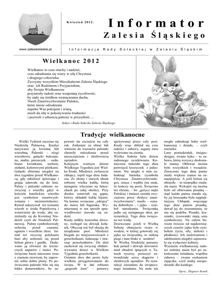 Informator Kwiecień 2012. Zalesia Śląskiego www.zalesieslaskie.pl I n f o r m a c j e R a d y S o ł e c k i e j w Z a l e s i u Ś l ą s k i m Wielkanoc 2012 Wielkanoc to czas otuchy i nadziei, czas odradzania się wiary w siłę Chrystusa i drugiego człowieka. Życzymy wszystkim Mieszkańcom Zalesia Śląskiego oraz ich Rodzinom i Przyjaciołom, aby Święta Wielkanocne przyniosły radość oraz wzajemną życzliwość; by stały się źródłem wzmacniania ducha. Niech Zmartwychwstanie Pańskie, które niesie odrodzenie napełni Was pokojem i wiarą, niech da siłę w pokonywaniu trudności i pozwoli z ufnością patrzeć w przyszłość…. Sołtys i Rada Sołecka Zalesia Śląskiego Tradycje wielkanocne Wielki Tydzień zaczyna się Niedzielą Palmową. Kiedyś nazywano ją kwietną lub wierzbną. Palemki – rózgi wierzbowe, gałązki bukszpanu, malin, porzeczek – ozdabiano kwiatkami, mchem, ziołami, kolorowymi piórkami. Gałązki zbierano niegdyś na dwa tygodnie przed Wielkanocą, gdy młodzież śpiewając i grając udawała się do lasu. Palmy i palemki robiono zazwyczaj z wierzby gdyż w kościele katolickim wierzba jest symbolem zmartwychwstania i nieśmiertelności. Rytuał nakazywał też ścinanie wierzb w środę Popielcową i wstawienie do wody, aby zazieleniły się do Kwietnej Niedzieli czyli do Niedzieli Palmowej. Palmy symbolizowały ochronę przed czarami, ogniem i wszelkim złem. Istniał też zwyczaj połykania bazi aby uchronić się przed bólem głowy i gardła. Dodawano ją również do leczniczych naparów i maści. Poświęcone bazie mieszano wraz z ziarnem siewnym, by zapewnić sobie dobre plony. Po poświeceniu palemki biło się nią lekko domowników, by za- pewnić im szczęście na cały rok. Zatknięte za obraz lub włożone do wazonów palemki chroniły mieszkanie przed nieszczęściem i złośliwością sąsiadów. Kolejnym ważnym dniem Wielkiego Tygodnia jest Wielka Środa. Młodzież, zwłaszcza chłopcy, topili tego dnia Judasza. Ze słomy i starych ubrań robiono wielka kukłę, którą następnie wleczono na łańcuchach po całej okolicy. Przy drodze ustawiali się gapie, którzy okładali kukłę kijami. Na koniec wrzucano „zdrajcę” do stawu lub bagienka. Wymierzanej w ten sposób sprawiedliwości stawało się zadość. Kiedy milkły kościelne dzwony, rozlegał się dźwięk kołatek. Obyczaj ten był okazją do urządzania psot. Młodzież biegała po miejscowościach z grzechotkami, hałasując i strasząc przechodniów. Do dziś zachował się zwyczaj obdarowywania dzieci w Wielkim Tygodniu grzechotkami. Ostatnie dwa dni postu były wielkim przygotowaniem do święta. W te dni robiono „pogrzeb żuru” – potrawy spożywanej przez cały post. Kiedy więc zbliżał się czas radości i zabawy, sagany żuru wylewano na ziemię. Wielka Sobota była dniem radosnego oczekiwania. Koniecznie należało tego dnia poświęcić koszyczek z jedzeniem. Nie mogło w nim zabraknąć baranka (symbolu Chrystusa Zmartwychwstałego), mięsa i wędlin (na znak, że kończy się post). Święcono też chrzan, – bo „gorycz męki Pańskiej i śmierci została zwyciężona przez słodycz zmartwychwstania”, masło – oznakę dobrobytu – i jajka – symbol narodzenia. Święconkę jadło się następnego dnia, po rezurekcji. Tego dnia święcono też wodę. Dziewczęta: jeżeli w Wielką Sobotę obmyjecie twarz w wodzie, w której gotowały się jajka na święconkę, to znikną piegi i inne braki w urodzie! W Wielką Niedzielę poranny huk petard i dźwięk dzwonów miał obudzić śpiących w Tatrach rycerzy, poruszyć zatwardziałe serca skąpców i złośliwych sąsiadów. Po rezurekcji zasiadano do świątecznego śniadania. Na stole nie mogło zabraknąć baby wielkanocnej i dziada, – czyli mazurka. Lany poniedziałek, śmigusdyngus, święto lejka – to zabawa, którą wszyscy doskonałe znamy. Oblewać można było wszystkich i wszędzie. Zmoczone tego dnia panny miały większe szanse na zamążpójście. A jeśli któraś się obraziła – to nieprędko znalazła męża. Wykupić się można było od oblewania pisanką – stąd każda panna starała się, by jej kraszanka była najpiękniejsza. Chłopak, wręczając tego dnia pannie pisankę, dawał jej do zrozumienia, że mu się podoba. Pisanki, kraszanki, rysowanki mają sens symboliczny. Na całym bowiem świecie od najdawniejszych czasów jajko było symbolem życia, siły, miłości i płodności. Ich malowaniem i zdobieniem niegdyś zajmowały się wyłącznie kobiety. Wyrazem wielkanocnej radości rodziny może być po zakończeniu śniadania, wspólna zabawa – zwana szukaniem zajączka, czyli małej niespodzianki dla każdego. Oprac. Zbigniew Romik Informator Zalesia Śląskiego Kwiecień 2012 Spotkania rady sołeckiej i grupy odnowy wsi odbywają się w każdą, pierwszą środę miesiąca w domu spotkań MN o godzinie 19.00 Zebrania są otwarte . Serdecznie zapraszamy. Nasze plany na najbliższy czas Wieczór karaoke – kwiecień, termin i inne szczegóły zostaną ogłoszone na plakatach. Sprzątamy i upiększamy Zalesie - Pani Sołtys zaprasza mieszkańców do wspólnych wiosennych porządków; terminy: środa 18 kwietnia godz. 10.00 – 13.00, sobota 21 kwietnia godz. 9.00 – 13.00; prosimy o zabranie ze sobą drobnego sprzętu np. miotły, grabek itp.; zbiórka chętnych przy budynku OSP. Majówka w Popicach – 12 maja. Wycieczka autokarowa Tarnowskie Góry – 26 maja. Zbigniew Romik Zbigniew Romik Święto Św. Józefa W dniu 18 marca 2012 r. w Zalesiu Śląskim z okazji Święta Św. Józefa odbyło się spotkanie mężczyzn – mieszkańców Zalesia Śląskiego. Spotkanie otworzyła Pani Sołtys Bożena Mróz składając obecnym Panom serdeczne i miłe życzenia jednocześnie wręczając symboliczny kłos jęczmienia przewiązany wstążką. Kłos jęczmienia został wcześniej nieco przetworzony z dodatkiem chmielu i w postaci płynnej zapakowany