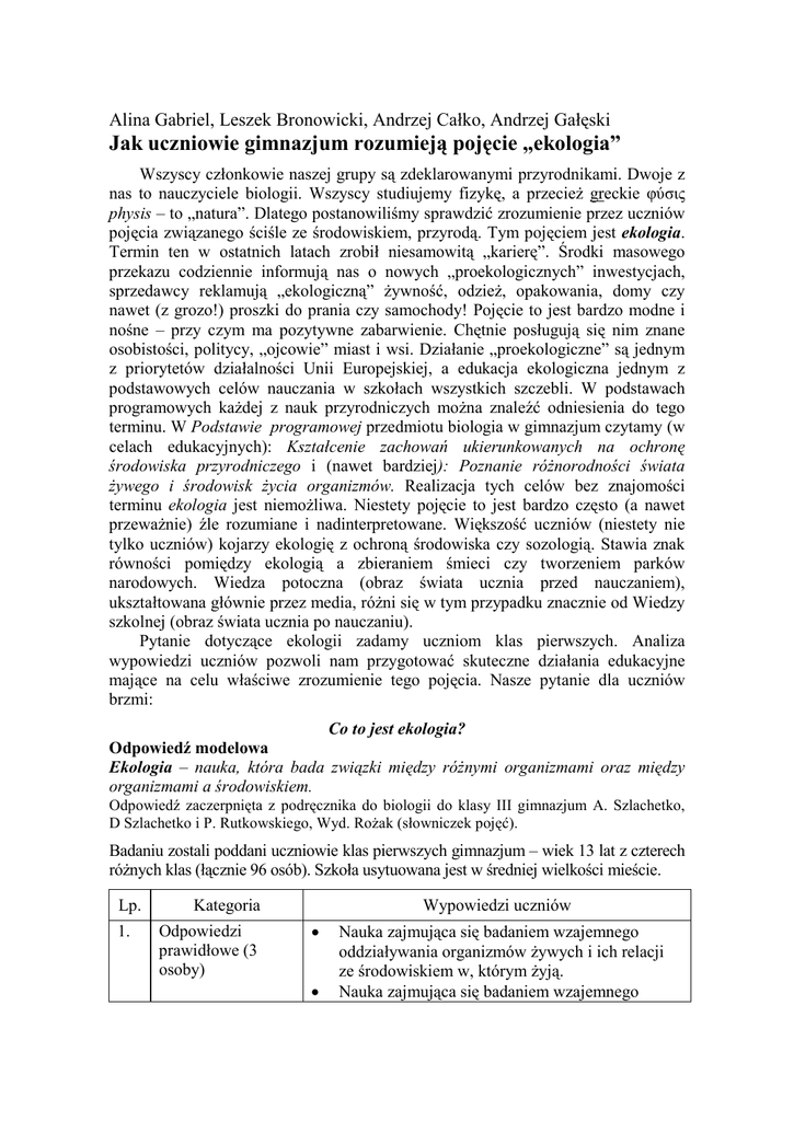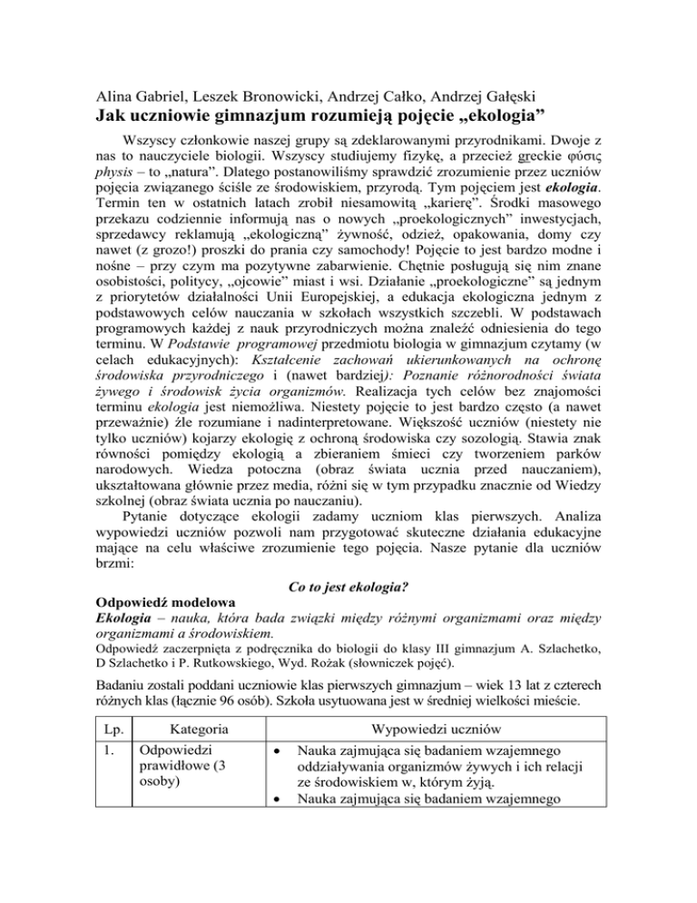 Alina Gabriel, Leszek Bronowicki, Andrzej Całko, Andrzej Gałęski Jak uczniowie gimnazjum rozumieją pojęcie „ekologia” Wszyscy członkowie naszej grupy są zdeklarowanymi przyrodnikami. Dwoje z nas to nauczyciele biologii. Wszyscy studiujemy fizykę, a przecieŜ greckie φύσις physis – to „natura”. Dlatego postanowiliśmy sprawdzić zrozumienie przez uczniów pojęcia związanego ściśle ze środowiskiem, przyrodą. Tym pojęciem jest ekologia. Termin ten w ostatnich latach zrobił niesamowitą „karierę”. Środki masowego przekazu codziennie informują nas o nowych „proekologicznych” inwestycjach, sprzedawcy reklamują „ekologiczną” Ŝywność, odzieŜ, opakowania, domy czy nawet (z grozo!) proszki do prania czy samochody! Pojęcie to jest bardzo modne i nośne – przy czym ma pozytywne zabarwienie. Chętnie posługują się nim znane osobistości, politycy, „ojcowie” miast i wsi. Działanie „proekologiczne” są jednym z priorytetów działalności Unii Europejskiej, a edukacja ekologiczna jednym z podstawowych celów nauczania w szkołach wszystkich szczebli. W podstawach programowych kaŜdej z nauk przyrodniczych moŜna znaleźć odniesienia do tego terminu. W Podstawie programowej przedmiotu biologia w gimnazjum czytamy (w celach edukacyjnych): Kształcenie zachowań ukierunkowanych na ochronę środowiska przyrodniczego i (nawet bardziej): Poznanie róŜnorodności świata Ŝywego i środowisk Ŝycia organizmów. Realizacja tych celów bez znajomości terminu ekologia jest niemoŜliwa. Niestety pojęcie to jest bardzo często (a nawet przewaŜnie) źle rozumiane i nadinterpretowane. Większość uczniów (niestety nie tylko uczniów) kojarzy ekologię z ochroną środowiska czy sozologią. Stawia znak równości pomiędzy ekologią a zbieraniem śmieci czy tworzeniem parków narodowych. Wiedza potoczna (obraz świata ucznia przed nauczaniem), ukształtowana głównie przez media, róŜni się w tym przypadku znacznie od Wiedzy szkolnej (obraz świata ucznia po nauczaniu). Pytanie dotyczące ekologii zadamy uczniom klas pierwszych. Analiza wypowiedzi uczniów pozwoli nam przygotować skuteczne działania edukacyjne mające na celu właściwe zrozumienie tego pojęcia. Nasze pytanie dla uczniów brzmi: Co to jest ekologia? Odpowiedź modelowa Ekologia – nauka, która bada związki między róŜnymi organizmami oraz między organizmami a środowiskiem. Odpowiedź zaczerpnięta z podręcznika do biologii do klasy III gimnazjum A. Szlachetko, D Szlachetko i P. Rutkowskiego, Wyd. RoŜak (słowniczek pojęć). Badaniu zostali poddani uczniowie klas pierwszych gimnazjum – wiek 13 lat z czterech róŜnych klas (łącznie 96 osób). Szkoła usytuowana jest w średniej wielkości mieście. Lp. 1. Kategoria Odpowiedzi prawidłowe (3 osoby) Wypowiedzi uczniów • • Nauka zajmująca się badaniem wzajemnego oddziaływania organizmów Ŝywych i ich relacji ze środowiskiem w, którym Ŝyją. Nauka zajmująca się badaniem wzajemnego • 2. Ekologia utoŜsamiana z ochroną środowiska) (26 osób) • • • • • • • • • • • • • • • oddziaływania organizmów Ŝywych i ich relacji ze środowiskiem. Jest to nauka o organizmach Ŝywych i ich kontakcie ze środowiskiem, w którym Ŝyją. Jest to równieŜ dbanie o środowisko. To nauka zajmująca się ochroną środowiska naturalnego. Nauka o zanieczyszczaniu środowiska i dbaniu o to Ŝeby świat był czysty a niezabrudzony odpadami, które zanieczyszczają rzeki. Nauka o ochronie przyrody i badaniu jej od wewnątrz i środowiska, które nas otacza. Według mnie to nauka, która ma na celu ochronić przyrodę przed zanieczyszczeniami i innymi rzeczami zagraŜającymi Ziemi. Sprawdza ona poziom czystości wód, powietrza. Nauka o ochronie przyrody, zajmująca się np. ochroną zwierząt, ale najbardziej związane jest z zachowaniem czystości powietrza, segregacją odpadów itd. Wg mnie zajmuje się ochroną środowiska. Jest, więc to nauka o ochronie środowiska. Kojarzy mi się ze zbieraniem odpadów i ponownym wykorzystywaniem ich. Jest to ochrona środowiska. Ekolodzy dbają o czystość środowiska. UwaŜam, Ŝe jest to ochrona świata. Ludzie, którzy są ekologami dbają o przyrodę i starają się oczyszczać ją. Jest to dziedzina, w której ludzie zajmują się ekologią, czyli zajmują się ochroną środowiska przed zanieczyszczeniem go, niszczeniem dzikich śmietnisk itp. Dla mnie to ochrona środowiska, przyrody. To dbanie o środowisko, nie zatruwanie go, sprzątanie. To przecieŜ coś, co nas otacza, więc powinniśmy dbać o środowisko, bo ono jest dla nas. To czystość w środowisku, które nas otacza. Jest to ochrona przyrody. Kojarzy mi się z ochroną przyrody. Jest to specjalizacja chroniąca przyrodę. Zajmuje się ochroną środowiska i jej badaniem. To ochrona środowiska, odzyskiwanie odpadów, czyli przetwarzanie papieru, puszek aluminiowych, nie niszczenie lasów i łąk i nie • • • • • • • • • • • 3. Ekologia utoŜsamiana z przyrodą, środowiskiem (27 osób) • • • • • • • • • wytwarzanie spalin. Zajmuje się ochroną zwierząt będących pod ochroną i dba o to, aby nie wycinano i niszczono lasów. To dbanie o naszą Ziemię. Chodzi o to, by jej nie zaśmiecać, walczyć z tymi, co ją zaśmiecają. Dbać o środowisko, by było czyste, aby dobrze się w nim nam Ŝyła. Aby nie wycinać drzew, bo kaŜde wycięte drzewo oznacza mniej tlenu na Ziemi. Ochrona przyrody, sortowanie śmieci, zakładanie parków narodowych, krajobrazowych, nie niszczenie lasów i łąk. Pomaganie zwierzętom, nie chwytanie ich i nie wypalanie łąk. Jest to ochrona środowiska. Ochrona środowiska naturalnego. Jest to dbanie o przyrodę. Jest to dbanie o środowisko. Nauka o przyrodzie. Ochrona przyrody. Kojarzy mi się z czystością Ziemi, ze sprzątaniem świata, z dbałością o rośliny, z dokarmianiem zwierząt. Kojarzy mi się