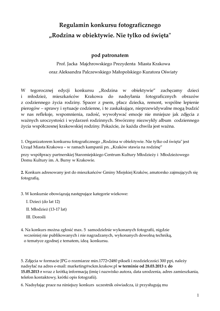 Regulamin konkursu fotograficznego „Rodzina w obiektywie. Nie tylko od święta" pod patronatem Prof. Jacka Majchrowskiego Prezydenta Miasta Krakowa oraz Aleksandra Palczewskiego Małopolskiego Kuratora Oświaty W tegorocznej edycji konkursu „Rodzina w obiektywie” zachęcamy dzieci i młodzież, mieszkańców Krakowa do nadsyłania fotograficznych obrazów z codziennego życia rodziny. Spacer z psem, płacz dziecka, remont, wspólne lepienie pierogów – sprawy i sytuacje codzienne, i te zaskakujące, nieprzewidywalne mogą budzić w nas refleksje, wspomnienia, radość, wywoływać emocje nie mniejsze jak zdjęcia z ważnych uroczystości i wydarzeń rodzinnych. Stwórzmy niezwykły album codziennego życia współczesnej krakowskiej rodziny. Pokażcie, że każda chwila jest ważna. 1. Organizatorem konkursu fotograficznego „Rodzina w obiektywie. Nie tylko od święta" jest Urząd Miasta Krakowa – w ramach kampanii pn. „Kraków stawia na rodzinę” przy współpracy partnerskiej Staromiejskiego Centrum Kultury Młodzieży i Młodzieżowego Domu Kultury im. A. Bursy w Krakowie. 2. Konkurs adresowany jest do mieszkańców Gminy Miejskiej Kraków, amatorsko zajmujących się fotografią. 3. W konkursie obowiązują następujące kategorie wiekowe: I. Dzieci (do lat 12) II. Młodzież (13-17 lat) III. Dorośli 4. Na konkurs można zgłosić max. 5 samodzielnie wykonanych fotografii, nigdzie wcześniej nie publikowanych i nie nagradzanych, wykonanych dowolną techniką, o tematyce zgodnej z tematem, ideą konkursu. 5. Zdjęcia w formacie JPG o rozmiarze min.1772×2480 pikseli i rozdzielczości 300 ppi, należy nadsyłać na adres e-mail: [email protected] w terminie od 28.03.2013 r. do 15.05.2013 r wraz z krótką informacją (imię i nazwisko autora, data urodzenia, adres zamieszkania, telefon kontaktowy, krótki opis fotografii). 6. Nadsyłając prace na niniejszy konkurs uczestnik oświadcza, iż przysługują mu 1 wyłączne i nieograniczone prawa autorskie do nadesłanych fotografii oraz, że osoby widniejące na fotografiach wyrażają zgodę na wykorzystanie fotografii w konkursie, w tym na rozpowszechnianie prawa do ich wizerunku. 7. Prace nadesłane na konkurs zostaną ocenione przez Jury, powołane przez Organizatora, w skład którego wejdą artyści fotograficy oraz przedstawiciele Organizatorów. 8. Jury zwróci uwagę przede wszystkim na: zgodność tematyczną, kreatywne i autorskie podejście do tematu, pomysłowość ujęć, kompozycję zdjęcia, poziom techniczny oraz estetyczny prac. 9. Dla zwycięzców konkursu fotograficznego przewidziane są nagrody rzeczowe. Miejsce I: aparaty fotograficzne SONY bony zakupowe do Empik albumy fotograficzne Miejsce II albumy fotograficzne bony zakupowe do Empik Miejsce III albumy fotograficzne 10. Decyzja Jury w przyznawaniu i podziale nagród jest ostateczna. 11. Oficjalne ogłoszenie wyników konkursu, prezentacja prac, oraz wręczenie nagród nastąpi w dniu 26.05.2013 r. podczas Święta Rodziny Krakowskiej na Bulwarze Czerwieńskim. 12. Prace nagrodzone oraz wyróżnione przez Jury zostaną zaprezentowane na wystawie pokonkursowej w Bonarka City Center w Krakowie. 13. Organizatorzy zastrzegają sobie prawo do bezpłatnego wykorzystania prac uczestników konkursu w dowolnym czasie i formie dla celów promocji konkursu. 14. Organizator zastrzega sobie prawo zmiany niniejszego regulaminu. 15. Udział w konkursie jest bezpłatny. 16. Informacja dotycząca konkursu: Staromiejskie Centrum Kultury Młodzieży w Krakowie, Małgorzata Stoch-Staszel, tel. 12 430 50 90 wew. 31, e-mail, [email protected] 17. Udział w konkursie jest równoznaczny z akceptacją regulaminu oraz ze zgodą uczestnika na wykorzystanie jego danych osobowych zgodnie z przepisami Ustawy z dnia 29 sierpnia 1997 roku o ochronie danych osobowych. 2