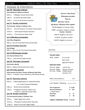 Baltimore, MD Archdiocesan Shrine of The Divine Mercy July 21, 2013 Masses & Intentions July 20 - Saturday (sobota) Saint Apollinaris, Bishop and Martyr 8:30 a.m. +Władysław Czaczka (Maria Clarke) 5:00 p.m. Lee Ratazak (Bernadette Gietka) 7:00 p.m O zdrowie dla Stanislawy Skarpinski July 21- Sunday (niedziela) The Sixteenth Sunday in Ordinary Time 8:30 a.m. Anna Kim Dung for her intention (Vanessa Banh) 10:30 a.m. ++John Kopek & Ryszard Szymanski 12:30 p.m. +Frank Szymanski (Kielek Family) July 22-Monday (poniedziałek) Saint Mary Magdalene Summer Mass Sched. Wakacyjny porządek Mszy św. Saturday / sobota Vigil Masses / Niedzielne Msze wigilijne: 5:00 PM (English) in St. Faustina chapel 7:00PM ( po polsku) w kaplicy św. Faustyny Sunday / niedziela 8:30 AM (English) in the church 10:30 AM (po polsku) w kościele 12:30 PM (English) in the church 8:00 a.m. Steve & Vanessa Banh Family (Vanessa Banh) July 23-Tuesday (wtorek) Saint Bridget 8:00 a.m. Giesu Tuan & Trinh Family (Vanessa Banh) Lectors July 24 Wednesday (środa) Saint Sharbel Makhluf, Priest 7:00 p.m. + John Pniewski (Sophie Pniewski) POLISH MASS 07/28 10:30am for next Sunday Alina Cymek July 25- Thursday (czwartek) Agnieszka Krajewski Saint James, Apostle ENGLISH MASS 8:00 a.m. +Zygmunt Paciorkiewicz (żona i dzieci) 07/13 Sat 5:00pm Luisa Di Iorio July 26 Friday (piątek) 07/14 Sun 8:30am 07/14 Sun 12:30pm Maryann Chorabik Kathleen Jamitis Jeannette Krol Saints Joachim and Anne, Parents of Blessed Virgin Mary 7:00 p.m. +++Edward i Lucyna Mackiewicz, & Bronisława Januszko July 27- Saturday (sobota) 8:30 a.m. O Boże błogosławjeństwo i opiekę Matki Bożej z ok. urodzin Krzysztofa Zielińskiego 5:00 p.m. +Earlene Smith (Cohill family) 7:00 p.m ++Magdalena Pawelczyk, i Barbara Ulsz I zmarłych z rodziny (Kowalczyk family) July 28- Sunday (niedziela) The Seventeenth Sunday in Ordinary Time 8:30 a.m. +Stefan Gęgała (żony i synów) 10:30 a.m. +Mieczysław Góralczyk (Diane Wiśniewski) 12:30 p.m. Roberie Cavey (sister Maggie Wright) Mass Attendance: Last Week’s Offering 311 July 14, 2013 First Collection Second Collection ( Catholic Review ) Poor Box Candles $ 3,338 $ 647 WEEKLY OFFERINGS TOTAL $ 4,101 $ $ 51 65 Archdiocesan Shrine of The Divine Mercy July 21, 2013 Serdecznie witamy ks. Zygmunta Ostrowskiego SChr, który przez kolejne dwa tygodnie będzie zastępował ks. proboszcza. Życzymy ks. Zygmuntowi, by czas pobytu w naszej parafii był dobrą okazją do zapoznania się z naszą wspólnotą. W tym czasie proboszcz wraz z grupą młodych z naszej parafii udaje się do Brazylii na Światowe Dni Młodzieży i spotkanie z papieżem Franciszkiem. Warm Welcome to Fr. Zygmunt Ostrowski SChr. Fr. Andrzej Totzke, SChr. Pastor is traveling with the Youth Group of our parish to Brazil for World Youth Day. Fr. Zygmunt Ostrowski will be in attendance at Holy Rosary for those two weeks in Fr. Andrzej Totzke absence. During this time Fr. Totzke, along with the Youth Group will be in Brazil for the Day of Prayer & for a visit with the Holy Father, Pope Francis. No matter where you go this summer, please do not forget your parish back home. If you will be out of town on a Sunday, please make your weekly donation before you leave or when you return. Holy Rosary depends on your help and support to pay the bills even when you are not home. God Bless you for understanding. Wspierajmy swój kościół także w czasie wakacji. Nieważne gdzie wybierasz się na wakacje, pamiętaj o o swojej parafii. Potrzebujemy Twojej modlitwy i wsparcia. Bóg zapłać za zrozumienie. Baltimore, MD This week’s Second Collection taken after Holy Communion will be for Church Restoration . As always we thank you for your generosity. Róże Różańcowe Rodziców modlących się za dzieci i dotychczasowe Róże zapraszają do włączenia się do modlitwy Różańcowej. Osoby, które chciałyby włączyć się do modlitwy różańcowej w ramach istniejącej Róży lub Róż modlących się za dzieci, proszone są o kontakt z p. Aliną Cymek, 443 540-4954. Więcej o Różach Różańcowych: http://www.rozaniec.dominikanie.pl/003.html Our parish has formed a Rosary Group with Parents praying for their children. We invite you to join our parents in saying the rosary for our children . For more information, you can check our website . http://www.comepraytherosary.org/ http://www.ewtn.com/devotionals/prayers/rosary/how_to.htm If interested please contact: Alina Cymek, 443 540-4954. Votive Candles The large Votive Lamps on the Main Altar or in the Divine Mercy Shrine are for the convenience of those desiring to have a Votive Lamp burning for their special intentions day and night. Envelopes can be found in the pews or on the table in the back of the church. Candles are burning for: 1.To St. Jude (Catherine Gietka) 2. Kathy Butler for All her Intentions & New Challanges 3. Sister Kay her good health & intentions 4.Happy Birthday Blessings for our son David Marciszewski from your family 5. For my daughter Lisa & for my daughter Laura (Lynda Kouroupis) 6. For Michael Callahan & for a special family intention (Mr. & Mrs. Charles Lattuca) 7. O Zdrowie dla Romana Glanowskiego Jezu Ufam Tobie 8. For Lorne Rosorsky for continuing health & strength & for the family of Shawn Belanger for God’s compassion in their continuing grief. (Regina Morano) 9. Special Intention for Carolyn Chase 7/21-7/27 Archdiocesan Shrine of The Divine Mercy July 21, 2013 Baltimore, MD STAINED GLASS WINDOWS PROJECT Thank you everyone! We have reached our First Goal for the first Phase of our Stained Glass Windows restoration. We completed 2 large windows to the left of the alter. Now our Second Goal is to continue the project to the Second Phase. We need sponsers for the Second Phase. The cost of renovating the large windows is $12,000, and $1,000 for a small window. To raise funds we invite you to sponsor the windows as parts. Large windows are divided into twelve parts. Each of them will cost 