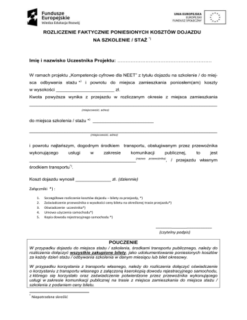ROZLICZENIE FAKTYCZNIE PONIESIONYCH KOSZTÓW DOJAZDU NA SZKOLENIE / STAŻ *) Imię i nazwisko Uczestnika Projektu: ………………………………………………… W ramach projektu „Kompetencje cyfrowe dla NEET” z tytułu dojazdu na szkolenie / do miejsca odbywania stażu1*) i powrotu do miejsca zamieszkania poniosłem(am) koszty w wysokości _______________________ zł. Kwota powyższa wynika z przejazdu w rozliczanym okresie z miejsca zamieszkania __________________________________________________________________________ (miejscowość, adres) do miejsca szkolenia / stażu *) ________________________ __________________________________________________________________________ (miejscowość, adres) i powrotu najtańszym, dogodnym środkiem transportu, obsługiwanym przez przewoźnika wykonującego usługi w zakresie komunikacji __________________________________________ (nazwa publicznej, przewoźnika) to jest , / przejazdu własnym *) środkiem transportu . Koszt dojazdu wynosił ______________ zł. (dziennie) Załączniki *) : 1. 2. 3. 4. 5. Szczegółowe rozliczenie kosztów dojazdu – bilety za przejazdy, *) Zaświadczenie przewoźnika o wysokości ceny biletu na określonej trasie przejazdu*) Oświadczenie uczestnika*) Umowa użyczenia samochodu*) Kopia dowodu rejestracyjnego samochodu *) ________________________ (czytelny podpis) POUCZENIE W przypadku dojazdu do miejsca stażu / szkolenia, środkami transportu publicznego, należy do rozliczenia dołączyć wszystkie zakupione bilety, jako udokumentowanie poniesionych kosztów za każdy dzień stażu / odbywania szkolenia w danym miesiącu lub bilet okresowy. W przypadku korzystania z transportu własnego, należy do rozliczenia dołączyć oświadczenie o korzystaniu z transportu własnego z załączoną kserokopią dowodu rejestracyjnego samochodu, z którego się korzystało oraz zaświadczenie potwierdzone przez przewoźnika wykonującego usługi w zakresie komunikacji publicznej na trasie z miejsca zamieszkania do miejsca stażu / szkolenia z podaniem ceny biletu. * Niepotrzebne skreślić WYPEŁNIA PERSONEL PROJEKTU Data rozpoczęcia stażu / szkolenia: _____________. W analizowanym okresie _____________________ uczestnik projektu odbył szkolenie / staż *) w ilości ______ dni. Faktyczny koszt dojazdu w w/w miesiącu z miejsca zamieszkania do miejsca szkolenia / stażu wyniósł ______________ zł. Uczestnikowi przysługuje zwrot kosztów przejazdu w wysokości: _____________ zł – koszt kwalifikowalny – zadanie nr _______ . Projekt nr POWR.01.02.01-24-0135/15 Uwagi: ____________________________________________________________________________ __________________________________________________________________________________ __________________________________________________________________________________ __________________________________________________________________________________ Sprawdzono pod względem merytorycznym dnia_____________________podpis__________________ Załącznik - SZCZEGÓŁOWE ROZLICZENIE KOSZTÓW DOJAZDU Imię i nazwisko Uczestnika Projektu: ………………………………………………… Data Łączny koszt biletów ………………………………….. Imię i nazwisko uczestnika projektu ………………………………….. Adres zamieszkania Bilety za dojazdy (bilety dopiąć w taki sposób aby była widoczna data skasowania biletu) ………………………………. Miejscowość, data ZAŚWIADCZENIE PRZEWOŹNIKA O WYSOKOŚCI CENY BILETU NA OKREŚLONEJ TRASIE PRZEJAZDU Informuję, że koszt biletu jednorazowego / dziennego *) (nie uwzględniającego zniżek i zwyżek) na trasie z ……………………….………………..……. do ………………………… gdzie odbywają się szkolenia / staż w ramach projektu „Kompetencje cyfrowe dla NEET” wynosi ………………………………. zł …………………………………………….. Podpis i pieczęć przewoźnika *) niepotrzebne skreślić ………………………………….. ………………………………. Imię i nazwisko Miejscowość, data ………………………………….. Adres zamieszkania ………………………………….. OŚWIADCZENIE UCZESTNIKA Informuję, że samochód osobowy marki ………………………………………………. o numerze rejestracyjnym ……………………………………………, którego jestem właścicielem/współwłaścicielem*, wykorzystywać będę w okresie od dnia ……………… do zakończenia udziału w projekcie „Kompetencje cyfrowe dla NEET” na dojazdy z miejsca mojego zamieszkania tj. ……………………… …………………………………., do miejsca realizacji zajęć organizowanych w ramach projektu tj. …………………………… ……………………………………….. …………………………………………….. Data i podpis * Niepotrzebne skreślić UMOWA UŻYCZENIA SAMOCHODU zawarta w dniu ………………….…………w ………………………...…………… pomiędzy: 1) …………………………………………,zamieszkałym/ą…………………………………..…… zwanym dalej użyczającym, a 2) …………………………………………………, zamieszkałym/ą……………………………… zwanym dalej biorącym do używania. §1 1. Przedmiotem niniejszej umowy jest samochód marki …….………………………………….., rok produkcji ……………, numer rejestracyjny …………..……..……… 2. Użyczający oświadcza, że przedmiot umowy stanowi jego własność oraz jest wolny od jakichkolwiek roszczeń i obciążeń na rzecz osób trzecich. 3. Przedmiot użyczenia jest w dobrym stanie technicznym, ma sprawne wszystkie zespoły i urządzenia. §2 Użyczający użycza i daje w bezpłatne użytkowanie biorącemu do używania opisany wyżej przedmiot na okres od dnia ……