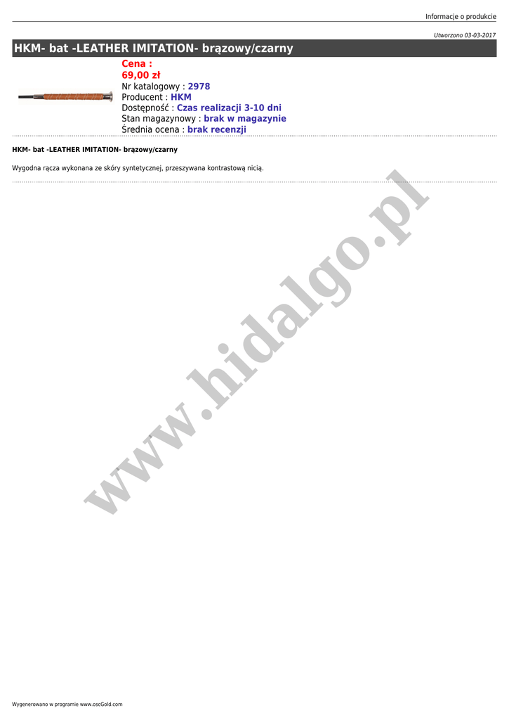 Informacje o produkcie Utworzono 03-03-2017 HKM- bat -LEATHER IMITATION- brązowy/czarny Cena : 69,00 zł Nr katalogowy : 2978 Producent : HKM Dostępność : Czas realizacji 3-10 dni Stan magazynowy : brak w magazynie Średnia ocena : brak recenzji HKM- bat -LEATHER IMITATION- brązowy/czarny w w w .h id al go .p l Wygodna rącza wykonana ze skóry syntetycznej, przeszywana kontrastową nicią. Wygenerowano w programie www.oscGold.com