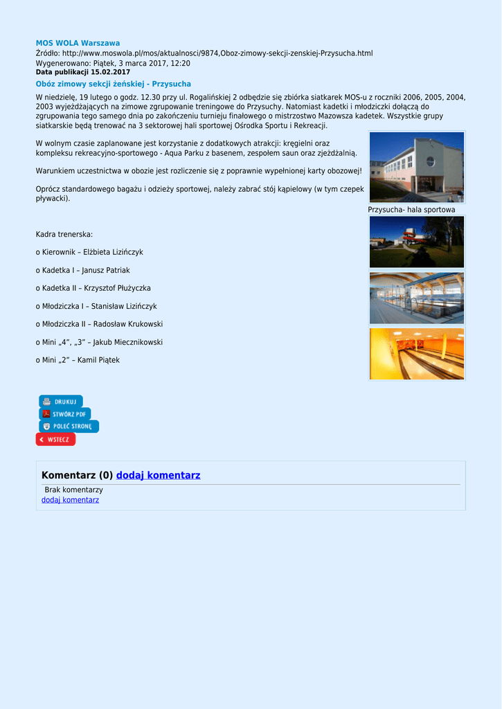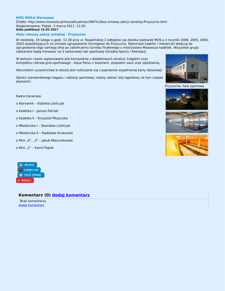 MOS WOLA Warszawa Źródło: http://www.moswola.pl/mos/aktualnosci/9874,Oboz-zimowy-sekcji-zenskiej-Przysucha.html Wygenerowano: Piątek, 3 marca 2017, 12:20 Data publikacji 15.02.2017 Obóz zimowy sekcji żeńskiej - Przysucha W niedzielę, 19 lutego o godz. 12.30 przy ul. Rogalińskiej 2 odbędzie się zbiórka siatkarek MOS-u z roczniki 2006, 2005, 2004, 2003 wyjeżdżających na zimowe zgrupowanie treningowe do Przysuchy. Natomiast kadetki i młodziczki dołączą do zgrupowania tego samego dnia po zakończeniu turnieju finałowego o mistrzostwo Mazowsza kadetek. Wszystkie grupy siatkarskie będą trenować na 3 sektorowej hali sportowej Ośrodka Sportu i Rekreacji. W wolnym czasie zaplanowane jest korzystanie z dodatkowych atrakcji: kręgielni oraz kompleksu rekreacyjno-sportowego - Aqua Parku z basenem, zespołem saun oraz zjeżdżalnią. Warunkiem uczestnictwa w obozie jest rozliczenie się z poprawnie wypełnionej karty obozowej! Oprócz standardowego bagażu i odzieży sportowej, należy zabrać stój kąpielowy (w tym czepek pływacki). Przysucha- hala sportowa Kadra trenerska: o Kierownik – Elżbieta Lizińczyk o Kadetka I – Janusz Patriak o Kadetka II – Krzysztof Płużyczka o Młodziczka I – Stanisław Lizińczyk o Młodziczka II – Radosław Krukowski o Mini „4”, „3” – Jakub Miecznikowski o Mini „2” – Kamil Piątek Komentarz (0) dodaj komentarz Brak komentarzy dodaj komentarz