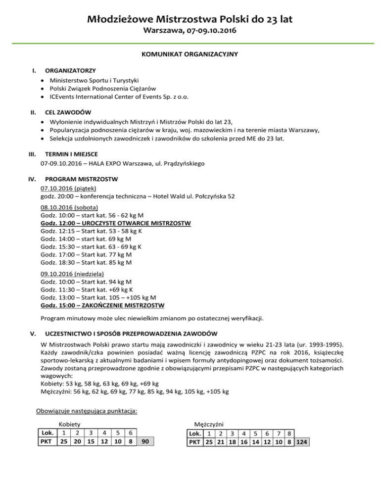 Młodzieżowe Mistrzostwa Polski do 23 lat Warszawa, 07-09.10.2016 KOMUNIKAT ORGANIZACYJNY I. ORGANIZATORZY Ministerstwo Sportu i Turystyki Polski Związek Podnoszenia Ciężarów ICEvents International Center of Events Sp. z o.o. II. CEL ZAWODÓW Wyłonienie indywidualnych Mistrzyń i Mistrzów Polski do lat 23, Popularyzacja podnoszenia ciężarów w kraju, woj. mazowieckim i na terenie miasta Warszawy, Selekcja uzdolnionych zawodniczek i zawodników do szkolenia przed ME do 23 lat. III. TERMIN I MIEJSCE 07-09.10.2016 – HALA EXPO Warszawa, ul. Prądzyńskiego IV. PROGRAM MISTRZOSTW 07.10.2016 (piątek) godz. 20:00 – konferencja techniczna – Hotel Wald ul. Połczyńska 52 08.10.2016 (sobota) Godz. 10:00 – start kat. 56 - 62 kg M Godz. 12:00 – UROCZYSTE OTWARCIE MISTRZOSTW Godz. 12:15 – Start kat. 53 - 58 kg K Godz. 14:00 – start kat. 69 kg M Godz. 15:30 – start kat. 63 - 69 kg K Godz. 17:00 – Start kat. 77 kg M Godz. 18:30 – Start kat. 85 kg M 09.10.2016 (niedziela) Godz. 10:00 – Start kat. 94 kg M Godz. 11:30 – Start kat. +69 kg K Godz. 13:00 – Start kat. 105 – +105 kg M Godz. 15:00 – ZAKOŃCZENIE MISTRZOSTW Program minutowy może ulec niewielkim zmianom po ostatecznej weryfikacji. V. UCZESTNICTWO I SPOSÓB PRZEPROWADZENIA ZAWODÓW W Mistrzostwach Polski prawo startu mają zawodniczki i zawodnicy w wieku 21-23 lata (ur. 1993-1995). Każdy zawodnik/czka powinien posiadać ważną licencję zawodniczą PZPC na rok 2016, książeczkę sportowo-lekarską z aktualnymi badaniami i wpisem formuły antydopingowej oraz dokument tożsamości. Zawody zostaną przeprowadzone zgodnie z obowiązującymi przepisami PZPC w następujących kategoriach wagowych: Kobiety: 53 kg, 58 kg, 63 kg, 69 kg, +69 kg Mężczyźni: 56 kg, 62 kg, 69 kg, 77 kg, 85 kg, 94 kg, 105 kg, +105 kg Obowiązuje następująca punktacja: Kobiety Lok. 1 2 3 4 5 PKT 25 20 15 12 10 6 8 90 Mężczyźni Lok. 1 2 3 4 5 6 7 8 PKT 25 21 18 16 14 12 10 8 124 Młodzieżowe Mistrzostwa Polski do 23 lat Warszawa, 07-09.10.2016 Limity wynikowe w dwuboju: (do punktacji w systemie): K: 53 kg – 100 kg; 58 kg – 105 kg; 63 kg – 110 kg; 69 kg – 120 kg; +69 kg – 130 kg; M: 56 kg - 130 kg; 62 kg - 145 kg; 69 kg - 160 kg; 77 kg - 170 kg; 85 kg - 180 kg; 94 kg - 190 kg; 105 kg - 200 kg; +105 kg - 210 kg VI. ZAKWATEROWANIE I WYŻYWIENIE Rekomendowany hotel: Centrum Hotelowo-Konferencyjne WALD – Warszawa, ul. Połczyńska 52 (ok. 5km od hali Expo). - nocleg ze śniadaniem – 80 zł; obiad – 20 zł; kolacja – 17 zł, - istnieje możliwość wykupienia obiadu na terenie Hali EXPO w cenie 18 zł, Rezerwację noclegów i wyżywienia w hotelu należy dokonywać (osobiście czy samodzielnie) na hasło: MP w podnoszeniu ciężarów. Wyżywienie w terenie Hali EXPO proszę zgłaszać na adres [email protected] VII. ZGŁOSZENIE UDZIAŁU W ZAWODACH Zgłoszenia imiennego zawodników prosimy dokonać najpóźniej do dnia 28.09.2016 wyłącznie w formie elektronicznej: [email protected] na załączonym druku. W przypadku zgłoszenia uczestników po terminie klub uiszcza podwójną opłatę startową od każdego zawodnika i osoby towarzyszącej. VIII. STARTOWE Od każdej zawodniczki i zawodnika oraz osób towarzyszących pobierane będzie startowe 40 zł zgodnie z regulaminem PZPC IX. NAGRODY Indywidualnie za miejsca 1-3 w każdej kategorii wagowej zawodniczki/cy otrzymują medale dyplomy oraz nagrody. Dodatkowo zawodniczki/cy otrzymują medale za rwanie i podrzut, a trener najlepszej zawodniczki/ka w dwuboju otrzyma złoty medal. Województwa i Kluby za miejsca I-III w punktacji łącznej kobiet i mężczyzn otrzymają puchary, a za miejsca I-VI dyplomy. Zasady podziału nagród organizator poda na konferencji technicznej. X. FINANSOWANIE Organizator pokrywa koszty organizacyjne imprezy. Koszty noclegów, wyżywienia, startowego uczestników pokrywają jednostki delegujące. XI. POSTANOWIENIA KOŃCOWE Organizator nie ponosi odpowiedzialności z tytułu ubezpieczenia zawodników, kradzieży czy zagubienia sprzętu przez zawodników. Organizator zastrzega sobie prawo interpretacji w przypadkach nie określonych w niniejszym regulaminie. Za ewentualne szkody dokonane przez uczestników zawodów, płatność na miejscu przez kierownika, trenera. Kontakt: Izabela Kącka Tel. 722 122 555 e-mail [email protected]