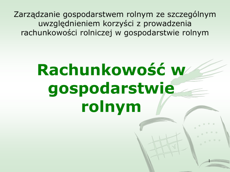 Zarządzanie gospodarstwem rolnym ze szczególnym uwzględnieniem korzyści z prowadzenia rachunkowości rolniczej w gospodarstwie rolnym Rachunkowość w gospodarstwie rolnym 1 ZAKRES I PRZYDATNOŚĆ RACHUNKOWOŚC • Rachunkowość wyrosła z potrzeby wspomożenia pamięci ludzkiej w kontroli zasobów i przebiegu działalności jednostki gospodarczej • Jest ona potrzebna szczególnie w jednostkach które sa zorientowane na rynek 2 RACHUNKOWOŚĆ JEST NARZĘDZIEM DLA WYTWARZANIA SZCZEGÓLNEGO RODZAJU INFORMACJI 3 CEL RACHUNKOWOŚCI Dostarczanie odpowiednich informacji (a nie danych rachunkowych których liczba jest znaczna) przedstawianych w mierniku pieniężnym: 1. 2. 3. 4. stanu i zmianach zasobów gospodarstwa rolnego w ciągu roku obrachunkowego źródeł finansowania zasobów przebiegu działalności wyników działalności 4 RACHUNKOWOŚĆ JEST BARDZO CZĘSTO UTOŻSAMIANA Z DOKONYWANIEM ZAPISÓW JEST TO JEDNAK NIEUPOWAŻNIONE UPROSZCZENIE 5 CZYM JEST RACHUNKOWOŚĆ? Bardzo często rachunkowość bywa utożsamiana z prowadzeniem zapisów. Jest to jednak daleko idące uproszczenie 6 CZYM JEST RACHUNKOWOŚĆ? Przez pojęcie rachunkowości należy rozumieć całościowy i zwarty system systematycznego gromadzenia i przetwarzania danych oraz prezentowania informacji ekonomicznofinansowych 7 3 główne części rachunkowości Księgowość Rachunek kosztów Sprawozdawczość finansowa 8 1. część rachunkowości Księgowość ma za zadanie tworzenie bazy danych dla systemu rachunkowości. Działalność tą nazywa się często prowadzeniem ksiąg rachunkowych. Na podstawie zarejestrowanych danych ilościowych i wartościowych, możliwe jest opisanie w jednostkach pieniężnych stanu i obrotu różnego rodzaju materiałów i produktów. To umożliwia przygotowanie zestawów informacji wyjściowych służących podejmowaniu decyzji. 9 2. część rachunkowości Rachunek kosztów obejmuje działania służące odzwierciedleniu procesu zaopatrzenia, produkcji i zbytu w ustalonym przedziale czasu 10 3. część rachunkowości Sprawozdawczość finansowa obejmuje zestaw informacji wytwarzanych przez system rachunkowości. 11 Rachunkowość finansowa informuje o stanie finansowo-majątkowym gospodarstwa rolnego i uzyskanym wyniku finansowym. Informacje przekazywane są głównie na zewnątrz gospodarstwa. Opracowane na jej podstawie sprawozdania finansowe mają jednolity format i muszą być ujawniane. Ten rodzaj rachunkowości jest regulowany prawnie (przez Ustawę o rachunkowości, prawo podatkowe itp.) i podlega kontroli finansowej z zewnątrz. Podstawą prawną jest ustawa o rachunkowości z dnia 29 września 1994 r., tekst po nowelizacji z dnia 13 listopada 2000 r., Dziennik Ustaw z roku 2002, Nr 76 poz. 694 z późniejszymi zmianami. 12 Rachunkowość zarządcza to system dostarczania informacji dla kierownictwa, wykorzystywanych w planowaniu i kontroli działalności przedsiębiorstwa oraz w podejmowaniu decyzji umożliwiających bardziej efektywne jego funkcjonowanie 13 GŁÓWNE CELE RACHUNKOWOŚCI ZARZĄDCZEJ • Gromadzenie danych – PRZESZŁOŚĆ • Rozwiazywanie problemów – TERAŹNIEJSZOŚĆ • Controlling – TERAŹNIEJSZOŚĆ • Panowanie - PRZYSZŁOŚĆ 14 System sprawozdawczości finansowej w rachunkowości zarządczej Linia czasu Przeszłość Stan bieżący 31.12.2011 r. Plan 31.12.2012 r. Sprawozdania dynamiczne 31.12.2013 r. Sprawozdania statyczne Bilans finansowy Sprawozdanie o Bilans finansowy według Projekt bilansu według stanu z przepływie pieniędzy stanu finansowego według 31.12.2011 r. w 12 miesiącach 2012 31.12.2012 r. stanu r. 31.12.2013 r. Plan przepływu pieniędzy Rachunek wyników dla 12 miesięcy 2012 r. Sprawozdanie o własnym kapitale z 31.12.2012 r. w 12 miesiącach 2013 r. Projekt rachunku wyników dla 12 miesięcy 2013 r. 15 Dane gromadzone w ramach rachunkowości służą do: 1. Oceny efektów podjętych decyzji, poprzez: • coroczne określania dochodów gospodarstwa rolnego, • analizę jego działalności. Jest to ocena ze stanu przeszłego 16 Dane gromadzone w ramach rachunkowości służą do: 2. Oceny efektów planowanych decyzji, poprzez: wykonywanie scenariuszy dla oceny skutków projektowanych zmian w gospodarstwie 17 Rachunkowość podatkowa jest obligatoryjna, dostosowana do przepisów prawa podatkowego, obejmuje w zasadzie dwa typy: 1. uproszczona rachunkowość dotycząca przedsiębiorstw osób fizycznych, spółek cywilnych, spółek jawnych, spółek partnerskich, jeżeli ich obroty nie przekroczyły 1.200.000 €. Formy rachunkowości uproszczonej to: · karta podatkowa- polegająca na opłacaniu podatku za okresy miesięczne w wysokości ustalonej decyzją administracyjną Urzędu Skarbowego, na podstawie odpowiednich przepisów. Wysokość podatków nie jest zależna od osiąganych przychodów lecz zależy m.in. od ilości zatrudnionych osób, wielkości miejscowości, w jakiej prowadzona jest działalność · ryczałt ewidencjonowany oznaczający opodatkowanie przychodów z działalności według określonych w przepisach stawek podatkowych · podatkowa księga przychodów i rozchodów polegająca na prowadzeniu ewidencji w celu ustalenia dochodu (dochód to różnica pomiędzy przychodami a kosztami) 2. ewidencje prowadzone łącznie z rachunkowością finansową dla 18 ustalenia dochodu podatkowego. Dotyczy to jednostek prowadzących księgi rachunkowe - pełną księgowość. 10 zasad rachunkowości 1.Zasada podmiotowości- wszelkie zjawiska interpretowane są z punktu widzenia jednostki. Polega też na oddzieleniu majątku właścicieli i majątku jednostki. 2. Zasada kontynuacji działania (ciągłości działania) - oznacza, że w dającej się przewidzieć przyszłości jednostka nie zamierza likwidować ani ograniczać działalności, ma to wpływ na wycenę majątku. 3. Zasada miernika pieniężnego- (rachunkowość posługuje się kategoriami wyróżnionymi w mierniku pieniężnym, w Polsce Zł.) 4. Zasada 