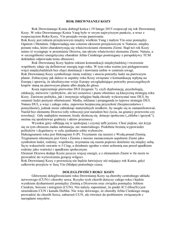 ROK DREWNIANEJ KOZY Rok Drewnianego Konia dobiegł końca i 19 lutego 2015 rozpoczął się rok Drewnianej Kozy. W roku Drewnianego Konia Yang było w swym najwyższym punkcie, a wraz z rozpoczęciem Roku Kozy, Yin przejęło swoje panowanie. Rok Kozy jest rokiem przejściowym między wielkim Yang i małym Yin oraz pomiędzy Ogniem i Metalem. Odpowiadają one czterem okresom przejściowym w Naturze, między porami roku, które charakteryzują się właściwościami elementu Ziemi. Stąd też rok Kozy mimo iż występuje w przemianie Drzewa, ma ukryte właściwości elementu Ziemi. Natura, a w szczególności energetyczny charakter Jelita Cienkiego postrzegany z perspektywy TCM dokładnie odpowiada temu obrazowi. Rok Drewnianej Kozy będzie rokiem komunikacji międzyludzkiej i tworzenie wspólnoty zdaje się definiować energię tego roku. W tym roku ważne jest pielęgnowanie więzi międzyludzkich bez chęci dominacji i stawiania siebie w centrum uwagi. Rok Drewnianej Kozy symbolizuje istotę rodziny i stawia potrzeby ludzi na pierwszym planie. Zobaczymy jak dalece te aspekty roku Kozy związane z komunikacją wpłyną na Europę i sprawią, że idealistyczne wizje Europy uwzględniające potrzeby poszczególnych krajów staną na pierwszym planie albo dojdą do głosu. Koza reprezentuje pierwotne DUI (trygram 7), czyli dyplomację, psychologię, edukację, mówców i polityków, ale też oszustwa i puste obietnice są klasyczną strategią roku Kozy. Zarówno polityka, jak i instytucje religijne będą chciały wykorzystać moc DUI, by omamić ludzi pustymi obietnicami. Media, reklama i propaganda to typowe strategie DUI. Natura DUI, a więc i całego roku, zapewnia bezpieczną przyszłość (bezpieczeństwo i pomyślność), jednak może zabraknąć materialnych środków, by mogło się to zamanifestować. Naród bez elementu Drzewa (siły roboczej) jest narodem bez życia, na granicy przewrotu czy rewolucji. Gdy nadejdzie moment, kiedy skończą się dotacje społeczne („chleba i igrzysk”), można się spodziewać grabieży i aktów przemocy. Wysokie góry odbijają się w spokojnej i czystej tafli jeziora. Choć piękne, nie kryje się za tym obrazem żadna substancja, nic materialnego. Podobnie brzmią wypowiedzi polityków i dygnitarzy w celu zjednania sobie wyborców. Heksagramem roku jest Heksagram 8 (Pi. Trzymanie się razem) z Wodą ponad Ziemią. Trygramem rdzennym jest Góra i Ziemia z mocno zaznaczonym aspektem Ziemi jako symbolem ludzi, rodziny, wspólnoty, trzymania się razem poprzez dzielenie się między sobą. Są to wskazówki zawarte w I Cing, a działania zgodne z nimi uchronią nas przed upadkiem rodziny jako wartości i upadkiem społecznym. Element Drzewa dodaje Kozie jeszcze więcej energii, a z elementem Ziemi w tle może to prowadzić do wytworzenia gorącej wilgoci. Rok Drewnianej Kozy z pewnością nie będzie łatwiejszy niż mijający rok Konia, gdyż całkowite przejście w fazę Yin (Małpa) potrzebuje czasu. DOLEGLIWOŚCI ROKU KOZY Głównymi dolegliwościami roku Drewnianej Kozy są choroby centralnego układu nerwowego (CUN) i choroby serca. Ryzyko tych chorób dotyczy całego roku i będzie wynikiem dysharmonii pomiędzy Ziemią a Drzewem oraz związku pomiędzy Jelitem Cienkim, Sercem i mózgiem (CUN). Nie należy zapominać, że punkt JC3 (HouXi) jest strażnikiem CUN i kanału DuMai. Nic więc dziwnego, że choroby Jelita Cienkiego mogą prowadzić do chorób Serca, zaburzeń CUN, ale również do problemów związanych z narządami zmysłów. Problemem tego roku na pewno będzie Śluz i wtórny zastój krwi Serca, Osierdzia i CUN, dlatego przydatny będzie punkt otwarcia JC1, punkt Jing na meridianie Jelita Cienkiego i jego działanie w odniesieniu do klatki piersiowej i CUN. W tym roku należy uważać na problemy z Tan (śluz)! Wprawdzie Drzewo karmi Ogień, ale atakuje Ziemię i Jelito Cienkie, a w końcu to Śledziona jest miejscem, gdzie Jing może zostać wytworzone. Pacjenci z celiakią i chorobą Crohna mogą czuć w tym roku pewne pogorszenie swego stanu zdrowia. ZALECENIA W tym roku powinno się zadbać o wchłanianie. Należy jeść mniej węglowodanów i cukru oraz wprowadzić dietę rozdzielną. Zaleca się częstsze stosowanie mieszanek trawiennych np.: Verdauungs Tee, jak również Quick Belly Movement (z linii Diolosa). Obydwa preparaty stymulują funkcję rozdzielania Jelita Cienkiego i zapobiegają odkładaniu się Tan i zastojom krwi w jelitach. Tematem roku wydają się być komunikacja i stosunki panujące w rodzinie, ale też w najbliższym otoczeniu. Ważne jest przede wszystkim rozdzielenie iluzji od rzeczywistości. Nie ma dobrych i złych lat, są tylko różne częstotliwości i przejawy jasności wszechświata, które czasami mniej lub bardziej sprzyjają. Najlepsze co możemy zrobić, to być uważnym, aby jak najlepiej to wykorzystać. Faza Yin już się rozpoczęła i powinniśmy się nauczyć zachować i chronić to, co już mamy. Duże przedsięwzięcia, rozpoczynanie czegoś nowego lub przeprowadzki nie są za bardzo wskazane. Żółty Cesarz zaleca by żyć zgodnie z porami roku i liczbami i dzięki temu szanować naturalny cykl przyrody oraz dopasować siebie do częstotliwości 9 Domów, Niebiańskich Pni i Ziemskich Konarów. Powinniśmy się wsłuchać w ponadczasowe przesłanie Przestrzeni. Razem z Iną życzymy Wam pomyślnego roku. Dla wszystkich lekkiej i spontanicznej manifestacji samego siebie oraz znacznie więcej Jing (pieniądze), aby móc się cieszyć samsaryczną iluzją stabilizacji ( DUI). (Heksagram 58) Ina & Claude, Asyż 12.12.2014