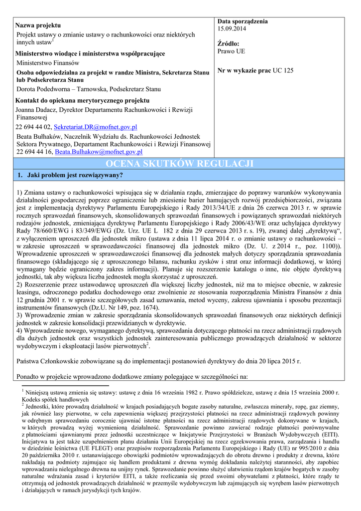 Nazwa projektu Projekt ustawy o zmianie ustawy o rachunkowości oraz niektórych innych ustaw1 Ministerstwo wiodące i ministerstwa współpracujące Ministerstwo Finansów Osoba odpowiedzialna za projekt w randze Ministra, Sekretarza Stanu lub Podsekretarza Stanu Dorota Podedworna – Tarnowska, Podsekretarz Stanu Data sporządzenia 15.09.2014 Źródło: Prawo UE Nr w wykazie prac UC 125 Kontakt do opiekuna merytorycznego projektu Joanna Dadacz, Dyrektor Departamentu Rachunkowości i Rewizji Finansowej 22 694 44 02, [email protected] Beata Bułhaków, Naczelnik Wydziału ds. Rachunkowości Jednostek Sektora Prywatnego, Departament Rachunkowości i Rewizji Finansowej 22 694 44 16, [email protected] OCENA SKUTKÓW REGULACJI 1. Jaki problem jest rozwiązywany? 1) Zmiana ustawy o rachunkowości wpisująca się w działania rządu, zmierzające do poprawy warunków wykonywania działalności gospodarczej poprzez ograniczenie lub zniesienie barier hamujących rozwój przedsiębiorczości, związana jest z implementacją dyrektywy Parlamentu Europejskiego i Rady 2013/34/UE z dnia 26 czerwca 2013 r. w sprawie rocznych sprawozdań finansowych, skonsolidowanych sprawozdań finansowych i powiązanych sprawozdań niektórych rodzajów jednostek, zmieniająca dyrektywę Parlamentu Europejskiego i Rady 2006/43/WE oraz uchylająca dyrektywy Rady 78/660/EWG i 83/349/EWG (Dz. Urz. UE L 182 z dnia 29 czerwca 2013 r. s. 19), zwanej dalej „dyrektywą“, z wyłączeniem uproszczeń dla jednostek mikro (ustawa z dnia 11 lipca 2014 r. o zmianie ustawy o rachunkowości – w zakresie uproszczeń w sprawozdawczości finansowej dla jednostek mikro (Dz. U. z 2014 r., poz. 1100)). Wprowadzenie uproszczeń w sprawozdawczości finansowej dla jednostek małych dotyczy sporządzania sprawozdania finansowego (składającego się z uproszczonego bilansu, rachunku zysków i strat oraz informacji dodatkowej, w której wymagany będzie ograniczony zakres informacji). Planuje się rozszerzenie katalogu o inne, nie objęte dyrektywą jednostki, tak aby większa liczba jednostek mogła skorzystać z uproszczeń. 2) Rozszerzenie przez ustawodawcę uproszczeń dla większej liczby jednostek, niż ma to miejsce obecnie, w zakresie leasingu, odroczonego podatku dochodowego oraz zwolnienie ze stosowania rozporządzenia Ministra Finansów z dnia 12 grudnia 2001 r. w sprawie szczegółowych zasad uznawania, metod wyceny, zakresu ujawniania i sposobu prezentacji instrumentów finansowych (Dz.U. Nr 149, poz. 1674). 3) Wprowadzenie zmian w zakresie sporządzania skonsolidowanych sprawozdań finansowych oraz niektórych definicji jednostek w zakresie konsolidacji przewidzianych w dyrektywie. 4) Wprowadzenie nowego, wymaganego dyrektywą, sprawozdania dotyczącego płatności na rzecz administracji rządowych dla dużych jednostek oraz wszystkich jednostek zainteresowania publicznego prowadzących działalność w sektorze wydobywczym i eksploatacji lasów pierwotnych2. Państwa Członkowskie zobowiązane są do implementacji postanowień dyrektywy do dnia 20 lipca 2015 r. Ponadto w projekcie wprowadzono dodatkowe zmiany polegające w szczególności na: 1 Niniejszą ustawą zmienia się ustawy: ustawę z dnia 16 września 1982 r. Prawo spółdzielcze, ustawę z dnia 15 września 2000 r. Kodeks spółek handlowych 2 Jednostki, które prowadzą działalność w krajach posiadających bogate zasoby naturalne, zwłaszcza minerały, ropę, gaz ziemny, jak również lasy pierwotne, w celu zapewnienia większej przejrzystości płatności na rzecz administracji rządowych powinny w odrębnym sprawozdaniu corocznie ujawniać istotne płatności na rzecz administracji rządowych dokonywane w krajach, w których prowadzą wyżej wymienioną działalność. Sprawozdanie powinno zawierać rodzaje płatności porównywalne z płatnościami ujawnianymi przez jednostki uczestniczące w Inicjatywie Przejrzystości w Branżach Wydobywczych (EITI). Inicjatywa ta jest także uzupełnieniem planu działania Unii Europejskiej na rzecz egzekwowania prawa, zarządzania i handlu w dziedzinie leśnictwa (UE FLEGT) oraz przepisów rozporządzenia Parlamentu Europejskiego i Rady (UE) nr 995/2010 z dnia 20 października 2010 r. ustanawiającego obowiązki podmiotów wprowadzających do obrotu drewno i produkty z drewna, które nakładają na podmioty zajmujące się handlem produktami z drewna wymóg dokładania należytej staranności, aby zapobiec wprowadzaniu nielegalnego drewna na unijny rynek. Sprawozdanie powinno służyć ułatwieniu rządom krajów bogatych w zasoby naturalne wdrażania zasad i kryteriów EITI, a także rozliczania się przed swoimi obywatelami z płatności, które rządy te otrzymują od jednostek prowadzących działalność w przemyśle wydobywczym lub zajmujących się wyrębem lasów pierwotnych i działających w ramach jurysdykcji tych krajów. zniesieniu obowiązku publikacji sprawozdań finansowych przez spółdzielnie w Monitorze Spółdzielczym, umożliwieniu bankom przechowywania dowodów księgowych dotyczących poszczególnych rat kredytów i pożyczek w formie elektronicznej, ujednolicenie przepisów w zakresie terminu przeliczania na walutę polską wielkości wyrażonych w euro w przepisach ustawy o rachunkowości (art. 3 ust. 3) oraz ustawy o podatku dochodowym od osób fizycznych (art. 24a ust. 6). 2. Rekomendowane rozwiązanie, w tym planowane narzędzia interwencji, i oczekiwany efekt Wprowadzenie do ustawy o rachunkowości zmian wynikających z implementacji dyrektywy, spośród których do najważniejszych i najbardziej znaczących należą poniższe zmiany. 1) Projekt przewiduje uproszczenia w zakresie sprawozdawczości finansowej, których celem jest redukcja obciążeń administracyjnych dla małych jednostek, do których zaliczane są spółki akcyjne, spółki z ograniczoną odpowiedzialnością oraz spółki komandytowo-akcyjne (jak również spółki osobowe przez nie tworzone), które w roku obrotowym, za
