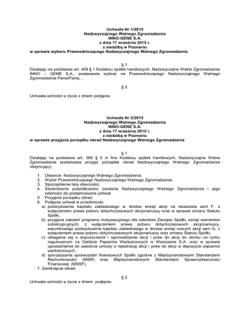 Nadzwyczajne Walne Zgromadzenie Inno-Gene S.A. z siedzibą w Poznaniu („Spółka”), działając na