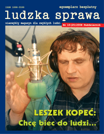 W 4 numerze: Chcę biec do ludzi… Mówi Leszek Kopeć 6 Matczyne rozterki Kobiety w ciąży Gazeta została wydana dzięki wsparciu finansowemu Wydziału Zdrowia UM 7 Niejedna Z jedną piersią po mastektomii Wrocław dziękuje Stulatkom – portret Michaliny Bober-Hawryszczyszyn Drodzy Czytelnicy, z przyjemnością oddajemy w Wasze ręce kolejny numer „Ludzkiej Sprawy”. W tym miesiącu Leszek Kopeć, dziennikarz Polskiego Radia Wrocław, opowiada o tym, jak pokonywać własne słabości, cieszyć się życiem i pomagać innym. W kolejnym odcinku cyklu UWAGA RAK, doktor Wojciech Pietras mówi o nerczaku zarodkowym, na który najczęściej chorują małe dzieci, informuje jednocześnie o objawach, na które rodzice powinni zwracać szczególną uwagę. Przypominamy i ostrzegamy, nowotwory wcześnie wykryte dają szanse na całkowity powrót do zdrowia, nieleczone prowadzą do śmierci. Zapraszamy Państwa do Muzeum Miejskiego we Wrocławiu na premierę nowego kalendarza Amazonek „Niejedna z jedną” oraz wystawę fotografii pod tym samym tytułem. Celem wystawy jest profilaktyka i skuteczna walka z rakiem piersi. W trakcie trwania wystawy zachęcamy do zakupu kalendarzy. Cały dochód przeznaczony zostanie na rehabilitację najmłodszych Amazonek. Wstęp na wystawę jest bezpłatny! Jak co miesiąc, razem z Wrocławiem, dziękujemy naszym Stulatkom, polecamy dobrą lekturę i zapraszamy na spacer po mieście i naszej stronie internetowej www.ludzkasprawa.pl redakcja Redaktor naczelny: Anna Morawiecka Sekretarz redakcji: Monika Filipowska Redaguje zespół Projekt okładki: anief Skład: Jacek Budziszewski Wydawca: Stowarzyszenie NASZE MIASTO WROCŁAW Adres do korespondencji: 50-540 Wrocław, ul. Orzechowa 42/14 tel. 0607 408 416 e-mail: [email protected] www.ludzkasprawa.pl Na okładce: Leszek Kopeć Zdjęcie: Anna Smarzyńska 8 Umysł na… Manowcach 9 Dominika I jej historia 10 Uwaga rak Nerczak zarodkowy 11 Na grzyby… W aromatu pełny las 12 Węże w raju Suszy szympans szarawary Książki dla dorosłych i dla dzieci 13 Aktywny Wrocław Nowy projekt systemowy 14 Wiele dzieci Plusik leci 15 Spacer po Wrocławiu Przedmieście Świdnickie ac Inform a ja Luck Konkurs Lucka: Wszystkich naszych Czytelników zapraszamy do wzięcia udziału w konkursie na najciekawszy pamiętnik. W tym numerze publikujemy rozważania przyszłej mamy i jej refleksje dotyczące traktowania kobiet w ciąży. Autorka otrzyma od nas honorarium i nagrodę ufundowana rzez księgarnię Świata Książki we Wrocławiu. Czekamy na Wasze prace. Nie dłuższe niż sześć tysięcy znaków, prosimy przysyłać na nasz adres mailowy: [email protected], lub na adres do korespondencji: 50-540 Wrocław, ul. Orzechowa 42/14. *** „Ludzką Sprawę” znajdziesz w Dolnośląskim Centrum Informacji Kulturalnej OKiS (Rynek-Ratusz 24), Młodzieżowym Centrum Informacji i Rozwoju (pl. Dominikański 6), w Teatrze Lalek (pl. Teatralny 4) , Wydziale Zdrowia Urzędu Miejskiego (ul. G. Zapolskiej 2/4), w MOPS (ul. Strzegomska 6) i w Urzędzie Pracy (ul. Powstańców Śląskich 98). Ponadto w taksówkach Radio Taxi Serc oraz publicznych i niepublicznych placówkach służby zdrowia. *** Kontakt w sprawie reklam: [email protected] LUDZKA SPRAWA NIEZWYKŁY MAGAZYN DLA ZWYKŁYCH LUDZI 3 Rozmowa miesiąca Chcę biec do ludzi… Z Leszkiem Kopciem rozmawia Anna Morawiecka Anna Morawiecka: Leszek, czy ty coś widzisz? Leszek Kopeć: Poczucie światła. I czubek swojego nosa, na zasadzie punktu. To znaczy, że jak jest ciemno czy jasno, to… Widzę. Nie jest to może wielkie widzenie, ale nie mam tak zwanej ciemności przed oczami. Jak można żyć, nie widząc? Zasadniczo tak samo jak każdy normalny człowiek, możemy mieć tylko trochę więcej trudności do pokonania. Ale żeby być szczerym, to miałem szczęście. Moi rodzice wychowywali mnie nie jak dziecko niewidome, tylko jak dziecko widzące. Nie trzymali mnie w domu pod kluczem. Biegałem tak jak inni chłopcy po podwórku. Musiałem się nauczyć różnych rzeczy, nie miałem taryfy ulgowej. Dlatego też brak wzroku nie jest dla mnie najważniejszy. Pamiętasz czasy, kiedy widziałeś? Hm, wiesz, możemy rozmawiać o kolorach, wiem jak one wyglądają. Miewam też sny kolorowe, a więc muszę te kolory jakoś pamiętać. Ale naprawdę byłem wtedy mały, miałem trzy lata. Pamiętam moment, kiedy zorientowałem się, że stało się coś złego. Odkleiły mi się plastry po zabiegu katarakty i mama zapytała mnie czy wiem, gdzie jesteśmy, odpowiedziałem, że w jakimś pomieszczeniu, a okazało się, że byliśmy zupełnie gdzie indziej. Taki szczegół z tej historii. I jeszcze bardzo kwaśne pomarańcze. Siedziałem w gabinecie lekarskim, wierzgałem nogami i ktoś dał mi pomarańczę. W takim razie o odcieniach zieleni możemy pogadać? (Śmiech), nie ja ci nie powiem, jakie odcienie ma kolor zielony. Mogę jednak powiedzieć czy kolor jest ostry, łagodny, czy neutralny. Więc to jest jedna rzecz, o której nie możemy porozmawiać… gdybyśmy mieli pogadać o rzeźbie – to tak, bo kształty już można dotknąć, a kolory są rzeczą ulotną. Pracujesz w radiu, prowadzisz audycje na żywo, zapala się czerwone światło, znak, że wchodzisz na antenę i Ty to światło widzisz… No nie przesadzaj – słyszę raczej. Jak można słyszeć światło, żartujesz sobie ze mnie. 4 Nie, mamy do czynienia z tak zwaną kompensacją. Inne narządy przejmują funkcje tych, które są uszkodzone. Spróbuję ci to wyjaśnić. Wchodzę do studia, zakładam słuchawki i jak jesteśmy na antenie, to to po prostu słychać. A ja lubię słuchawki. Mam wtedy kontakt z realizatorem, on może mi coś podpowiedzieć… czasem się wygłupiamy. Ja mówię, że spoglądam na zegar w studio i jest dokładnie godzina – w tym czasie realizator podpowiada dwudziesta pierwsza piętnaście, a ja mówię: dwudziesta pierwsza piętnaście… Twoi słuchacze wiedzą, że nie widzisz? Nigdy