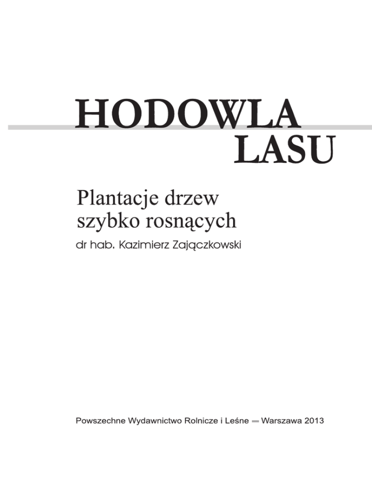 5 TEKST ZYWEJ PAGINY Spis treści 1. Wstęp ............................................................................................................................................................ 7 2. Definicja plantacji ..................................................................................................................................... 10 3. Z historii plantacyjnej uprawy drzew szybko rosnących w Polsce ........................................ 16 4. Rodzaje plantacji drzew szybko rosnących.................................................................................... 25 5. Ogólne zasady zakładania i prowadzenia plantacji o długim i średnim cyklu produkcyjnym ................................................................................................................................................................ 27 5.1. Dobór gatunków do uprawy.......................................................................................................... 5.2. Zasady zmieszania gatunków ....................................................................................................... 5.3. Materiał sadzeniowy........................................................................................................................ 5.3.1. Jakość materiału sadzeniowego a produkcyjność plantacji....................................... 5.3.2. Wymagania dotyczące sadzonek przeznaczonych do zakładania plantacji ........ 5.3.3. Produkcja materiału sadzeniowego ................................................................................. 5.3.3.1. Produkcja sadzonek z nasion ............................................................................... 5.3.3.2. Produkcja sadzonek ze zrzezów zdrewniałych ............................................. 5.3.3.3. Produkcja sadzonek ze zrzezów korzeniowych ........................................... 5.4. Wybór powierzchni pod plantację............................................................................................... 5.4.1. Warunki klimatyczne............................................................................................................. 5.4.2. Ukształtowanie powierzchni ............................................................................................... 5.4.3. Warunki glebowe..................................................................................................................... 5.4.4. Dotychczasowy sposób użytkowania................................................................................ 5.4.5. Występowanie zagrożeń powodowanych przez szkodliwe owady i patogeny grzybowe.................................................................................................................................... 5.5. Zakładanie plantacji......................................................................................................................... 5.5.1. Przygotowanie powierzchni do sadzenia......................................................................... 5.5.2. Wybór i wyznaczenie więźby ............................................................................................. 5.5.3. Sadzenie..................................................................................................................................... 5.6. Pielęgnacja gleby............................................................................................................................... 5.7. Pielęgnowanie drzew ....................................................................................................................... 5.8. Cięcia rozluźniające ......................................................................................................................... 5.9. Ochrona plantacji.............................................................................................................................. 27 29 31 31 39 41 41 45 53 57 57 58 58 60 61 62 62 64 69 71 78 82 84 6 SPIS TREŚCI 6. Uprawa różnych gatunków drzew szybko rosnących w plantacjach o długim i średnim cyklu produkcyjnym ....................................................................................................................... 86 6.1. Topole czarne i balsamiczne oraz ich mieszańce .................................................................... 6.1.1. Przedmiot uprawy .................................................................................................................. 6.1.2. Zakładanie i prowadzenie plantacji................................................................................... 6.1.3. Uprawy topolowo-rolne ........................................................................................................ 6.1.4. Plantacje przedplonowe ........................................................................................................ 6.2. Topola osika oraz jej mieszańce.................................................................................................... 6.2.1. Przedmiot uprawy .................................................................................................................. 6.2.2. Zakładanie i prowadzenie plantacji................................................................................... 6.3. Brzoza brodawkowata...................................................................................................................... 6.3.1. Przedmiot uprawy .................................................................................................................. 6.3.2. Zakładanie i prowadzenie plantacji................................................................................... 6.4. Modrzew europejski ........................................................................................................................ 6.4.1. Przedmiot uprawy .............................................................................................................