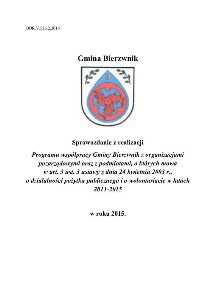 OOR.V.526.2.2016 Gmina Bierzwnik Sprawozdanie z realizacji Programu współpracy Gminy Bierzwnik z organizacjami pozarządowymi oraz z podmiotami, o których mowa w art. 3 ust. 3 ustawy z dnia 24 kwietnia 2003 r., o działalności pożytku publicznego i o wolontariacie w latach 2011-2015 w roku 2015. Wstęp Sprawozdanie z realizacji Programu współpracy Gminy Bierzwnik z organizacjami pozarządowymi oraz z podmiotami, o których mowa w art. 3 ust. 3 ustawy z dnia 24 kwietnia 2003 r., o działalności pożytku publicznego i o wolontariacie w latach 2011-2015 za rok 2015 zostało sporządzone w oparciu o art. 5a ust. 3 ustawy z dnia 24 kwietnia 2003 r. o działalności pożytku publicznego i o wolontariacie (tj. Dz. U. z 2016 r., poz. 239). I Otwarte konkursy ofert Zgodnie z art. 13 ustawy z dnia 24 kwietnia 2003 r. o działalności pożytku publicznego i o wolontariacie oraz §5 ust 2 Programu współpracy Gminy Bierzwnik z organizacjami pozarządowymi oraz z podmiotami, o których mowa w art. 3 ust. 3 ustawy z dnia 24 kwietnia 2003 r., o działalności pożytku publicznego i o wolontariacie w latach 2011-2015 (Uchwała nr XXXIX/267/10 Rady Gminy Bierzwnik z dnia 05 listopada 2010 r.) dnia 10 lutego 2015 r. został ogłoszony konkurs na realizację zadania w sferze działalności pożytku publicznego w zakresie upowszechniania kultury fizycznej w 2015 r. pod nazwą „Upowszechnianie piłki nożnej wśród dzieci i młodzieży w 2015”. Konkurs został ogłoszony Zarządzeniem Nr 10/2015 Wójta Gminy Bierzwnik z dnia 10 lutego 2015 r. w sprawie ogłoszenia otwartego konkursu ofert na realizację zadania publicznego w sferze działalności pożytku publicznego w zakresie wspierania i upowszechniania kultury fizycznej „Upowszechnianie piłki nożnej wśród dzieci i młodzieży w 2015 r.” Na podstawie §5 ust 1 pkt 1 wyżej wymienionego Programu zlecono organizacjom pozarządowym w 2015 r. jedno zadanie publiczne z zakresu upowszechniania kultury fizycznej, na które przeznaczono kwotę 60 000 zł pod nazwą „Upowszechnianie piłki nożnej wśród dzieci i młodzieży w 2015 r.” II Ocena ofert Dnia 04 marca 2015 r. zakończył się termin składania ofert w ramach wyżej wymienionego konkursu. Wpłynęła tylko jedna oferta złożona przez Młodzieżowy Uczniowski Ludowy Klub Sportowy „ORZEŁ” Bierzwnik. Zarządzeniem nr 20/2015 Wójta Gminy Bierzwnik z dnia 06 marca 2015 r. w sprawie powołania Komisji Konkursowej powołana została Komisja w celu rozpatrzenia ofert na realizację zadania w sferze działalności pożytku publicznego. Posiedzenie Komisji w celu oceny oferty odbyło się dnia 10 marca 2015 r., na którym Komisja oceniła pozytywnie ofertę złożoną przez Młodzieżowy Uczniowski Ludowy Klub Sportowy „ORZEŁ” Bierzwnik. Z posiedzenia Komisji został sporządzony protokół, który został zatwierdzony przez Wójta Gminy Bierzwnik. Dnia 13 marca 2015 r. została zawarta umowa nr 2/OOR/2015 o wsparcie realizacji zadania publicznego pod nazwą: „Upowszechnianie piłki nożnej wśród dzieci i młodzieży w 2015 r.” pomiędzy Gminą Bierzwnik a Młodzieżowym Uczniowskim Ludowym Klubem Sportowym „ORZEŁ” Bierzwnik. III Realizacja zadań Na podstawie wyżej wymienionej umowy Młodzieżowy Uczniowski Ludowy Klub Sportowy „ORZEŁ” Bierzwnik zrealizował zadanie „Upowszechnianie piłki nożnej wśród dzieci i młodzieży w 2015 r.” w terminie od 13 marca 2015 r. do dnia 30 listopada 2015 r. Zgodnie z harmonogramem składania sprawozdań, znajdującym się w umowie, MULKS „ORZEŁ” Bierzwnik złożył sprawozdania z realizacji zadania publicznego w terminach: dnia 15 lipca 2015 r. i dnia 30 grudnia 2015 r. Po złożeniu wyżej wymienionych sprawozdań z realizacji zadania publicznego osoba wyznaczona przez Wójta Gminy Bierzwnik dokonała oceny sprawozdania z realizacji zadania publicznego. Oceniono pozytywnie realizację zadania publicznego pod nazwą „Upowszechnianie piłki nożnej wśród dzieci i młodzieży w 2015 r.” zrealizowane przez MULKS „ORZEŁ” Bierzwnik w 2015 r. Wójt Gminy Bierzwnik Adam Błaszczyk Bierzwnik, 30.05.2016 r.
