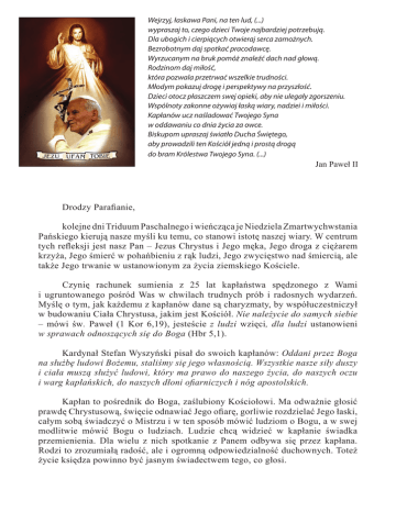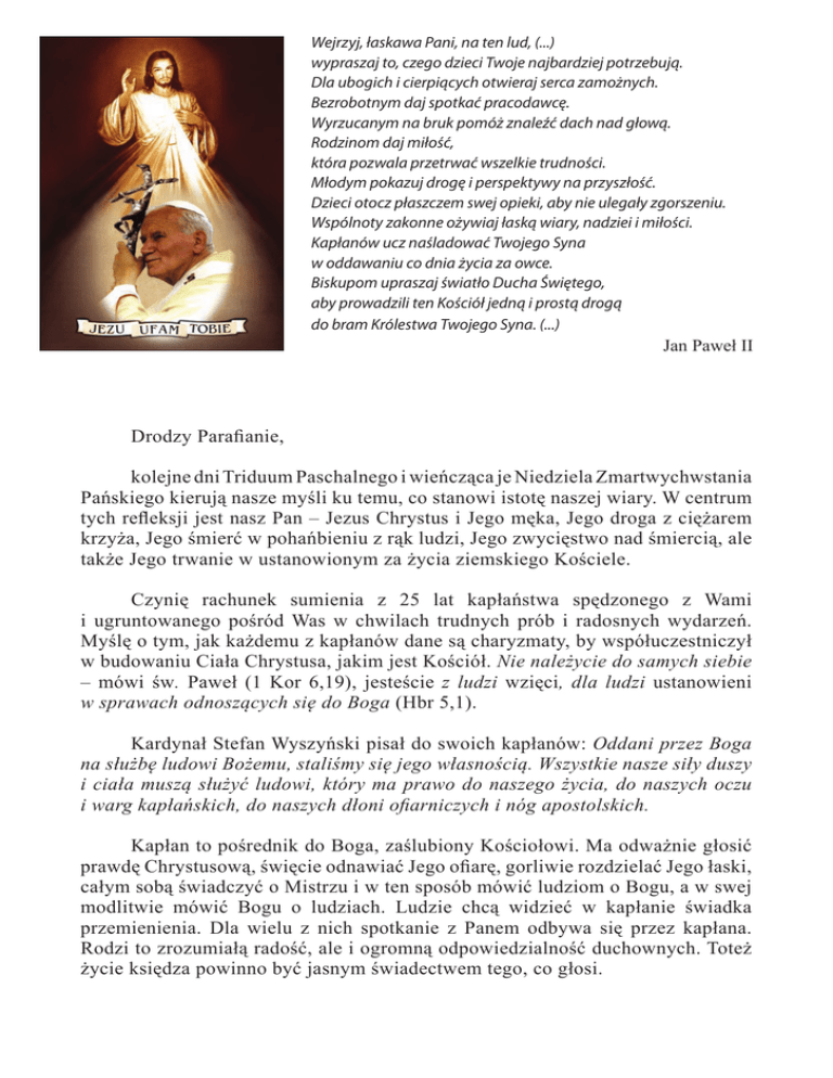 Wejrzyj, łaskawa Pani, na ten lud, (...) wypraszaj to, czego dzieci Twoje najbardziej potrzebują. Dla ubogich i cierpiących otwieraj serca zamożnych. Bezrobotnym daj spotkać pracodawcę. Wyrzucanym na bruk pomóż znaleźć dach nad głową. Rodzinom daj miłość, która pozwala przetrwać wszelkie trudności. Młodym pokazuj drogę i perspektywy na przyszłość. Dzieci otocz płaszczem swej opieki, aby nie ulegały zgorszeniu. Wspólnoty zakonne ożywiaj łaską wiary, nadziei i miłości. Kapłanów ucz naśladować Twojego Syna w oddawaniu co dnia życia za owce. Biskupom upraszaj światło Ducha Świętego, aby prowadzili ten Kościół jedną i prostą drogą do bram Królestwa Twojego Syna. (...) Jan Paweł II Drodzy Parafianie, kolejne dni Triduum Paschalnego i wieńcząca je Niedziela Zmartwychwstania Pańskiego kierują nasze myśli ku temu, co stanowi istotę naszej wiary. W centrum tych refleksji jest nasz Pan – Jezus Chrystus i Jego męka, Jego droga z ciężarem krzyża, Jego śmierć w pohańbieniu z rąk ludzi, Jego zwycięstwo nad śmiercią, ale także Jego trwanie w ustanowionym za życia ziemskiego Kościele. Czynię rachunek sumienia z 25 lat kapłaństwa spędzonego z Wami i ugruntowanego pośród Was w chwilach trudnych prób i radosnych wydarzeń. Myślę o tym, jak każdemu z kapłanów dane są charyzmaty, by współuczestniczył w budowaniu Ciała Chrystusa, jakim jest Kościół. Nie należycie do samych siebie – mówi św. Paweł (1 Kor 6,19), jesteście z ludzi wzięci, dla ludzi ustanowieni w sprawach odnoszących się do Boga (Hbr 5,1). Kardynał Stefan Wyszyński pisał do swoich kapłanów: Oddani przez Boga na służbę ludowi Bożemu, staliśmy się jego własnością. Wszystkie nasze siły duszy i ciała muszą służyć ludowi, który ma prawo do naszego życia, do naszych oczu i warg kapłańskich, do naszych dłoni ofiarniczych i nóg apostolskich. Kapłan to pośrednik do Boga, zaślubiony Kościołowi. Ma odważnie głosić prawdę Chrystusową, święcie odnawiać Jego ofiarę, gorliwie rozdzielać Jego łaski, całym sobą świadczyć o Mistrzu i w ten sposób mówić ludziom o Bogu, a w swej modlitwie mówić Bogu o ludziach. Ludzie chcą widzieć w kapłanie świadka przemienienia. Dla wielu z nich spotkanie z Panem odbywa się przez kapłana. Rodzi to zrozumiałą radość, ale i ogromną odpowiedzialność duchownych. Toteż życie księdza powinno być jasnym świadectwem tego, co głosi. On sam ma stać się widocznym obrazem Chrystusa; swoimi słowami, obecnością, zachowaniem, wręcz umieraniem dla siebie samego ma czynić Chrystusa „widzialnym”. Jego celem jest prowadzenie ludzi do Boga. Przypomina zatem postać Mojżesza modlącego się na górze Nebo ze wzniesionymi rękami, żeby wstawiać się za ludem i sprawić, by zstąpiła na ten lud rosa łaski sakramentalnej. Kapłaństwo sakramentalne, służebne wymaga szczególnego zaangażowania wszystkich sił duszy i ciała, by ukazywać, że przeznaczeniem człowieka jest gromadzenie dóbr cenniejszych niż ziemskie, to znaczy wartości, dzięki którym osoba ludzka staje się pełniejsza i wchodzi w harmonię życia ze Stwórcą. Imperatyw bycia pasterzem według serca Chrystusa sprawia, że kapłan odczuwa rozdźwięk między własną ludzką słabością a swoim posłannictwem, które łączy go z Chrystusem. Francuski pisarz F. Mauriac określał księdza jako punkt styczny wszechmocy Stworzyciela i nędzy stworzenia w jednym i w tym samym człowieku. To rozdarcie między światem, do którego należy jako człowiek, a Królestwem Niebieskim, do którego należy z racji swego powołania, jest istotą swoistego dramatu księży. Są oni „ludźmi między Bogiem a ludźmi” – mówiąc do Boga, muszą być po stronie ludzi, a mówiąc do ludzi, muszą być po stronie Boga. Życie między niebem a ziemią to nie jest sytuacja towarzyska, a celibat stanowi tylko zewnętrzny znak tej inności, a zarazem samotności, jaką wybiera każdy ksiądz. To wiąże się z noszeniem „skarbu w glinianym naczyniu” przy ustawicznym wsparciu Chrystusa, który jest razem z nami w łodzi (Mt 8, 23‑27) i w drodze do Emaus (Łk 24, 13‑35), bo wierny jest Bóg, który powołał nas (1Kor, 8‑9). W Kościele polskim kapłani zawsze dzielili losy narodu podczas największych prób dziejowych: w powstańczych zmaganiach i w śmiertelnej grozie codzienności wojennych. Liczby podawane w dokumentach historycznych wskazują na olbrzymie straty poniesione przez duchowieństwo polskie w więzieniach, obozach koncentracyjnych, na zesłaniu. To była jedna z „nocy” Kościoła. Z pewnością piękniej jest myśleć o przynależności do Kościoła „dnia”, a więc wolnego, bezpiecznego i triumfującego na ziemi. Znacznie trudniejsze jest trwanie w Kościele przechodzącym swoją „noc”, w Kościele, który musi walczyć o świętość i godność, stać po stronie bezsilnych i prześladowanych, a gdy trzeba, potrafi pójść drogą dźwigającego krzyż Jezusa, nieść na sobie Jego „hańbę” gorszącą silnych i mądrych tego świata. Już tak bywało w historii, że podnosiły się głosy kwestionujące prymat Boga w życiu i działalności księży. Wzbudzano wątpliwości co do prawdziwej natury kapłaństwa, która od wieków wyraża się w zjednoczeniu z Bogiem, w umiłowaniu Krzyża Chrystusowego, w duchu modlitwy, w ofierze i czujnej czystości, w całkowitym oddaniu służbie bliźniemu. A Kościół jest jeden, święty, powszechny i apostolski. W taki wierzymy. Wiarę w taki Kościół wyznajemy w „Credo”. Powołany przez Chrystusa dla grzeszników. Zdumiewający jest w Polsce prowadzony w mediach atak na Kościół – dyskredytowanie roli i działalności kapłanów, dążenie do oderwania ich od Kościoła, z którym związali sakramentalnie swoją tożsamość. Ciekawe, że kiedy Amerykanin kocha swoją ojczyznę i wierzy w Boga, to jest szanowany w swym k