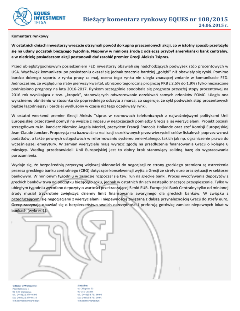 Bieżący komentarz rynkowy EQUES nr 108/2015 24.06.2015 r. Komentarz rynkowy W ostatnich dniach inwestorzy wreszcie otrzymali powód do kupna przecenionych akcji, co w istotny sposób przełożyło się na udany początek bieżącego tygodnia. Najpierw w minioną środę z odsieczą przybył amerykański bank centralny, a w niedzielę posiadaczom akcji postanowił dać zarobić premier Grecji Aleksis Tsipras. Przed ubiegłotygodniowym posiedzeniem FED inwestorzy obawiali się nadchodzących podwyżek stóp procentowych w USA. Wydźwięk komunikatu po posiedzeniu okazał się jednak znacznie bardziej „gołębi” niż obawiały się rynki. Pomimo bardzo dobrego raportu z rynku pracy za maj, ocena tego rynku nie uległa znaczącej zmianie w komunikacie FED. Jednocześnie, ze względu na słaby pierwszy kwartał, obniżono tegoroczną prognozę PKB z 2,5% do 1,9% i tylko nieznacznie podniesiono prognozy na lata 2016-2017. Rynkom szczególnie spodobała się prognoza przyszłej stopy procentowej na 2016 rok wynikająca z tzw. „kropek”, stanowiących odwzorowanie oczekiwań samych członków FOMC. Uległa ona wyraźnemu obniżeniu w stosunku do poprzedniego odczytu z marca, co sugeruje, że cykl podwyżek stóp procentowych będzie łagodniejszy i bardziej wydłużony w czasie niż tego oczekiwały rynki. W ostatni weekend premier Grecji Aleksis Tsipras w rozmowach telefonicznych z najważniejszymi politykami Unii Europejskiej przedstawił pomysł na wyjście z impasu w negocjacjach pomiędzy Grecją a jej wierzycielami. Projekt poznali szczegółowo m.in. kanclerz Niemiec Angela Merkel, prezydent Francji Francois Hollande oraz szef Komisji Europejskiej Jean-Claude Juncker. Propozycja ma bazować na realizacji oczekiwanych przez wierzycieli celów fiskalnych poprzez wzrost podatków, a także pewnych ustępstwach w reformowaniu systemu emerytalnego, takich jak np. ograniczenie prawa do wcześniejszej emerytury. W zamian wierzyciele mają wyrazić zgodę na przedłużenie finansowania Grecji o kolejne 6 miesięcy. Według przedstawicieli Unii Europejskiej jest to dobry krok stanowiący solidną bazę do wypracowania porozumienia. Wydaje się, że bezpośrednią przyczyną większej skłonności do negocjacji ze strony greckiego premiera są ostrzeżenia prezesa greckiego banku centralnego (CBG) dotyczące konsekwencji wyjścia Grecji ze strefy euro oraz sytuacji w sektorze bankowym. W minionym tygodniu w zasadzie rozpoczął się tzw. run na greckie banki. Proces wycofywania depozytów z greckich banków trwa od początku bieżącego roku, jednak w ostatnich dniach nastąpiło znaczące przyspieszenie. Tylko w ubiegłym tygodniu wycofano depozyty o wartości przekraczającej 5 mld EUR. Europejski Bank Centralny tylko od minionej środy musiał trzykrotnie zwiększyć dzienny limit finansowania awaryjnego dla greckich banków. W związku z przedłużającymi się negocjacjami z wierzycielami i niepewnością związaną z dalszą przynależnością Grecji do strefy euro, Grecy zaczynają obawiać się o bezpieczeństwo swoich oszczędności i preferują gotówkę zamiast niepewnych lokat w bankach (wykres 1). Oddział w Warszawie: Plac Bankowy 1 00-139 Warszawa tel.: (+48) 22 379 46 00 fax: (+48) 22 379 46 10 e-mail: [email protected] Siedziba: ul. Chłopska 53 80-350 Gdańsk tel.: (+48) 58 761 00 00 fax: (+48) 58 761 00 01 e-mail: [email protected] Bieżący komentarz rynkowy EQUES nr 108/2015 24.06.2015 r. Wykres 1: Wartość depozytów niefinansowego sektora prywatnego w greckich bankach ogółem (jasnoniebieska linia, lewa skala) oraz wartość banknotów w obiegu w Grecji (ciemnoniebieska linia, prawa skala). Źródło: CBG, ECB, Barclays Research. Wydźwięk ubiegłotygodniowego posiedzenia FED jest pozytywny dla rynków akcji, szczególnie dla rynków wschodzących. Z kolei ewentualne porozumienie Grecji z wierzycielami zdjęłoby największy obecnie czynnik ryzyka, jaki muszą brać pod uwagę inwestorzy przy podejmowaniu swoich decyzji. Opublikowane na początku bieżącego tygodnia wskaźniki PMI dla strefy euro potwierdzają, że gospodarka europejska ma się dobrze, a ożywienie jest kontynuowane. Dodatkowe wsparcie ze strony ECB, które jest realizowane od marca, może w tej materii tylko pomóc. Choć po ostatniej propozycji premiera Tsiprasa wydaje się, że strony są coraz bliżej porozumienia, to jednak wciąż jest wiele niewiadomych, np. jeśli porozumienie zostanie wynegocjowane, to musi zostać następnie zatwierdzone przez grecki parlament. Tymczasem już niedzielna propozycja premiera Tsiprasa, będąca solidnym krokiem w stronę zawarcia kompromisu, budzi wyraźne niezadowolenie w szeregach rządzącej partii Syriza. Niezależnie od tego wydaje się, że po majowo-czerwcowych spadkach, ceny akcji na giełdzie warszawskiej znalazły się na takich poziomach, przy których relacja potencjalnego zysku do ryzyka jest dość korzystna. Inwestycja w polskie akcje przy obecnych cenach oraz przy założeniu, że Grecja osiągnie porozumienie z wierzycielami, powinna naszym zdaniem przynieść solidną stopę zwrotu w horyzoncie najbliższych 2-3 miesięcy. Oddział w Warszawie: Plac Bankowy 1 00-139 Warszawa tel.: (+48) 22 379 46 00 fax: (+48) 22 379 46 10 e-mail: [email protected] Siedziba: ul. Chłopska 53 80-350 Gdańsk tel.: (+48) 58 761 00 00 fax: (+48) 58 761 00 01 e-mail: [email protected] Bieżący komentarz rynkowy EQUES nr 108/2015 24.06.2015 r. Stopy zwrotu subfunduszy EQUES SFIO w okresie od 20.03.2015 do 22.06.2015. Źródło: Obliczenia własne EQUES Investment TFI SA Niniejszy materiał ma charakter wyłącznie informacyjny i promocyjny, w żadnym zatem wypadku nie może być traktowany jako oferta w rozumieniu art. 66 ustawy z dnia 23 kwietnia 1964 roku Kodeks cywilny (Dz. U. Nr 16, poz. 93 z późn. zm.). Materiał ten nie stanowi także usługi doradztwa finansowego czy inwestycyjnego oraz udzielania rekomendacji dotyczących instrumentów finansowych lu
