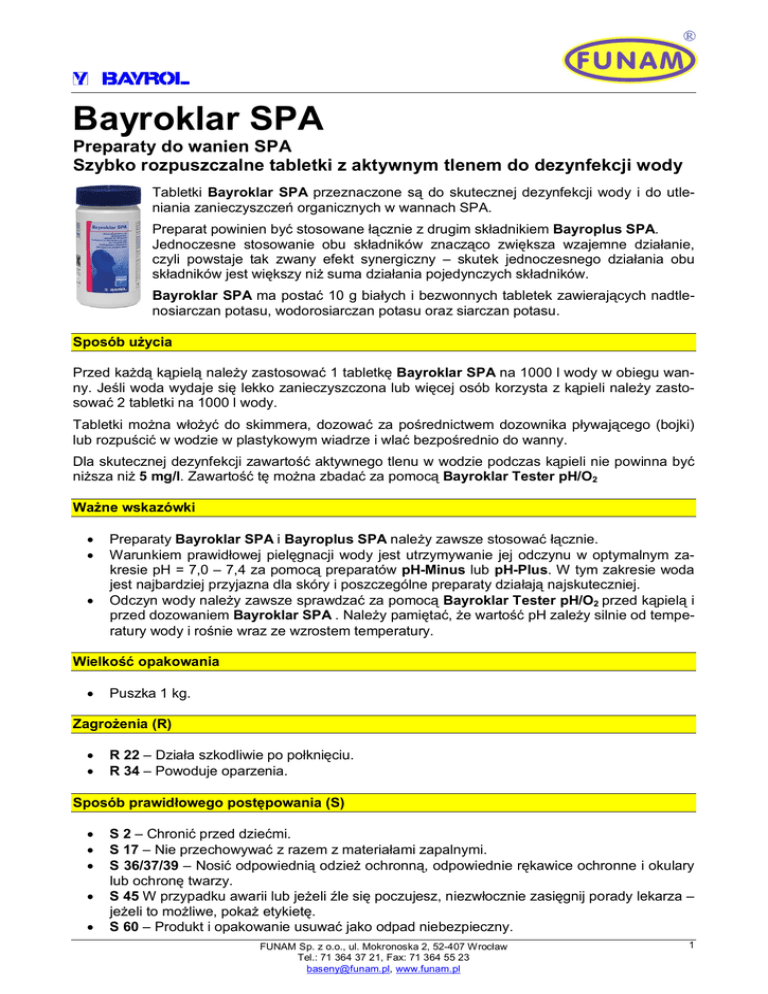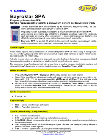 Bayroklar SPA Preparaty do wanien SPA Szybko rozpuszczalne tabletki z aktywnym tlenem do dezynfekcji wody Tabletki Bayroklar SPA przeznaczone są do skutecznej dezynfekcji wody i do utleniania zanieczyszczeń organicznych w wannach SPA. Preparat powinien być stosowane łącznie z drugim składnikiem Bayroplus SPA. Jednoczesne stosowanie obu składników znacząco zwiększa wzajemne działanie, czyli powstaje tak zwany efekt synergiczny – skutek jednoczesnego działania obu składników jest większy niż suma działania pojedynczych składników. Bayroklar SPA ma postać 10 g białych i bezwonnych tabletek zawierających nadtlenosiarczan potasu, wodorosiarczan potasu oraz siarczan potasu. Sposób użycia Przed każdą kąpielą należy zastosować 1 tabletkę Bayroklar SPA na 1000 l wody w obiegu wanny. Jeśli woda wydaje się lekko zanieczyszczona lub więcej osób korzysta z kąpieli należy zastosować 2 tabletki na 1000 l wody. Tabletki można włożyć do skimmera, dozować za pośrednictwem dozownika pływającego (bojki) lub rozpuścić w wodzie w plastykowym wiadrze i wlać bezpośrednio do wanny. Dla skutecznej dezynfekcji zawartość aktywnego tlenu w wodzie podczas kąpieli nie powinna być niższa niż 5 mg/l. Zawartość tę można zbadać za pomocą Bayroklar Tester pH/O2 Ważne wskazówki Preparaty Bayroklar SPA i Bayroplus SPA należy zawsze stosować łącznie. Warunkiem prawidłowej pielęgnacji wody jest utrzymywanie jej odczynu w optymalnym zakresie pH = 7,0 – 7,4 za pomocą preparatów pH-Minus lub pH-Plus. W tym zakresie woda jest najbardziej przyjazna dla skóry i poszczególne preparaty działają najskuteczniej. Odczyn wody należy zawsze sprawdzać za pomocą Bayroklar Tester pH/O2 przed kąpielą i przed dozowaniem Bayroklar SPA . Należy pamiętać, że wartość pH zależy silnie od temperatury wody i rośnie wraz ze wzrostem temperatury. Wielkość opakowania Puszka 1 kg. Zagrożenia (R) R 22 – Działa szkodliwie po połknięciu. R 34 – Powoduje oparzenia. Sposób prawidłowego postępowania (S) S 2 – Chronić przed dziećmi. S 17 – Nie przechowywać z razem z materiałami zapalnymi. S 36/37/39 – Nosić odpowiednią odzież ochronną, odpowiednie rękawice ochronne i okulary lub ochronę twarzy. S 45 W przypadku awarii lub jeżeli źle się poczujesz, niezwłocznie zasięgnij porady lekarza – jeżeli to możliwe, pokaż etykietę. S 60 – Produkt i opakowanie usuwać jako odpad niebezpieczny. FUNAM Sp. z o.o., ul. Mokronoska 2, 52-407 Wrocław Tel.: 71 364 37 21, Fax: 71 364 55 23 [email protected], www.funam.pl 1 Postępowanie w przypadku pożaru Zalecane środki gaśnicze - preparat niepalny, lecz może potęgować spalanie (substancja utleniająca). Środki gaśnicze odpowiednie do materiałów magazynowanych w bezpośrednim sąsiedztwie. Nieodpowiednie środki gaśnicze - nie określa się. Szczególne zagrożenia ze strony produktów spalania i wydzielających się gazów podczas pożaru w strefie wysokiej temperatury produkt wydziela tlen potęgujący pożar. W strefie wysokiej temperatury powstają tlenki siarki z rozkładu preparatu. Wdychanie produktów rozkładu może powodować poważne skutki zdrowotne. Specjalne wyposażenie ochronne strażaków - wyposażenie strażaków dostosować do lokalnych warunków akcji gaśniczej, zalecane jest pełne wyposażenie bojowe z aparatami oddechowymi. Inne informacje - sąsiednie pojemniki chłodzić wodą. W przypadku wydzielania się substancji z rozkładu preparatu pokrywać uciekające opary mgiełką wodną. FUNAM Sp. z o.o., ul. Mokronoska 2, 52-407 Wrocław Tel.: 71 364 37 21, Fax: 71 364 55 23 [email protected], www.funam.pl 2