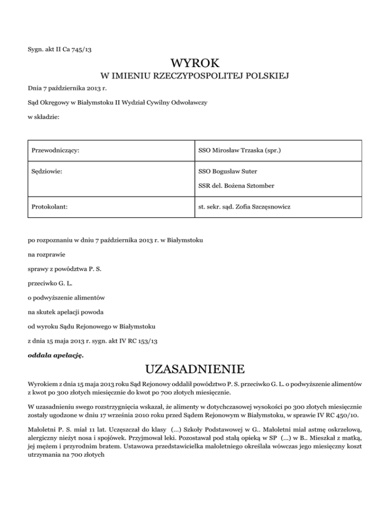 Sygn. akt II Ca 745/13 WYROK W IMIENIU RZECZYPOSPOLITEJ POLSKIEJ Dnia 7 października 2013 r. Sąd Okręgowy w Białymstoku II Wydział Cywilny Odwoławczy w składzie: Przewodniczący: SSO Mirosław Trzaska (spr.) Sędziowie: SSO Bogusław Suter SSR del. Bożena Sztomber Protokolant: st. sekr. sąd. Zofia Szczęsnowicz po rozpoznaniu w dniu 7 października 2013 r. w Białymstoku na rozprawie sprawy z powództwa P. S. przeciwko G. L. o podwyższenie alimentów na skutek apelacji powoda od wyroku Sądu Rejonowego w Białymstoku z dnia 15 maja 2013 r. sygn. akt IV RC 153/13 oddala apelację. UZASADNIENIE Wyrokiem z dnia 15 maja 2013 roku Sąd Rejonowy oddalił powództwo P. S. przeciwko G. L. o podwyższenie alimentów z kwot po 300 złotych miesięcznie do kwot po 700 złotych miesięcznie. W uzasadnieniu swego rozstrzygnięcia wskazał, że alimenty w dotychczasowej wysokości po 300 złotych miesięcznie zostały ugodzone w dniu 17 września 2010 roku przed Sądem Rejonowym w Białymstoku, w sprawie IV RC 450/10. Małoletni P. S. miał 11 lat. Uczęszczał do klasy (...) Szkoły Podstawowej w G.. Małoletni miał astmę oskrzelową, alergiczny nieżyt nosa i spojówek. Przyjmował leki. Pozostawał pod stałą opieką w SP (...) w B.. Mieszkał z matką, jej mężem i przyrodnim bratem. Ustawowa przedstawicielka małoletniego określała wówczas jego miesięczny koszt utrzymania na 700 złotych M. S. miała wówczas prawie 34 lata. Prowadziła jednoosobową działalność gospodarczą, biuro kredytowe. Pozostawała w związku małżeńskim. Ze związku tego narodził się (...) syn Ł. S.. Mąż ustawowej przedstawicielki nie pracował, pomagał jej w opiece nad dzieckiem. M. S. pobierała zasiłki rodzinne: na rzecz małoletniego P. 91 zł miesięcznie i na rzecz Ł. 68 zł miesięcznie. Była wraz z rodzicami współwłaścicielką domu. Posiadała mieszkanie, 3 samochody (dwa zarejestrowane na firmę i jeden prywatny). Zaciągnęła kredyt hipoteczny na ok. 1 miliona zł na zakup samochodów, na mieszkanie, oraz wydatki związane z prowadzoną działalnością. Pozwany G. L. miał 37 lat, z zawodu był ślusarzem spawaczem. Pracował dorywczo, zarabiał 200 – 300 złotych Od 11 lat nie miał stałej pracy. Miał „wykręconą” nogę, problemy z poruszaniem się. Leczył się samodzielnie, ponieważ nie był ubezpieczony. Nadużywał alkoholu, przebywał trzy razy w Szpitalu w C.. W toku sprawy o podwyższenie alimentów twierdził, że nie spożywa już alkoholu, nie miał na to środków. Mieszkał w mieszkaniu komunalnym na obrzeżach C., płacił za nie w zależności od zarobionych pieniędzy ok. 150 zł. Swój miesięczny koszt utrzymania określił na 400 zł. Pomagał mu cioteczny brat, przywoził mu żywność. Pozwany otrzymywał pomoc finansową z opieki społecznej 60 zł miesięcznie. Nie posiadał majątku. Nie płacił alimentów zasądzonych przez Sąd Okręgowy na rzecz małoletniego. W sprawie pozwanego toczyło się kilka postępowań karnych o przestępstwo niealimentacji. Z dniem 23 maja 2000 roku Komornik Sądowy Rewiru III przy Sadzie Rejonowym w Białymstoku złożył doniesienie o popełnieniu przestępstwa uchylania się przez niego od obowiązku alimentacyjnego (k. 5 akt RSC 1416/10 - Ds. 239/11). Postanowieniem z dnia 26 kwietnia 2001 roku Sądu Rejonowego w Białymstoku, w sprawie III K 855/01 umorzono warunkowo postępowanie karne wobec G. L. na okres 2 lat, zobowiązano go jednocześnie do wykonania ciążącego na nim obowiązku łożenia na utrzymanie małoletniego P. S. (wówczas L.) – k. 10 akt RSC 1416/10 - Ds. 239/11. Wobec uchylania się pozwanego od obowiązku alimentacji, ustawowa przedstawicielka małoletniego M. S. w dniu 5 października 2010 roku złożyła kolejne zawiadomienie o popełnieniu przestępstwa. Ostatecznie postanowieniem Prokuratury Rejonowej B. Północ w B. z dnia 3 marca 2011 roku, w sprawie (...) - Ds. 239/11 umorzono dochodzenie (postanowienie, k. 57 akt RSC 1416/10 - Ds. 239/11). W wyniku dalszej niealimentacji, Miejski Ośrodek Pomocy Rodzinie w B. dnia 21 lipca 2011 roku złożył wniosek o wszczęcie i przeprowadzenie postępowania w sprawie popełnienia przez pozwanego przestępstwa określonego w art. 209 § 1 k.k., tj. uporczywego uchylanie się od obowiązku łożenia na rzecz małoletniego alimentów. Postanowieniem z dnia 31 sierpnia 2011 roku, w sprawie (...) - Ds. 2091/11 odmówiono wszczęcia dochodzenia (postanowienie, k. 14 akt RSC 1228/11 - Ds. 2091/11). Obecnie małoletni powód P. S. ma 13 lat. Jest uczniem klasy I Gimnazjum Sportowego (...) w B.. W dalszym ciągu znajduje się pod stała kontrolą alergologa w (...) w B.. Ponadto pozostaje pod opieką poradni kardiologicznej (...). Korzysta w tym zakresie z ubezpieczenia społecznego. Mieszka z ustawową przedstawicielką i młodszym bratem. Ostatecznie, ustawowa przedstawicielka określiła koszt utrzymania syna na kwotę ok. 1.200 złotych miesięcznie. Na koszt utrzymania małoletniego składają się następujące wydatki: wyżywienie ok. 400 złotych miesięcznie, obiad szkole 50 – 60 złotych miesięcznie, bilet MPK 40 złotych, basen w szkole/dodatkowe zajęcia ok. 60 złotych miesięcznie, leczenie alergologiczne ok. 100 – 150 złotych, odzież/obuwie ok. 300 złotych, podręcznik do szkoły ok. 700 złotych rocznie, wydatki szkolne, telefon 70 złotych miesięcznie. Obecnie ustawowa przedstawicielka małoletniego kupuje mu używaną odzież. M. S. ma obecnie 36 lat. W dalszym ciągu prowadzi jednoosobową działalność gospodarczą. Przynosi ona straty, w 2012 roku ok. 6.820 złotych. Wyrokiem Sądu Okręgowego w Białymstoku z dnia 26 lipca 2012 roku, w sprawie I C 445/12 rozwiązano jej związek małżeński z W. S.. Kosztami utrzymania małoletniego syna stron Ł. obciążono oboje rodziców, z tym że zasądzono od ojca na jego rzecz alimenty w kwocie po 500 złotych miesięcznie (wyrok, k. 102 – 103 akt Sądu Okręgowego w Bia